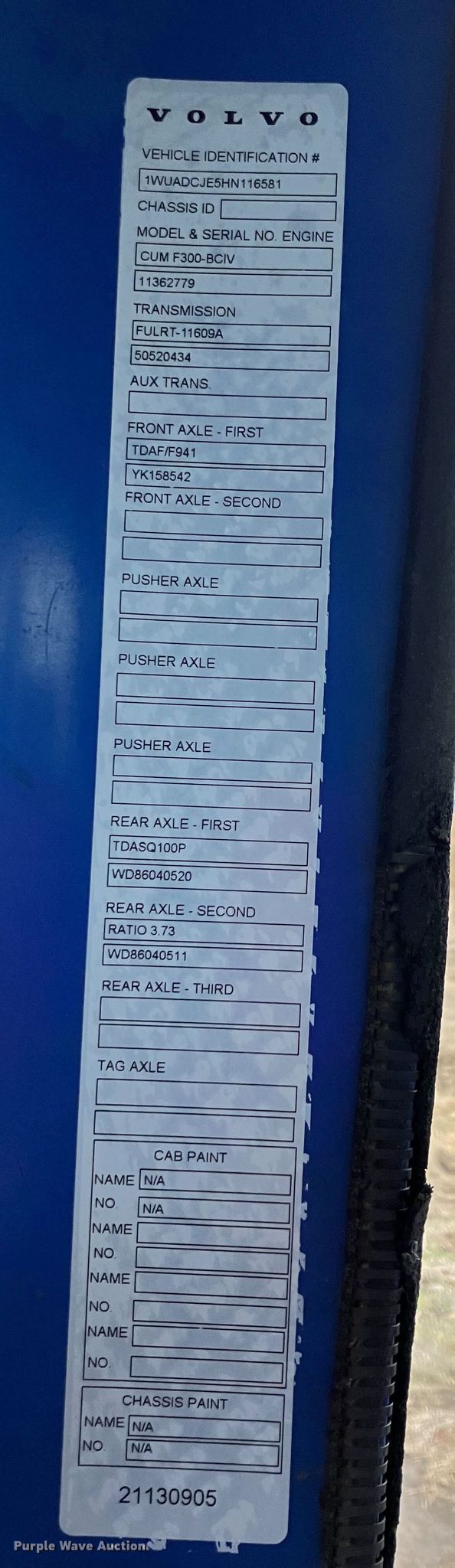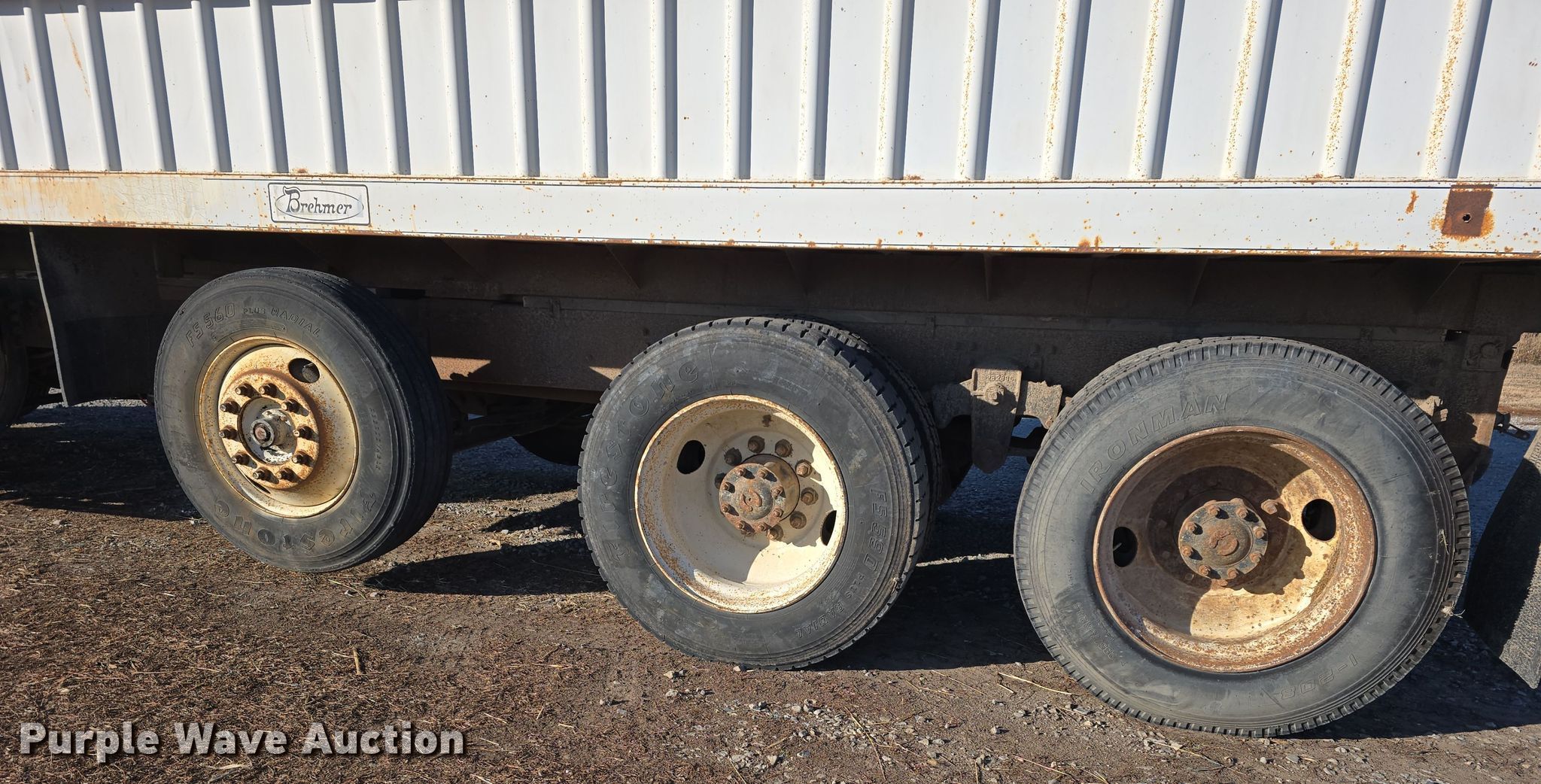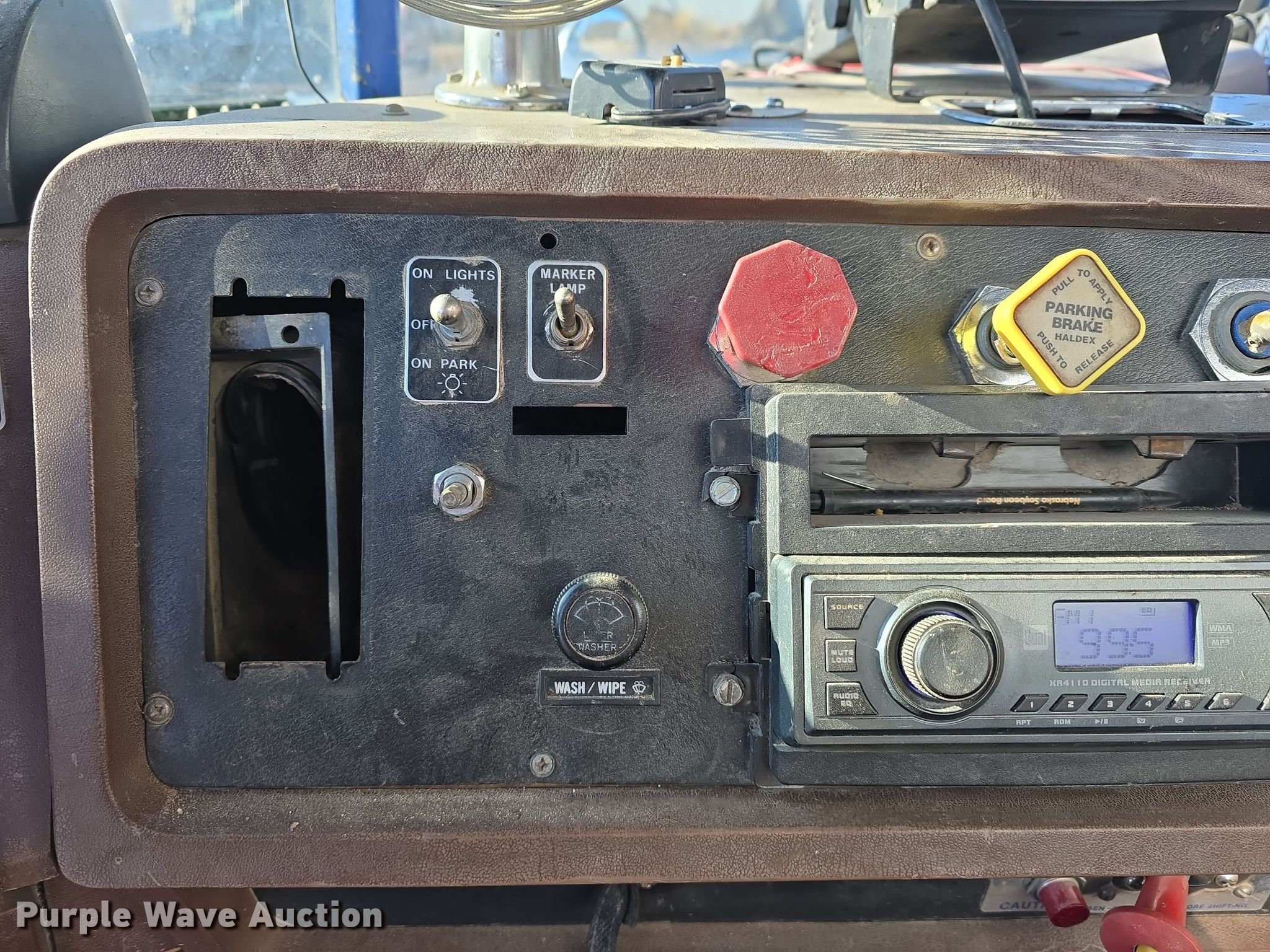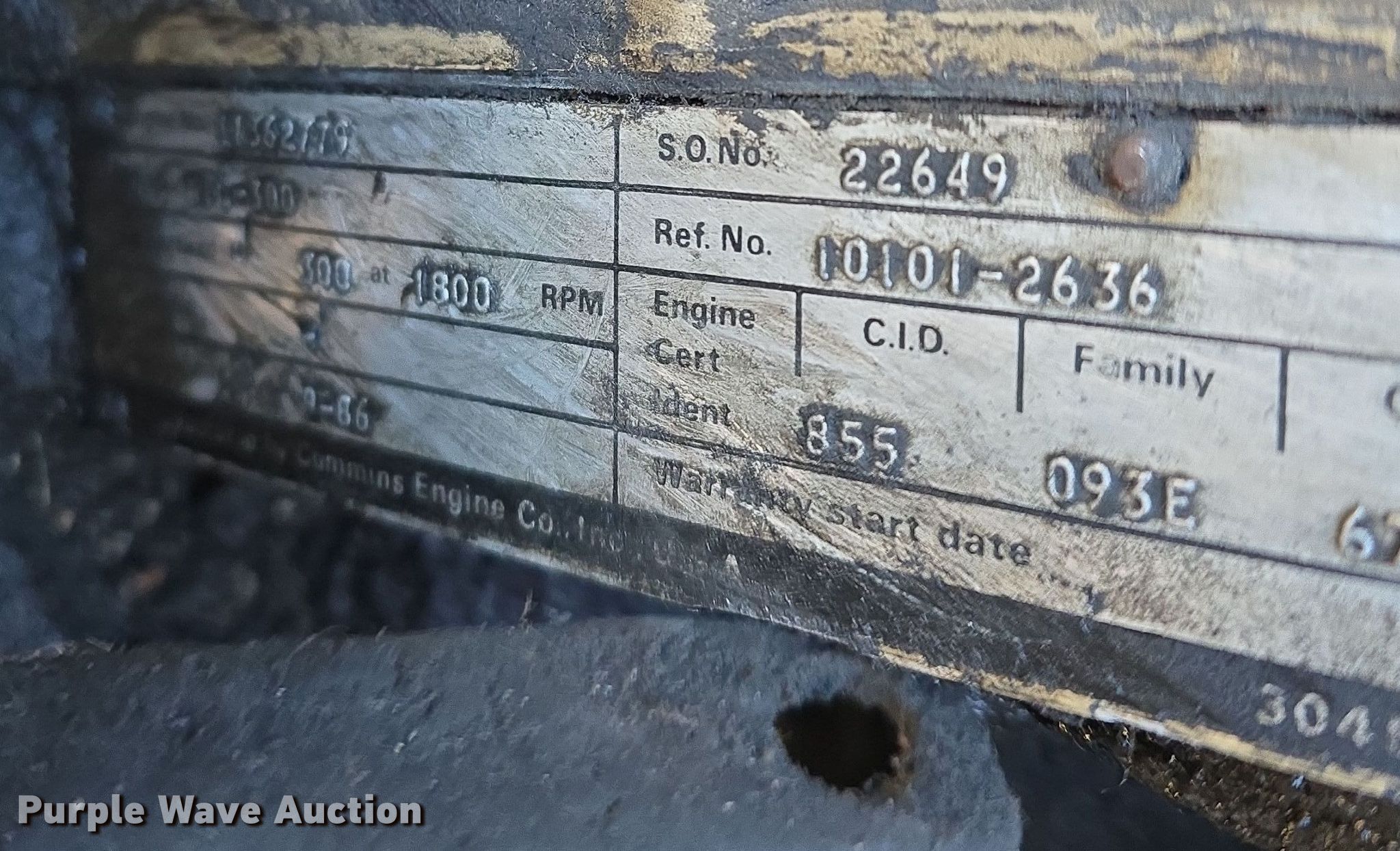 1987 White GMC grain truck. Miles: 163,779 on odometer, VIN: 1WUADCJE5HN116581. Engine Cummins F300-BCIV, Serial: 11362779, Displacement: 855 C.I.D., Cylinders: 6, Fuel type: Diesel. Transmission Eaton Fuller RT-11609A, Manual. Chassis Axles: Triple, Pusher axle, Suspension: Spring, Brakes: Air, PTO, Wheelbase: 250". Interior Heat, Heated mirrors, Brake controller. Features Dump bed Brehmer, 20' L x 96" W, Side height: 60", Bed type: Steel, Roll tarp, Ram: Dual, End gate: Manual. Tires Front: 11R24.5, Rear: 285/75R24.5, Lift axle: 295/75R22.5. Notes Windshield chipped or cracked. Nebraska title. Bear Creek Farms. Bruning, NE 68322