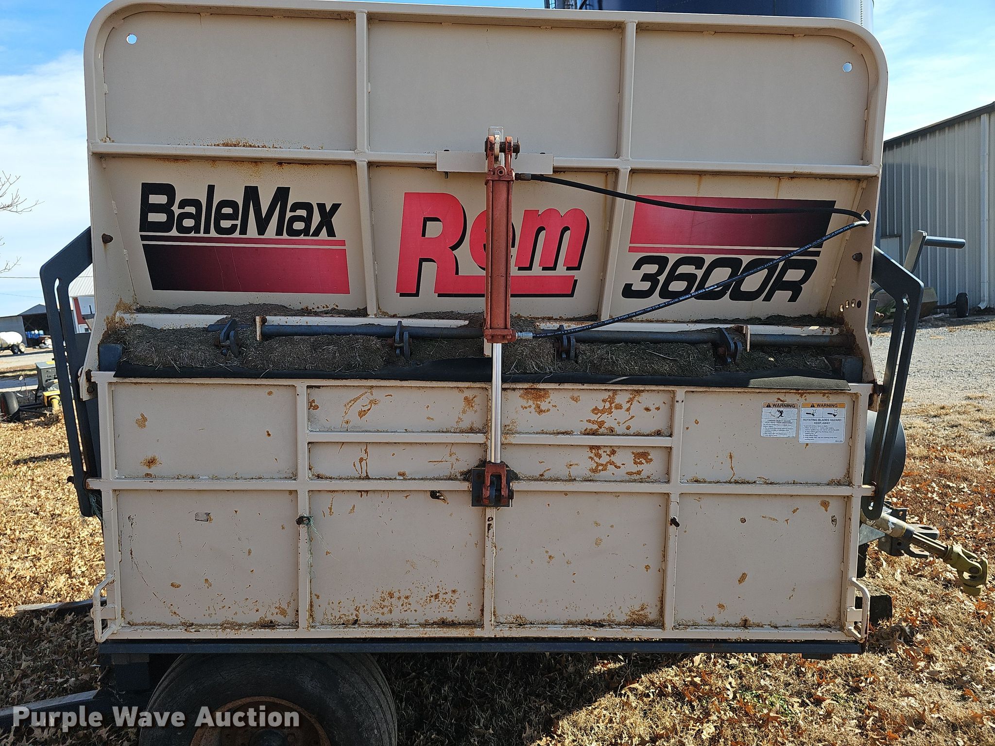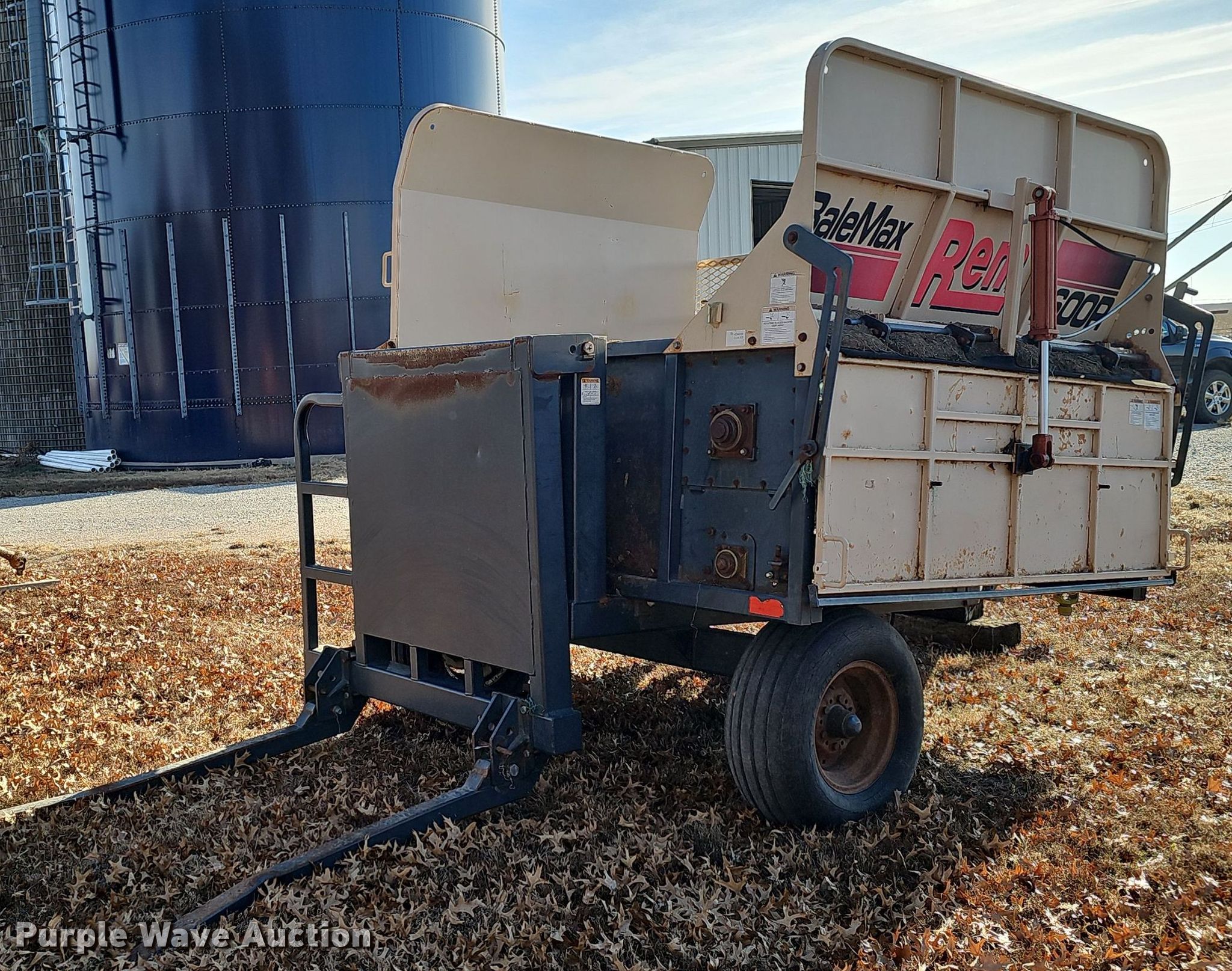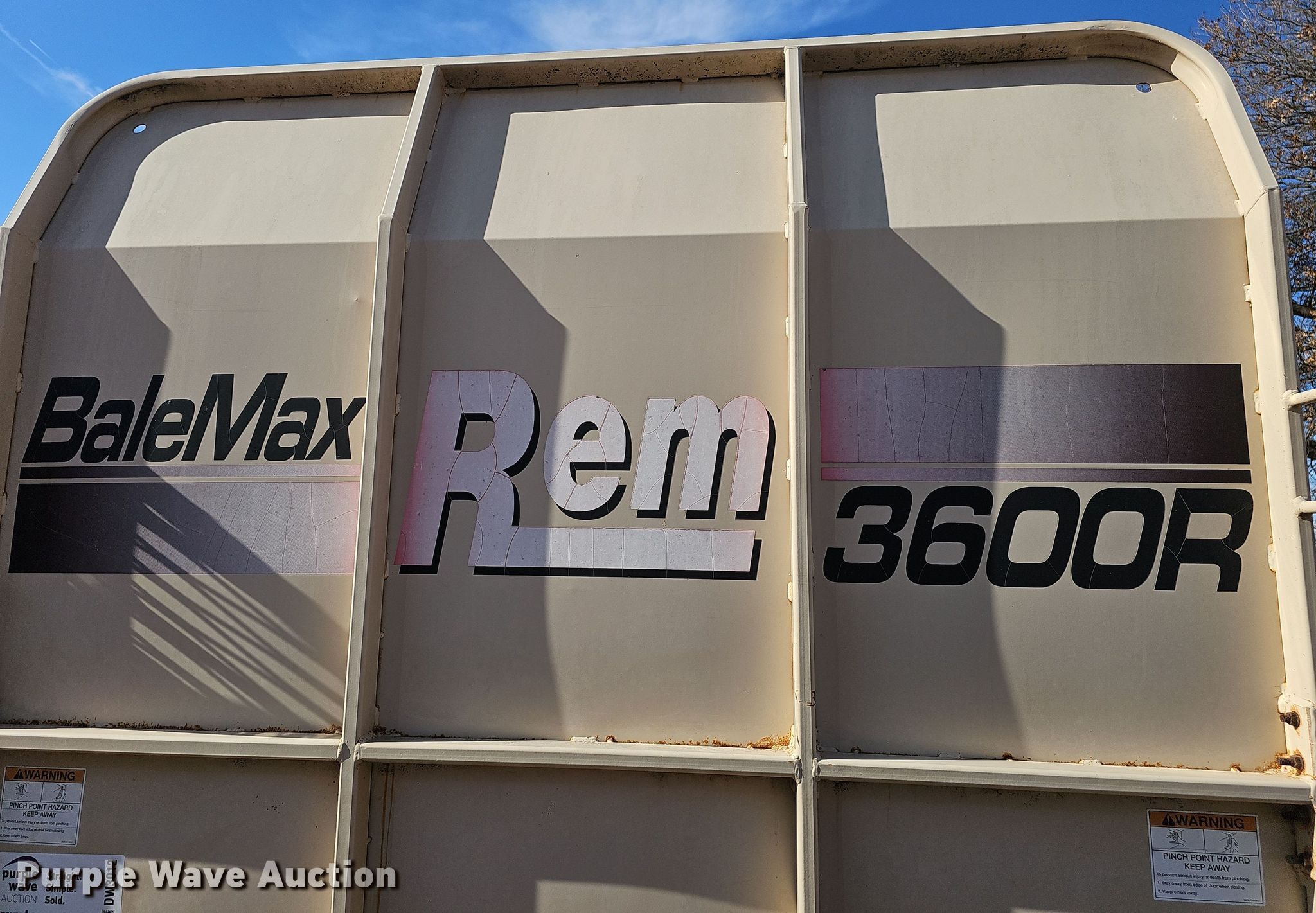 Rem BaleMax 3600R bale processor. Serial: RV-01-3600R-0299. Features PTO: 1000, Discharge: Side, Chain Width: 76", Chute: Hydraulic, Door: Hydraulic, Bale lift: Hydraulic. Tires Size: 11L-15. Bear Creek Farms. Bruning, NE 68322