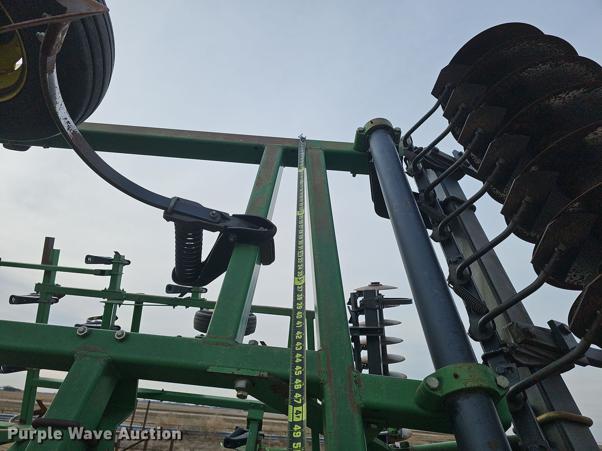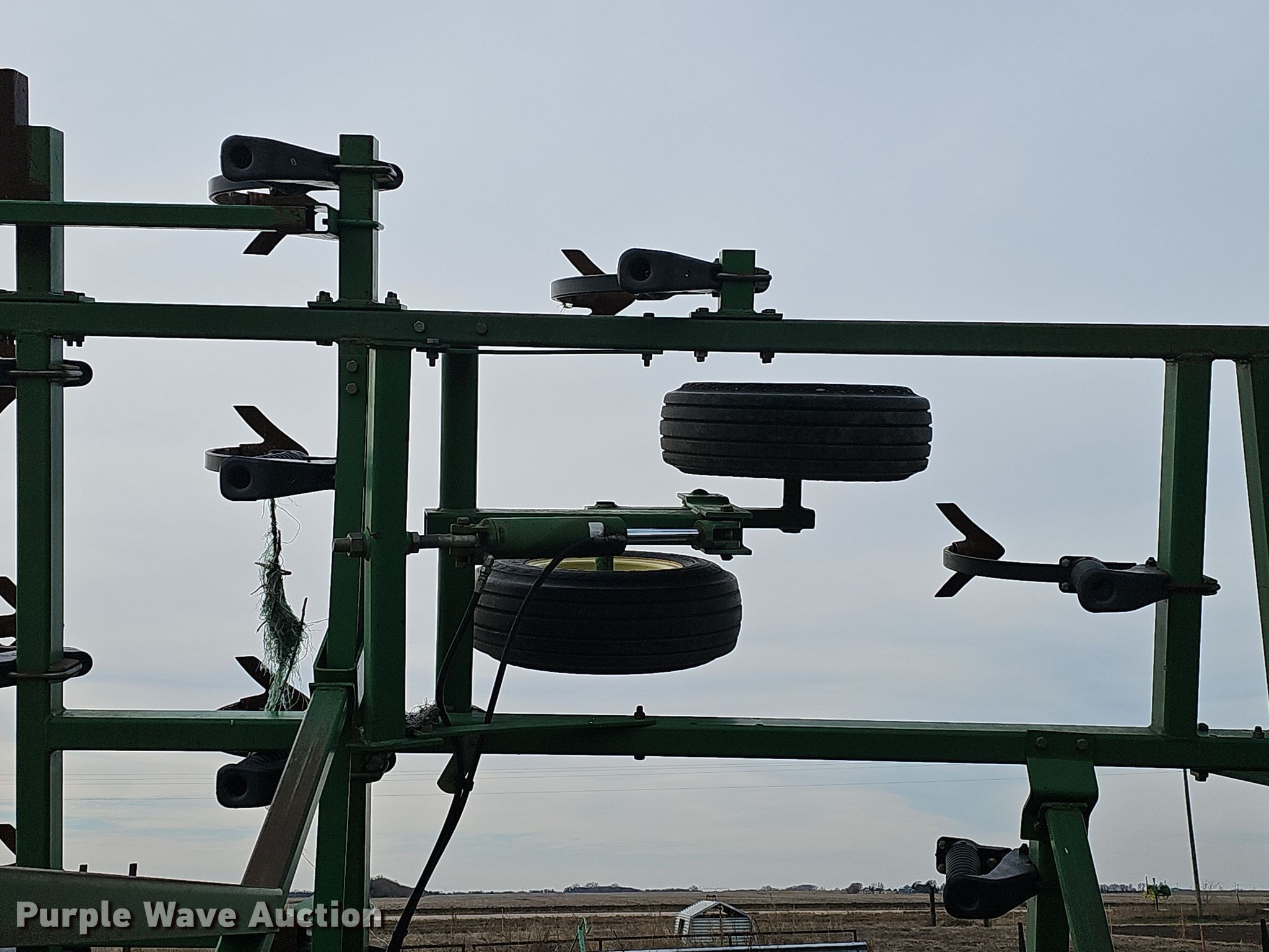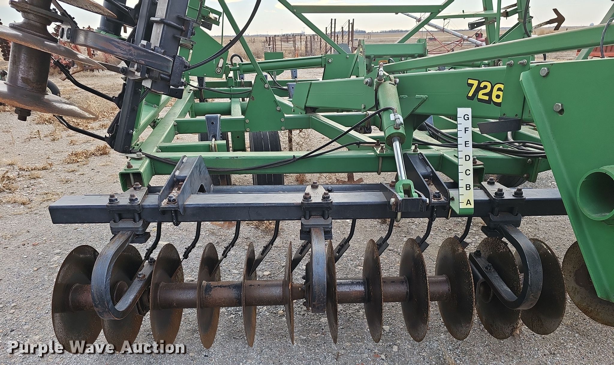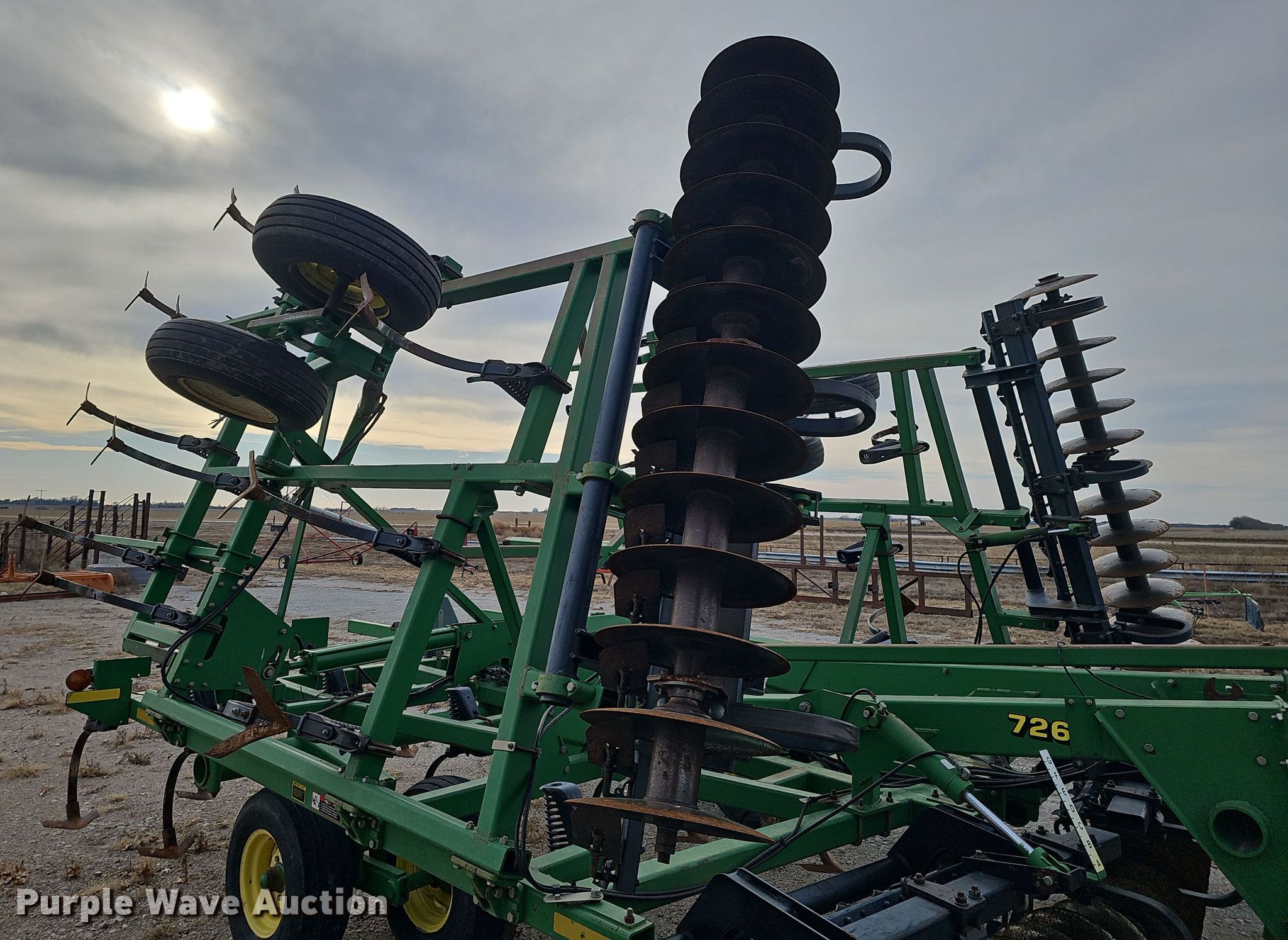 John Deere 726 mulch finisher. Overall width: 26', Serial: N00726X004710. Features Shanks: 40, Sweep width: 10", Blade diameter Front: 18", Spacing: 7", Operation Hydraulic lift, Hydraulic fold, Leveler: Manual, Attachments Spike tooth harrow Harrow bars: 5, Transport lights. Tires Tire size: 11L-15, Gauge wheels Size: 9.5L-15. Notes (3) spike tooth harrow sections removed but included. Bear Creek Farms. Bruning, NE 68322