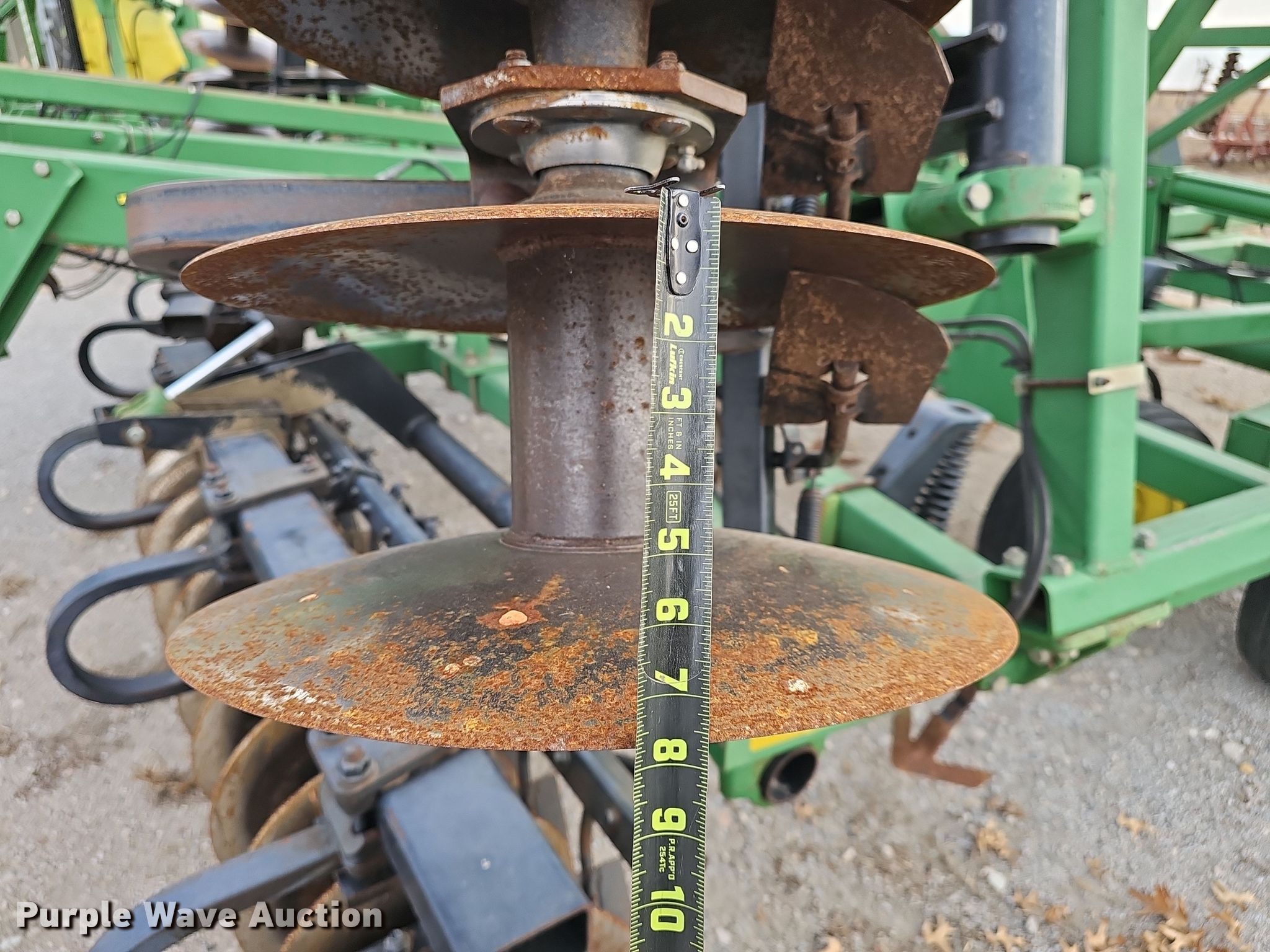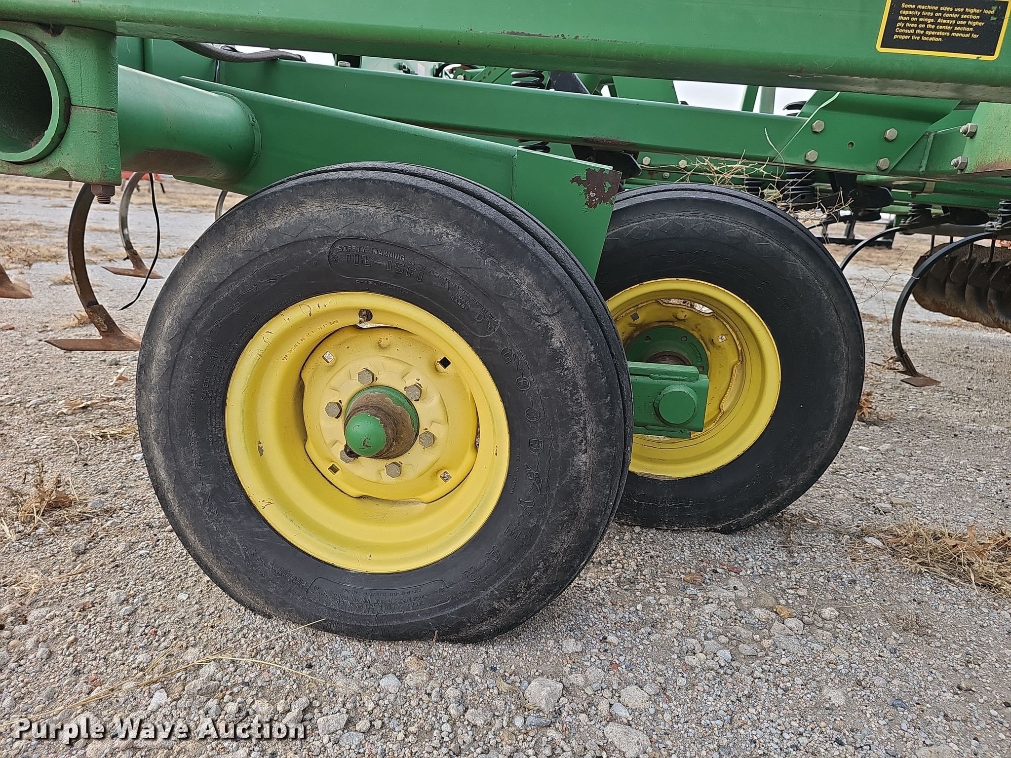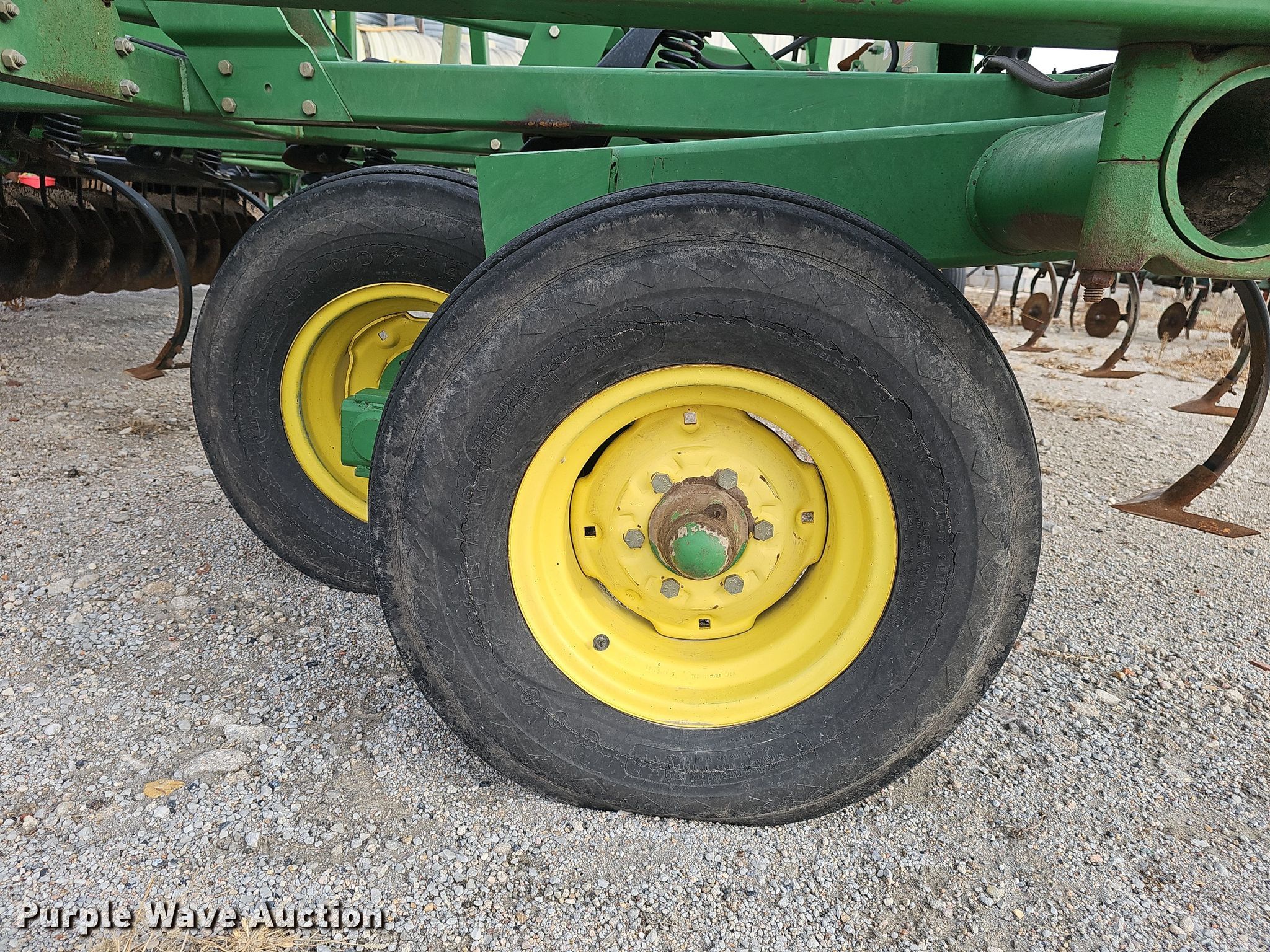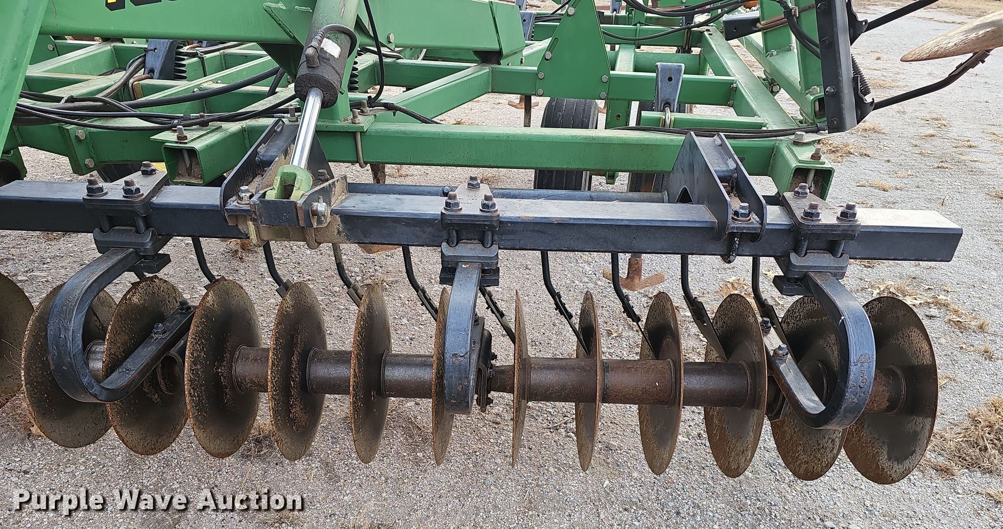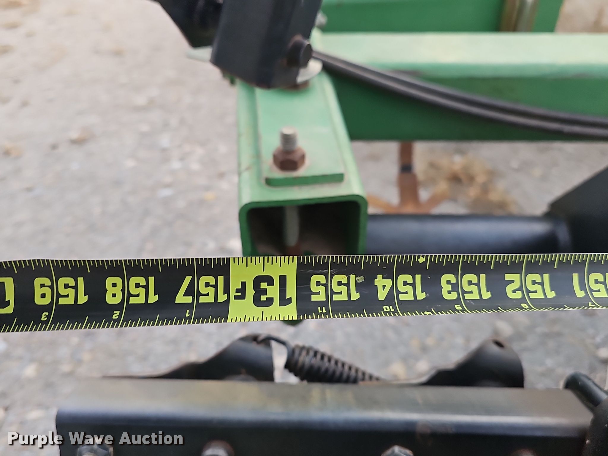 John Deere 726 mulch finisher. Overall width: 26', Serial: N00726X004710. Features Shanks: 40, Sweep width: 10", Blade diameter Front: 18", Spacing: 7", Operation Hydraulic lift, Hydraulic fold, Leveler: Manual, Attachments Spike tooth harrow Harrow bars: 5, Transport lights. Tires Tire size: 11L-15, Gauge wheels Size: 9.5L-15. Notes (3) spike tooth harrow sections removed but included. Bear Creek Farms. Bruning, NE 68322