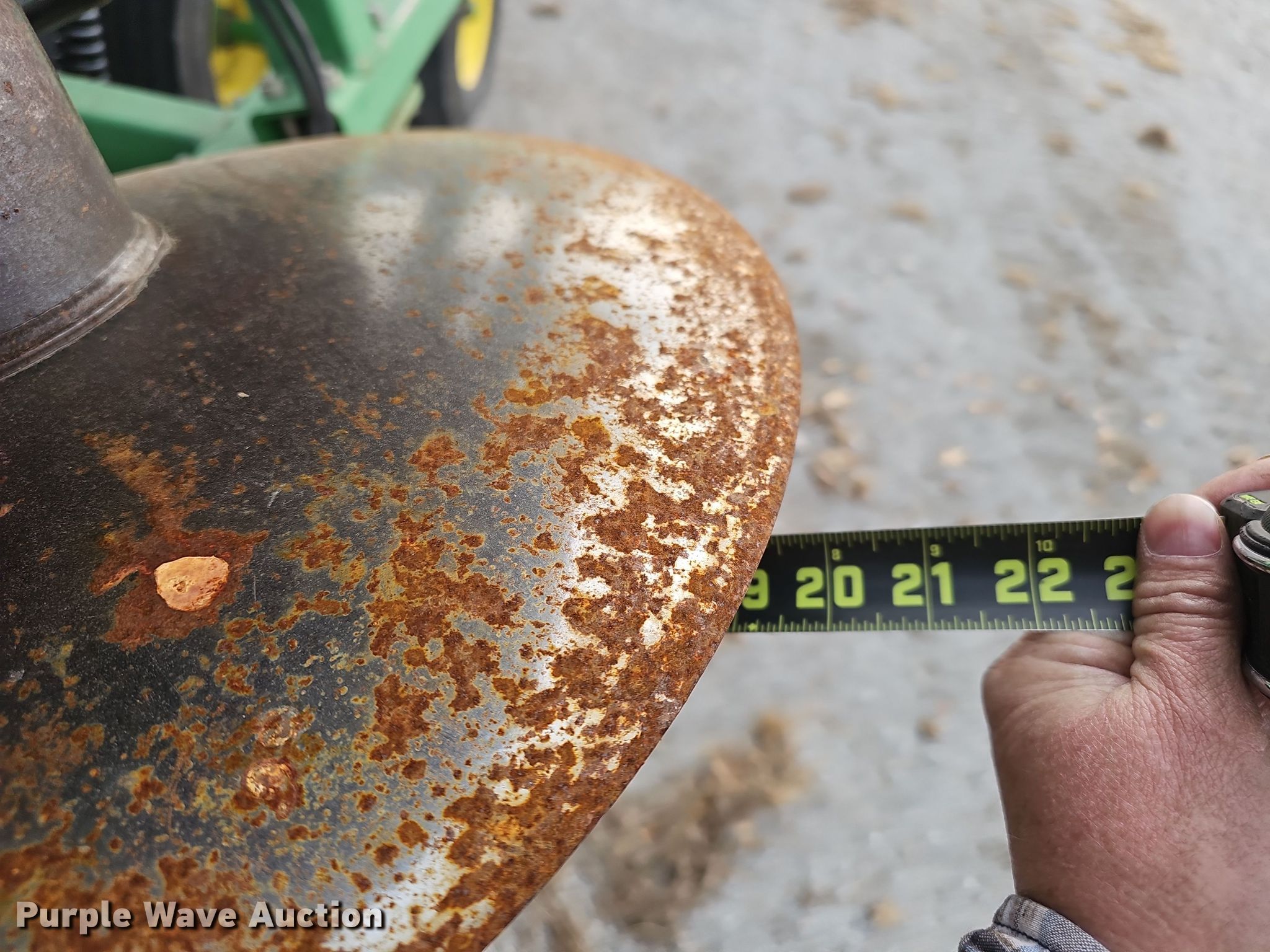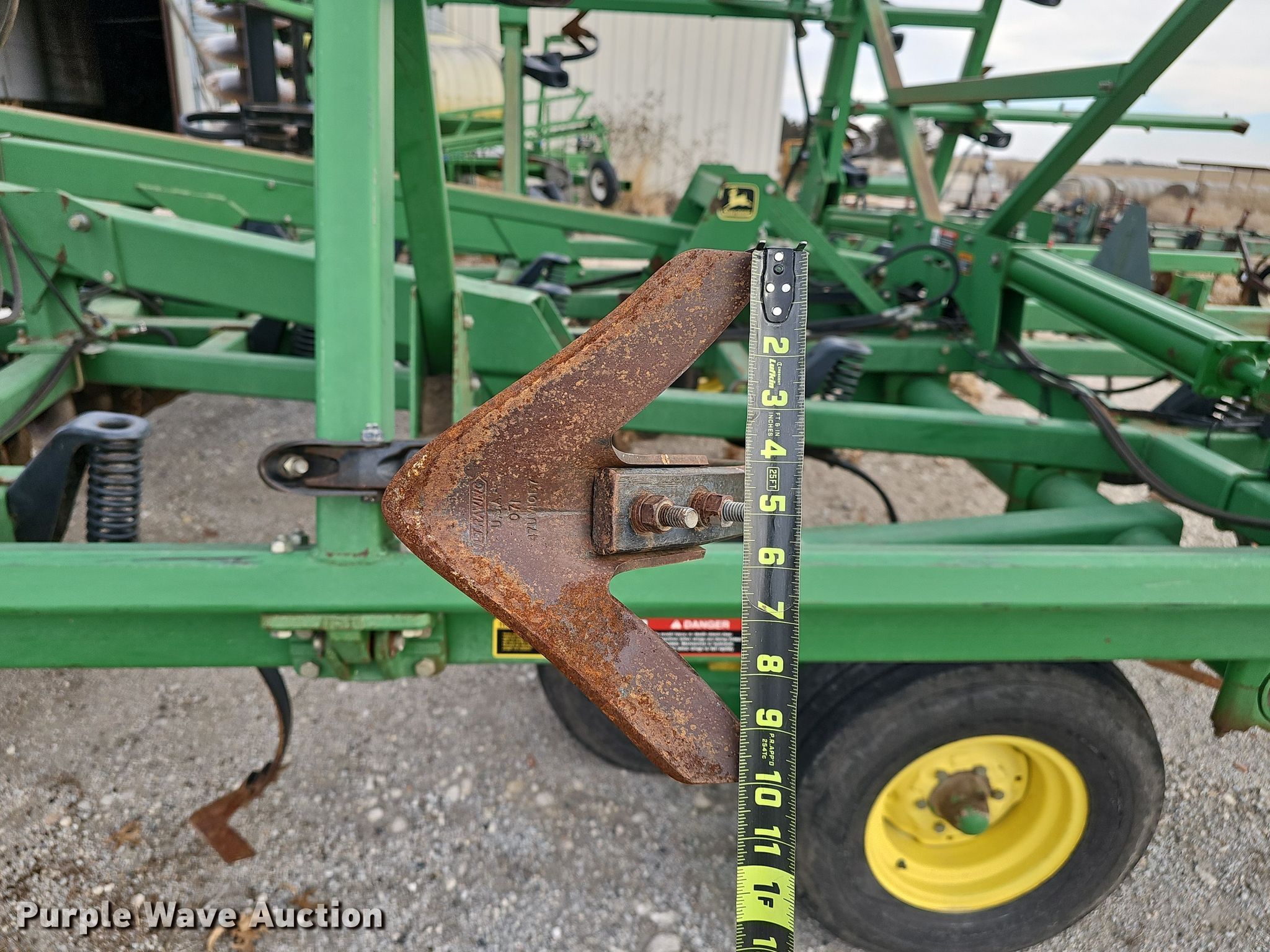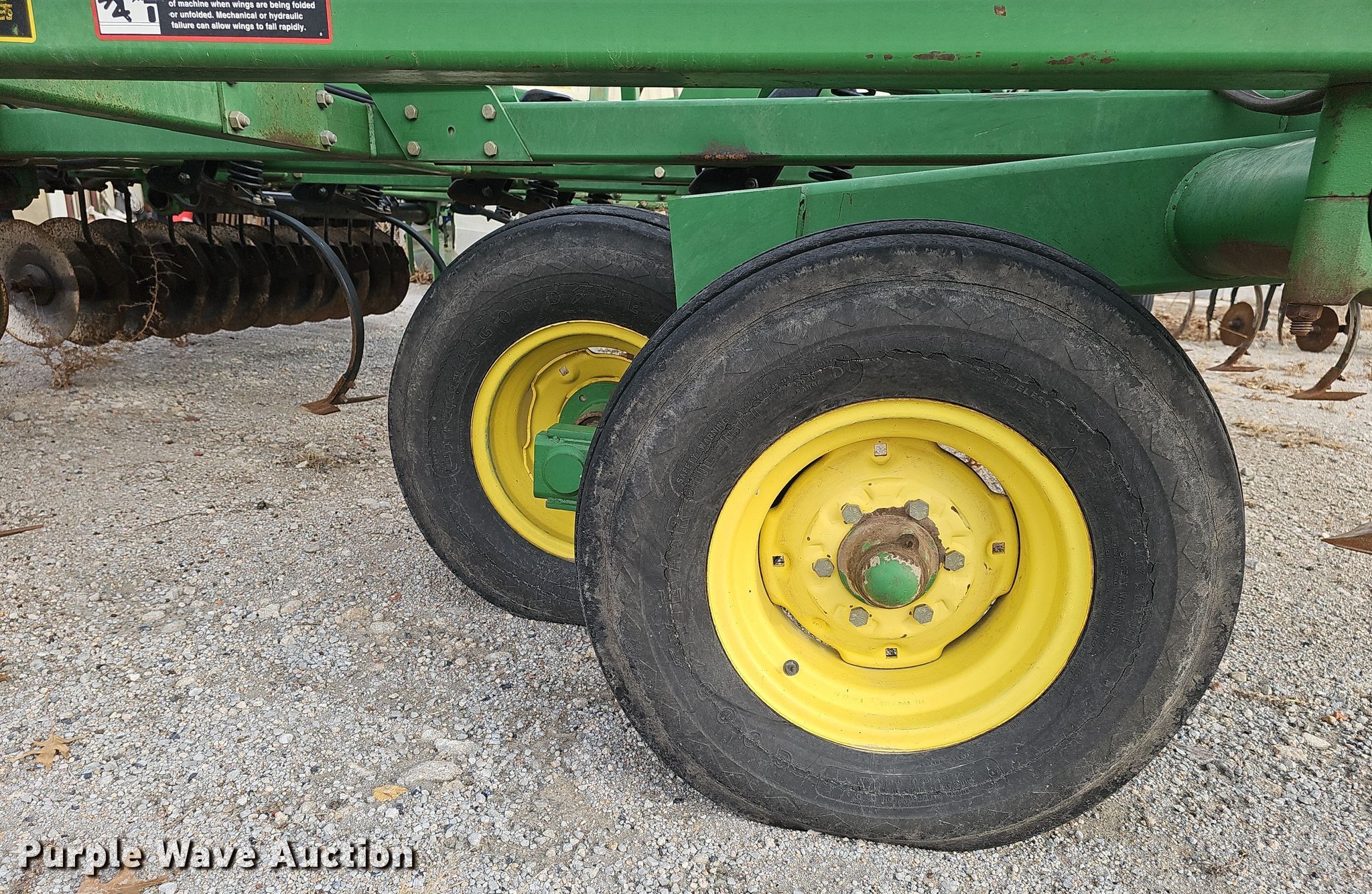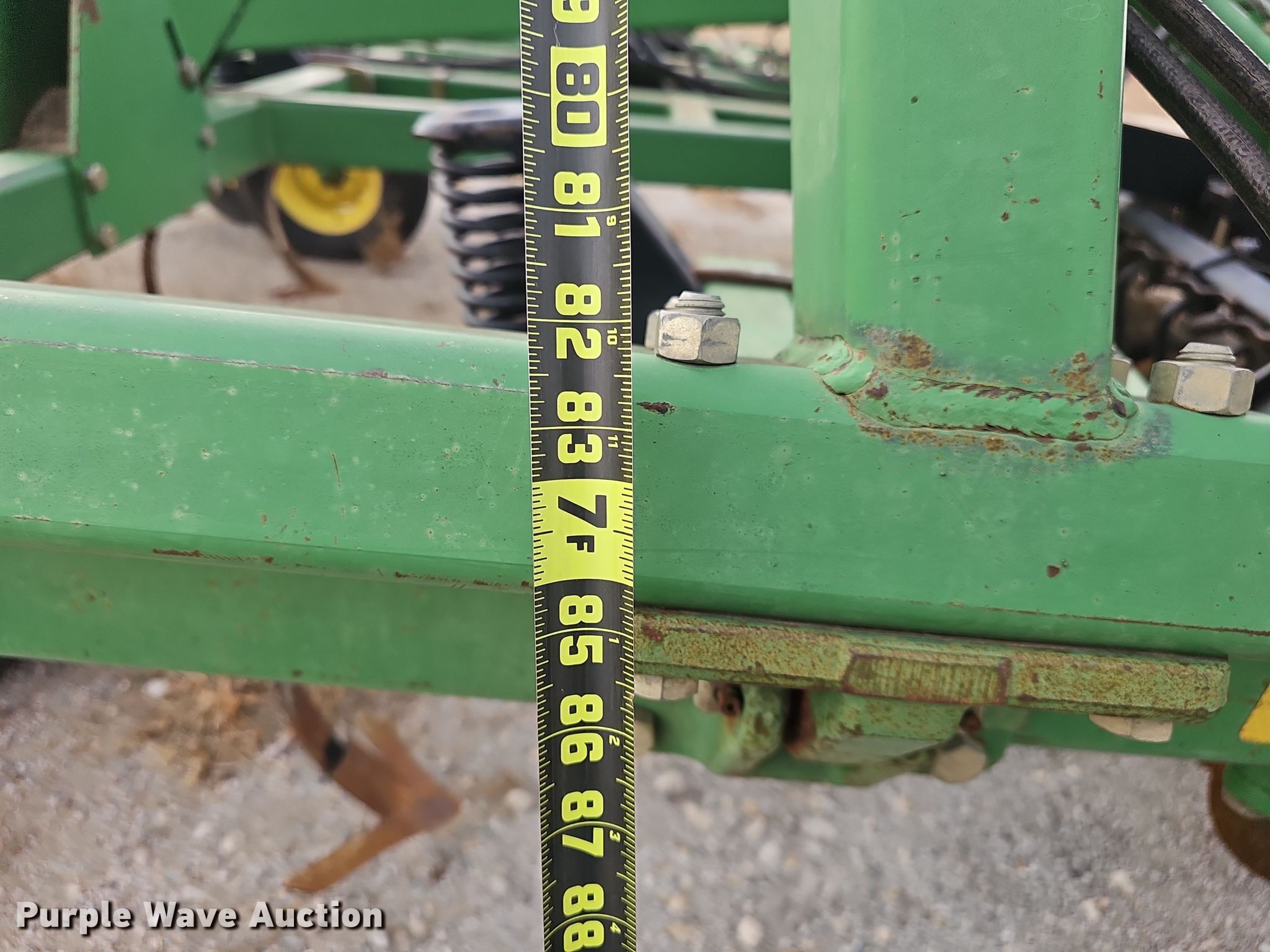 John Deere 726 mulch finisher. Overall width: 26', Serial: N00726X004710. Features Shanks: 40, Sweep width: 10", Blade diameter Front: 18", Spacing: 7", Operation Hydraulic lift, Hydraulic fold, Leveler: Manual, Attachments Spike tooth harrow Harrow bars: 5, Transport lights. Tires Tire size: 11L-15, Gauge wheels Size: 9.5L-15. Notes (3) spike tooth harrow sections removed but included. Bear Creek Farms. Bruning, NE 68322