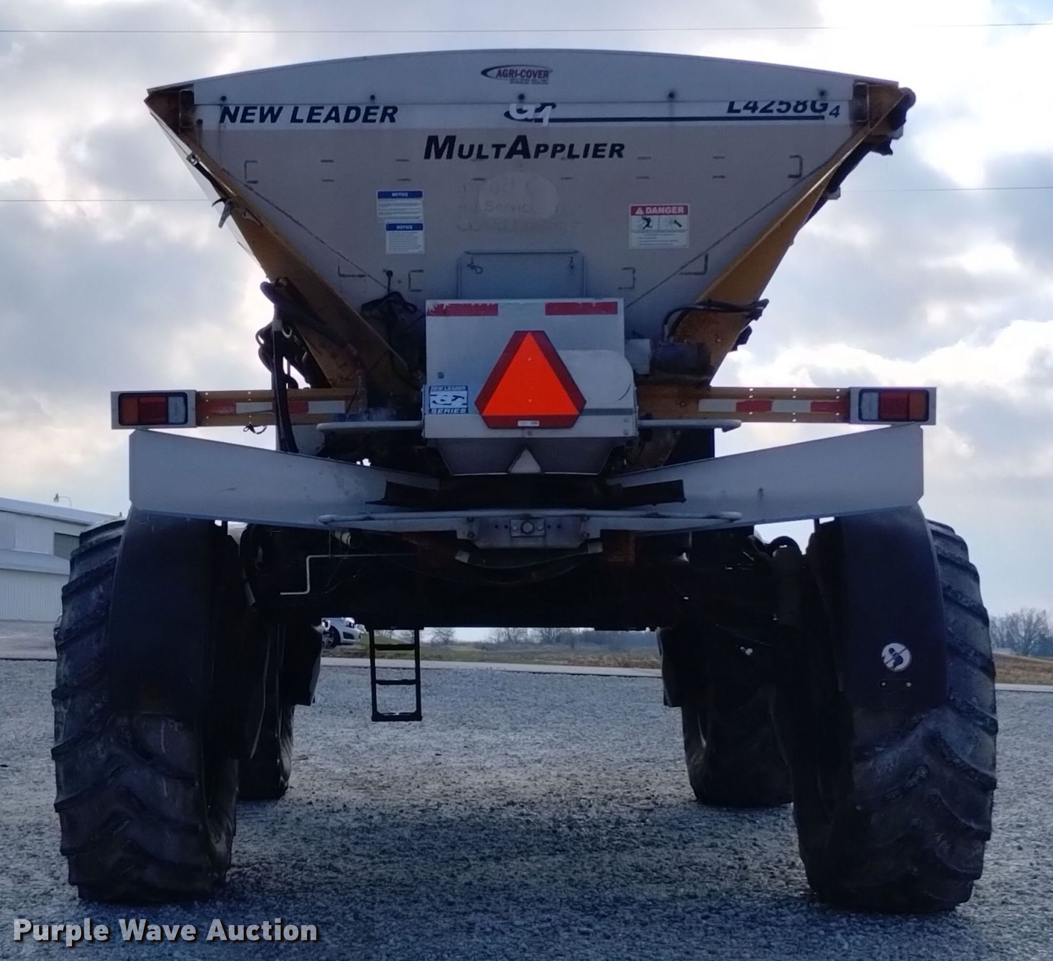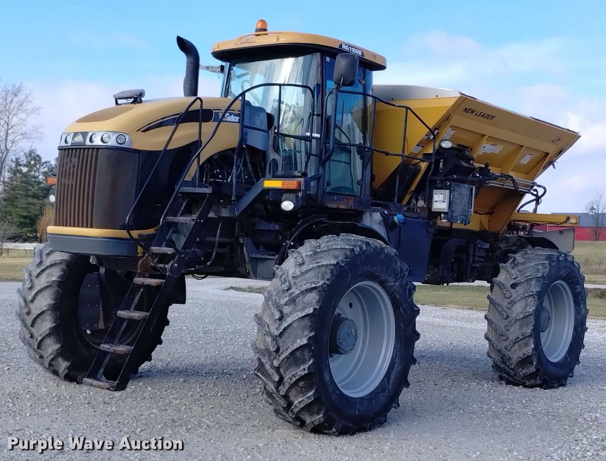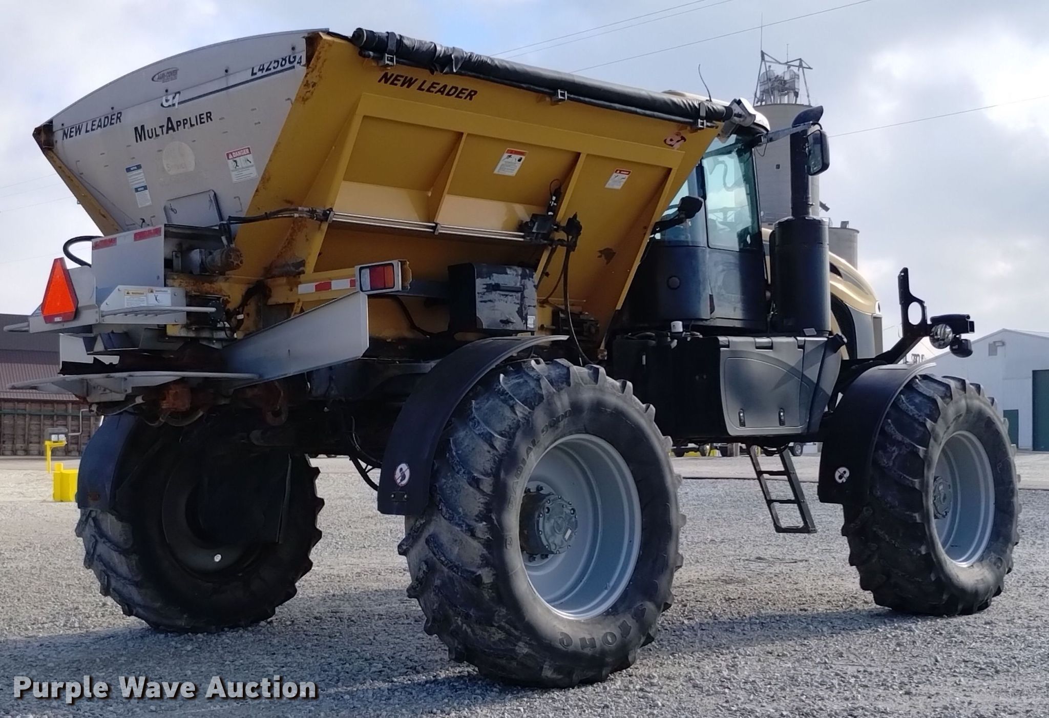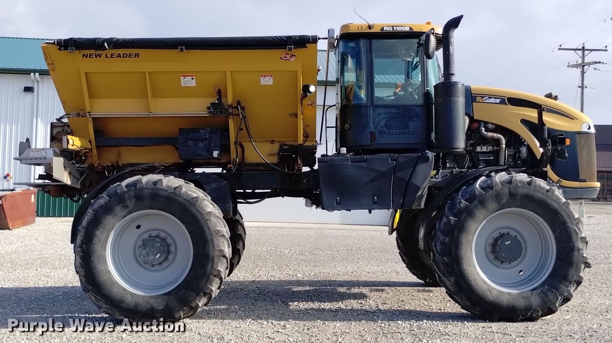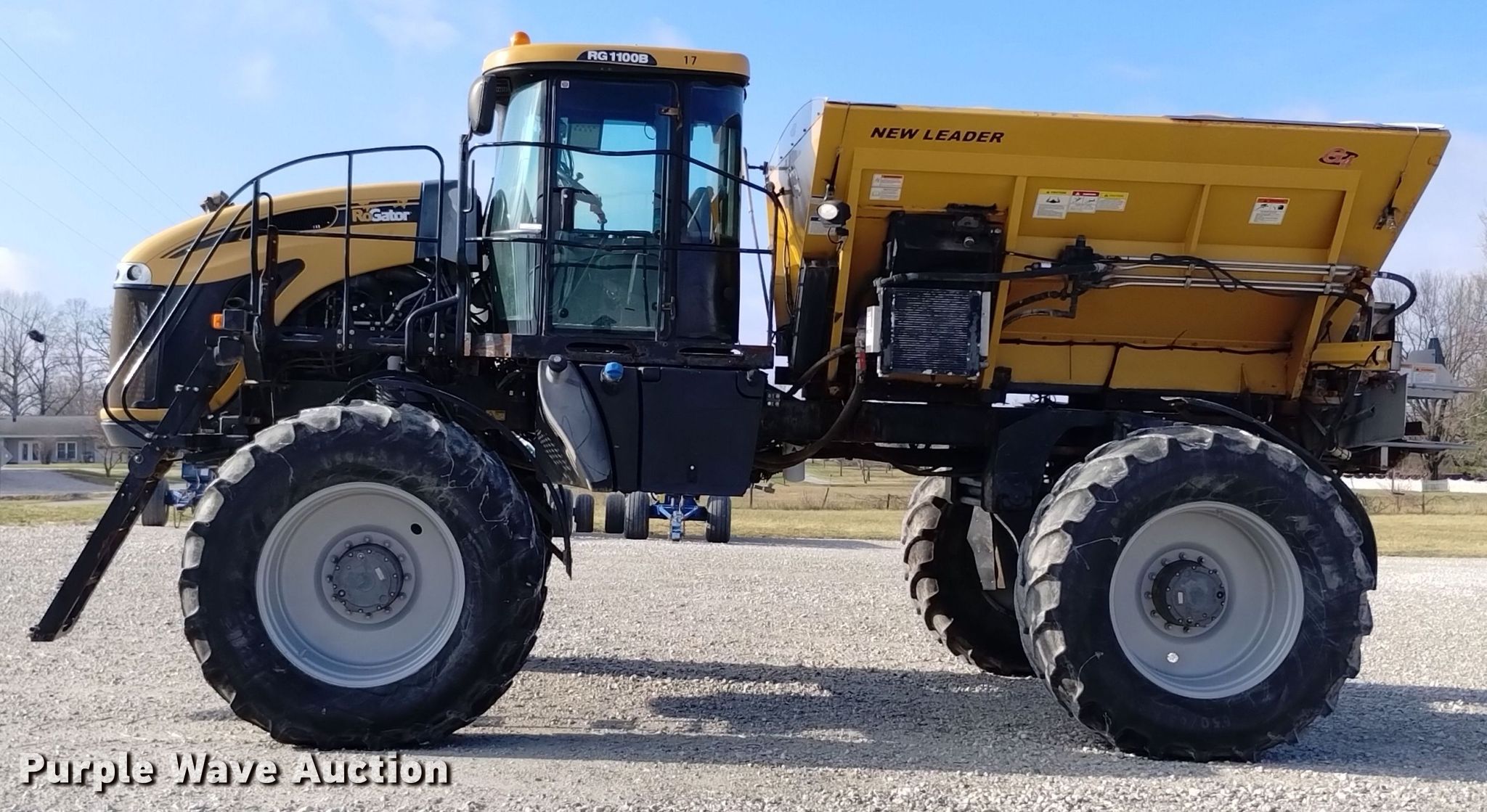 2015 Rogator RG1100B spreader. Engine hours: 4,682 on meter, Serial: AGCA1100PFNSN1017, Unit #: 17. Engine Agco, Cylinders: 6, Fuel type: Diesel. Transmission Hydrostatic. Operators station AC, Heat. Features Hydraulic ladder, Dry fertilizer spreader bed New Leader 5455968D1-11, Serial: 139067, Stainless steel, Dual spinners, Roll tarp, Conveyor belt Width: 30", Electronics Light bar, GPS monitor Raven Viper, GPS receiver, Spray controls, Auto steer, Ground radar. Tires Size: 650/65R38, Flotation tires. Notes Unknown operating condition of spreader bed. Keystone Cooperative. Summitville, IN 46070