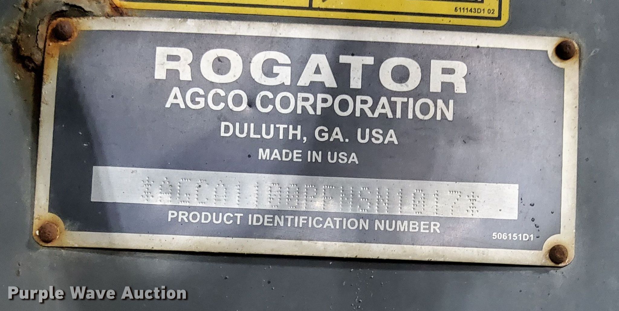 Purple Wave is selling a used Applicator Self Propelled in Indiana. This item is a 2015 Rogator RG1100B spreader with the following: Engine hours: 4,682 on meter, Serial: AGCA1100PFNSN1017, Unit #: 17