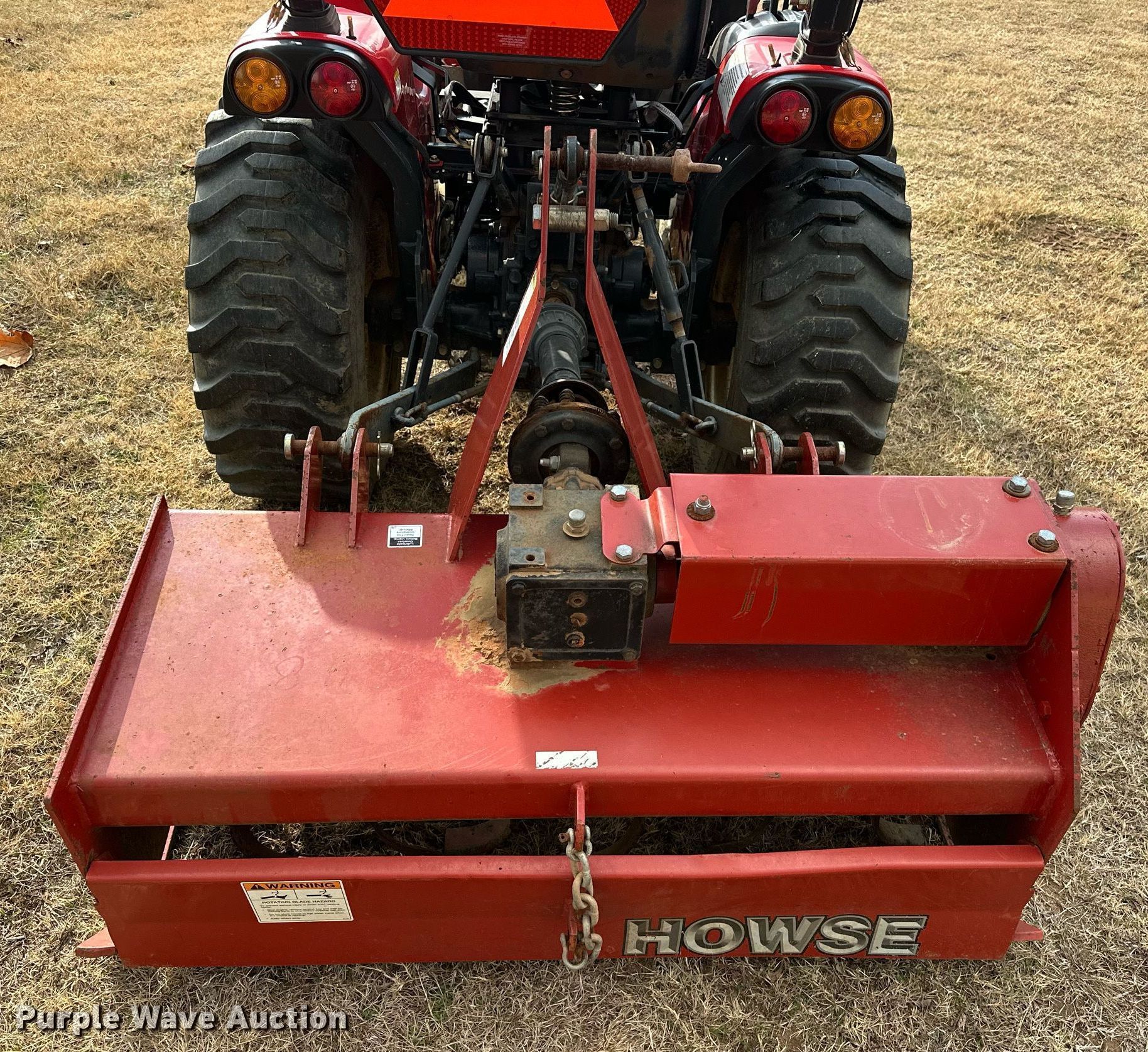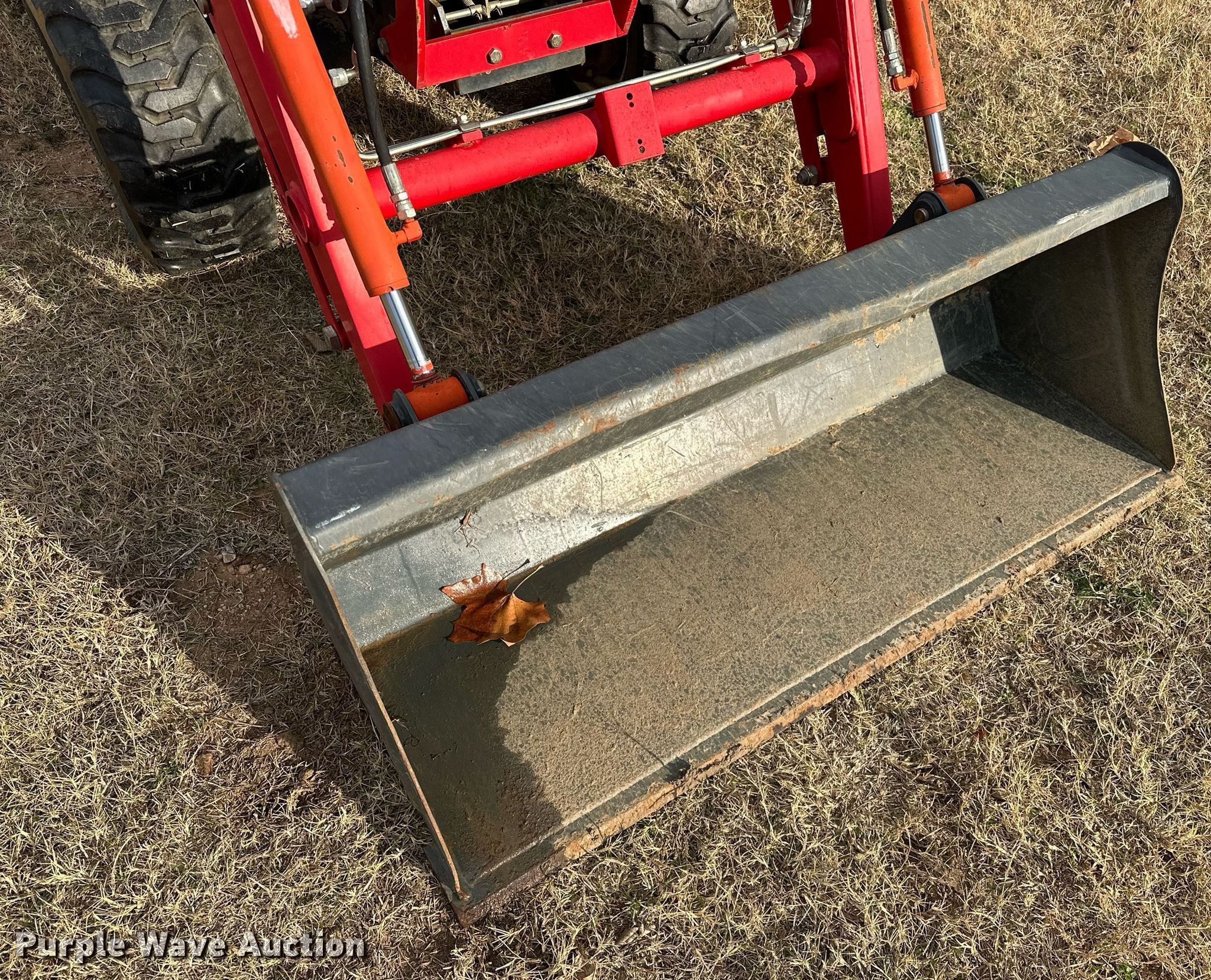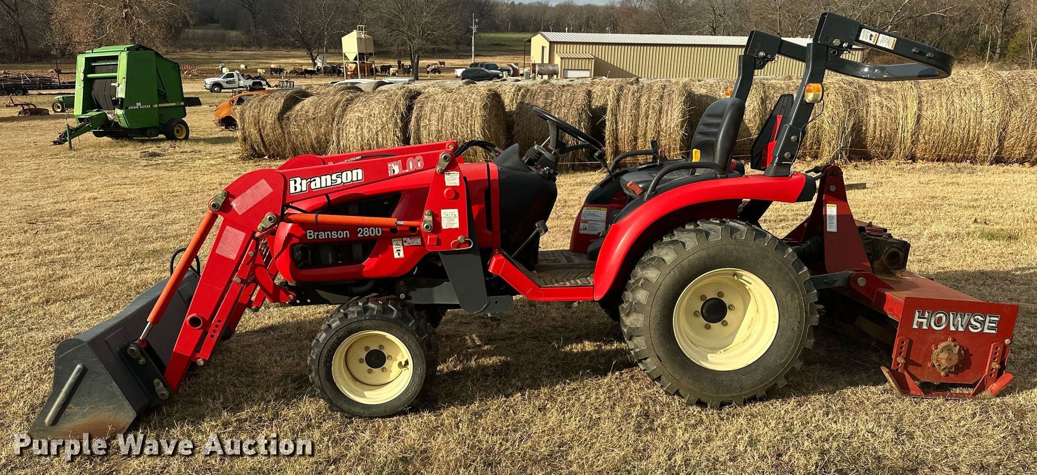 Branson 2800 MFWD tractor. Hours: 383 on meter, Serial: CEVW00075. Engine Cylinders: 3, Fuel type: Diesel. Transmission Manual, 6F - 2R, Differential lock. Features PTO: 540, Three point Top link, Loader Branson BLOO, Quick attach, Controls: Joystick, Bucket Width: 48", Rototiller Width: 47�, Diameter: 15�, Blade width: 7�. Tires Front: 23X8.50-12, Rear: 12-16.5. Ada, OK 74820