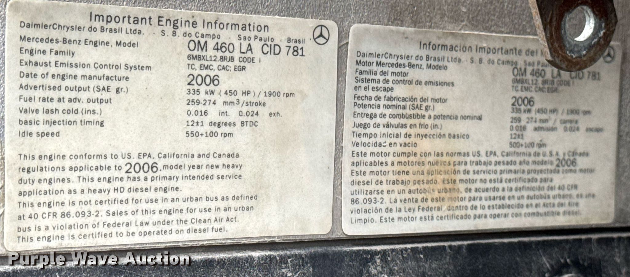 2007 Freightliner Cascadia semi truck. Miles: 590,864 on odometer, Hours: 883 on meter, VIN: 1FUBF0CV57LV87151. Engine Mercedes-Benz OM 460 LA, Displacement: 12.8L, Cylinders: 6, Fuel type: Diesel, HP: 450, Engine brake. Transmission Eaton Fuller, Automatic. Chassis Axles: Single, Suspension: Air Dump valves, Brakes: Air, Truck chassis: 112", GVWR: 34,700 lbs. Interior AC, Heat, Heated mirrors, Power windows, Power locks, Cruise control, Air ride cab. Features Fifth wheel type: Fixed, Fuel tank: Dual. Tires Size: 295/75R22.5. Notes Engine issues , Non-operational unit Unit must be to towed or hauled. Indiana title. Title distribution may be delayed up to 14 days from verification of funds. Keystone Cooperative. Lebanon , IN 46052
