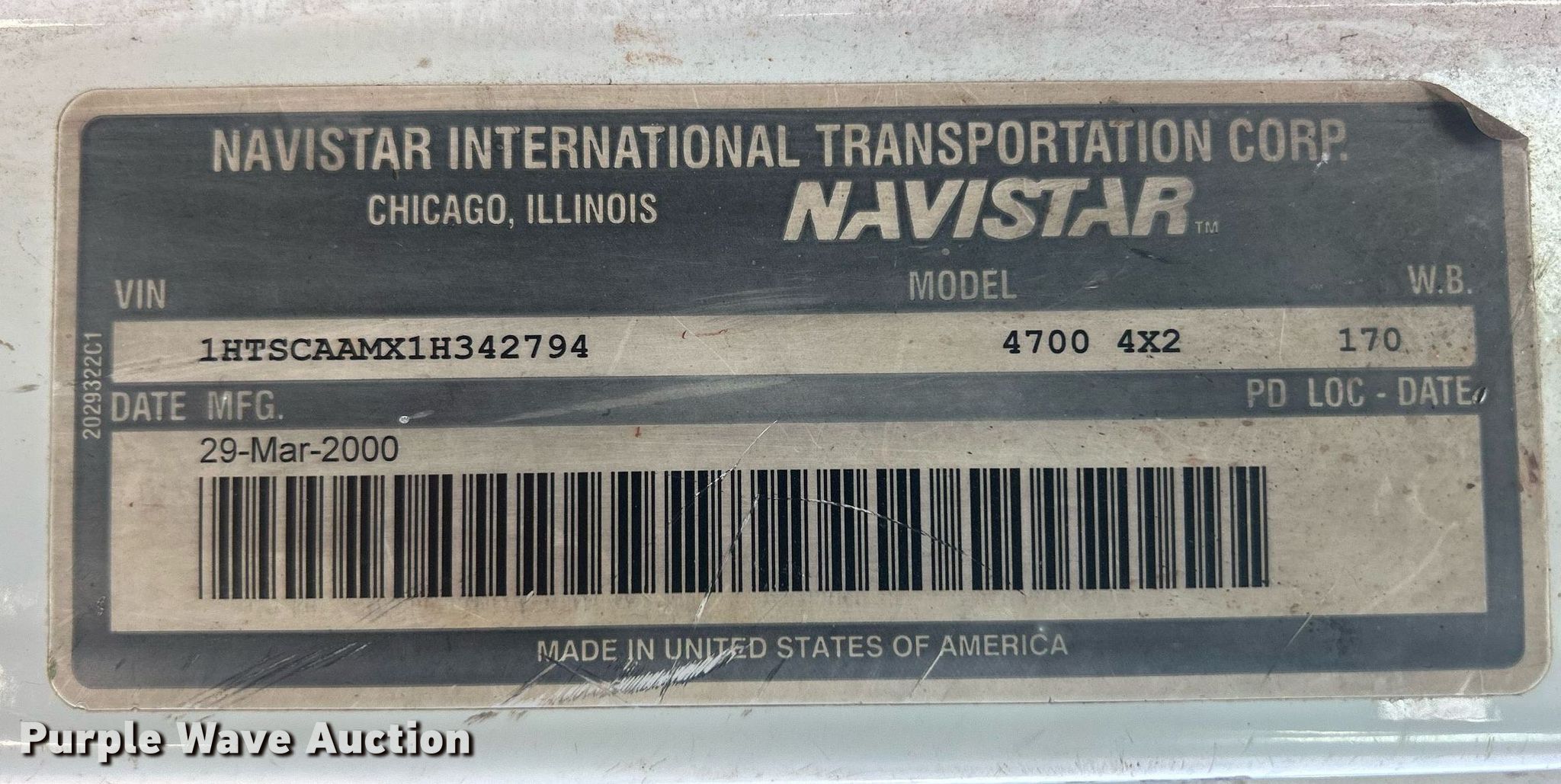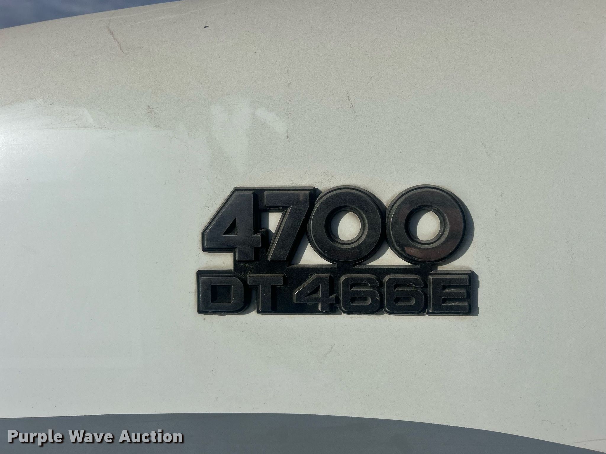 2001 International 4700 flatbed truck. Miles: 378,667 on odometer, VIN: 1HTSCAAMX1H342794. Engine International DT466E, Displacement: 7.6L, Cylinders: 6, Fuel type: Diesel. Transmission International 6 Plus, Manual, Speed: 7. Chassis Axles: Single, Suspension: Spring, Brakes: Hydraulic, Wheelbase: 170". Interior Heat, Cruise control, Brake controller. Features Flatbed 14' 6" L x 96" W, Removable sides, Hitch: Pintle. Tires Size: 235/80R22.5. Notes Windshield chipped or cracked. Missouri title. Title distribution may be delayed up to 30 days from verification of funds. Wilbert Funeral Services. Springfield, MO 65802