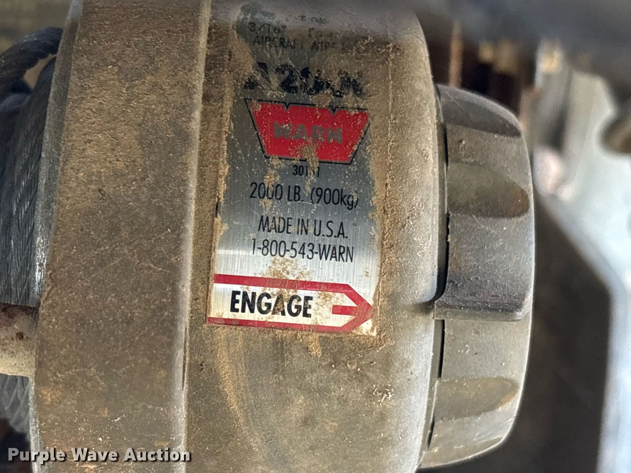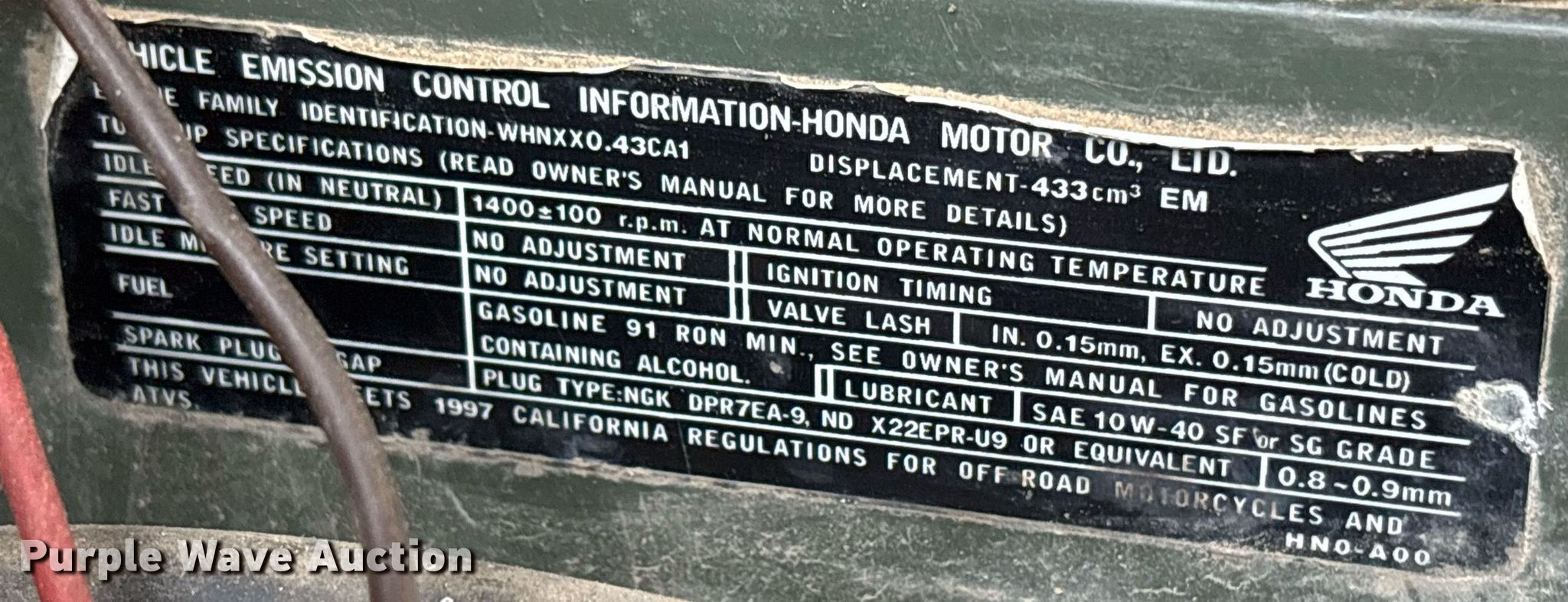 2002 Honda TRX450FM ATV. Miles: 602 on odometer, VIN: 478TE220924306156. Engine Honda, Displacement: 433 cc, Cylinders: 1, Fuel type: Gas, Electric start, Recoil start. Transmission Manual, Speed: 5. Chassis Four wheel drive/ All wheel drive. Features Winch, Grille guard, Receiver hitch. Tires Front: AT25x8-12, Rear: AT25x10-12. Notes Dead battery, Ignition switch issues, stuck on, Non-operational unit. Transfer of ownership documentation will be a bill of sale. Oklahoma Department of Wildlife Conservation. 49077 Fish Hatchery Road. Hodgen, OK 74939