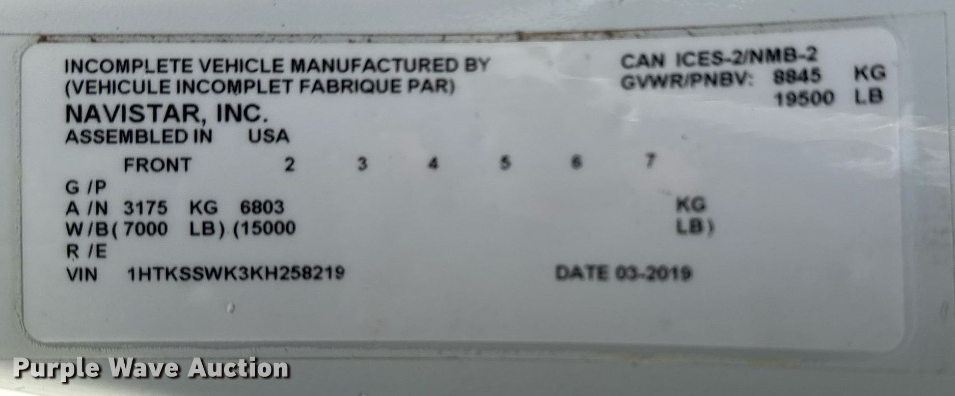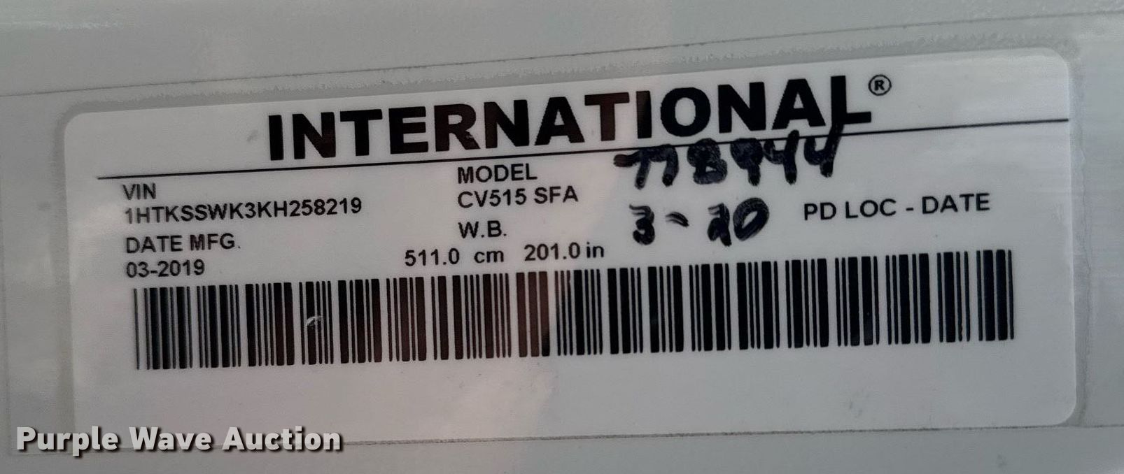 Purple Wave is selling a used Box Truck in Oklahoma. This item is a 2019 International CV515 box truck with the following: Miles: 53,520 on odometer, VIN: 1HTKSSWK3KH258219