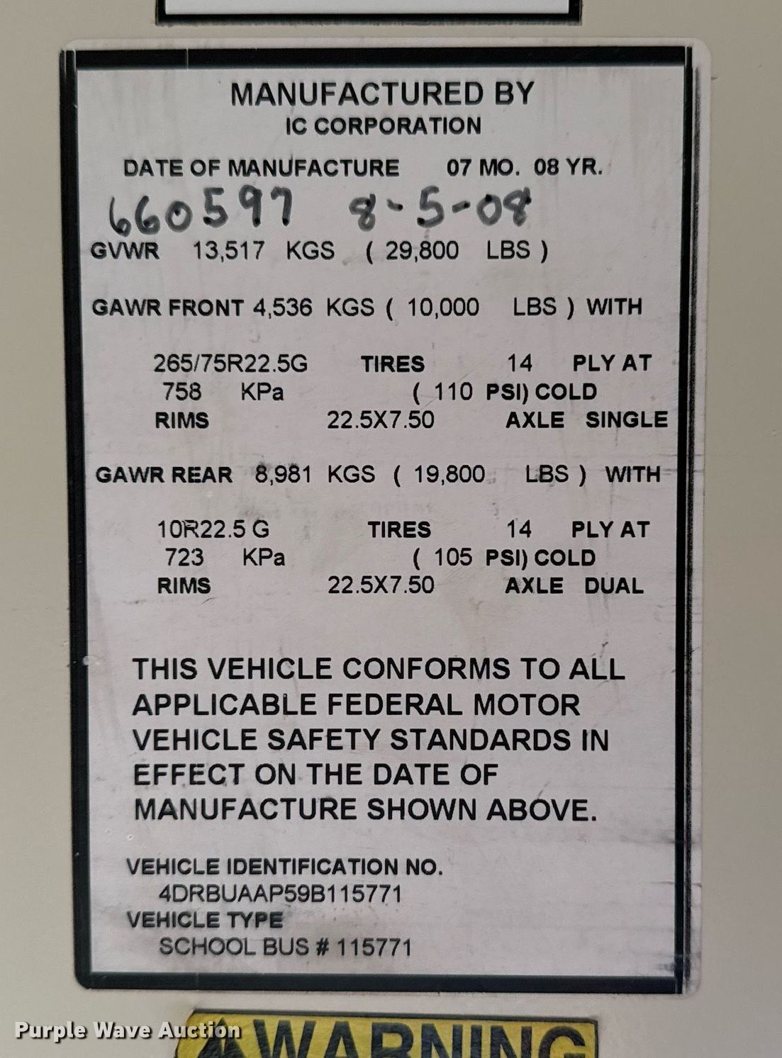 2009 IC PB105 school bus. Miles: 75,462 on odometer, Hours: 3,290 on meter, VIN: 4DRBUAAP59B115771. Engine International MaxxForce GDT210. * Displacement: 7.6L Cylinders: 6, Fuel type: Diesel, HP: 210. Transmission Automatic. Chassis Axles: Single, Suspension: Spring, Brakes: Hydraulic, GVWR: 29,800 lbs. Interior Heat, Heated mirrors, Cruise control, Electric passenger sliding door, Passengers: 65. Tires Size: 11R22.5. Notes Dash warning indicator: ABS, Brake, Traction control. Oklahoma title. Seller is an Oklahoma licensed motor vehicle dealer. Title will be assigned and distributed by the dealer. Please contact the seller for distribution questions. Title distribution may be delayed up to 30 days from verification of funds. Collinsville, OK 74021