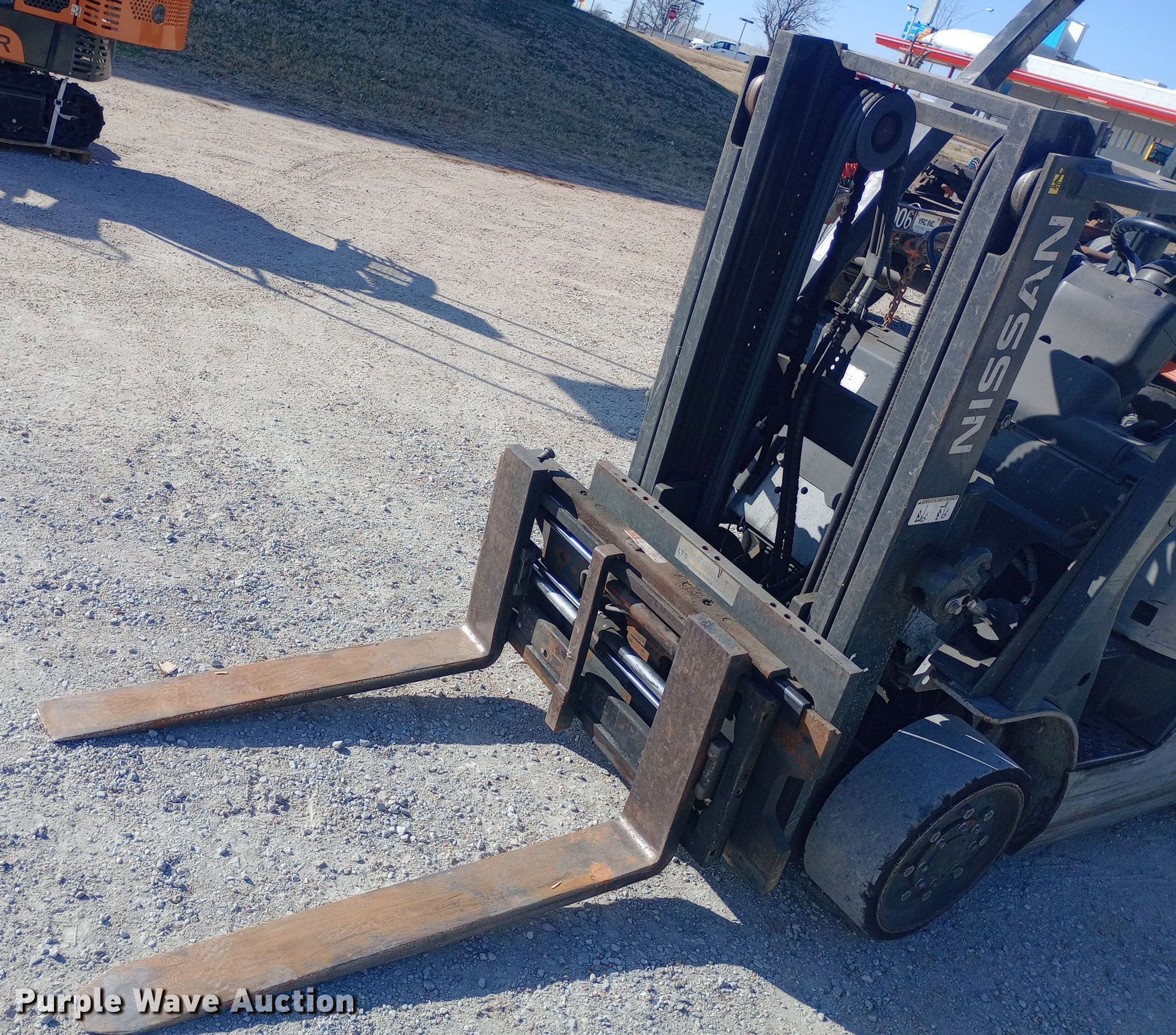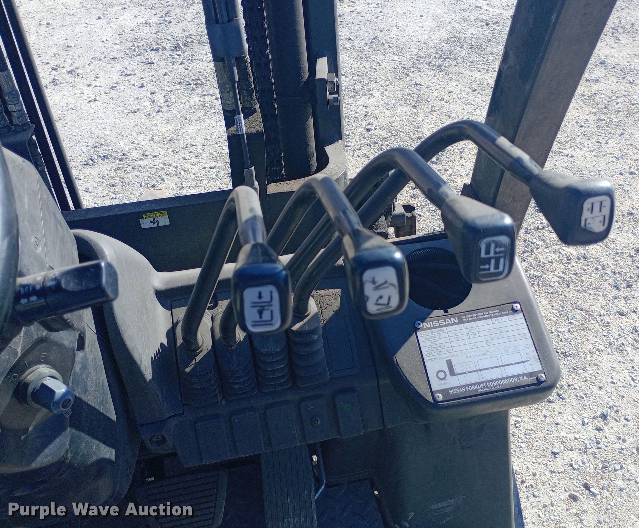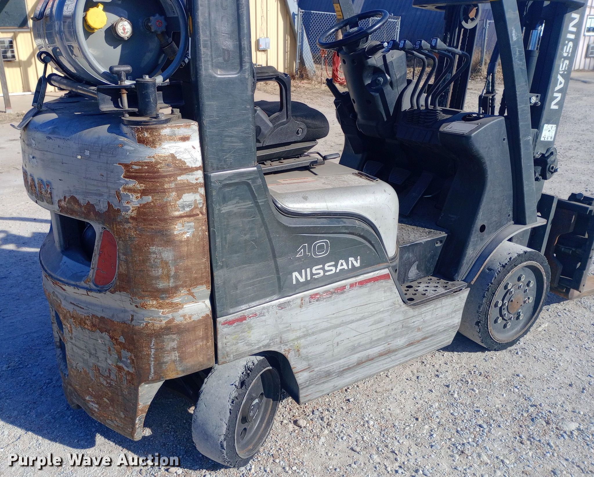 Nissan 40 forklift. Hours: 7,192 on meter. Engine Displacement: 2.1L, Cylinders: 4, Fuel type: LPG LP bottle: Not included. Transmission Powershift. Operators station OROPS. Features Maximum lift capacity: 4,000 lbs, Maximum lift height: 80", Mast stages: 2, Side shift, Mast tilt, Fork length: 40". Tires Front: 21x7-15, Rear: 16.25x6-11.25. QP Distrubution. Mulvane, KS 67110
