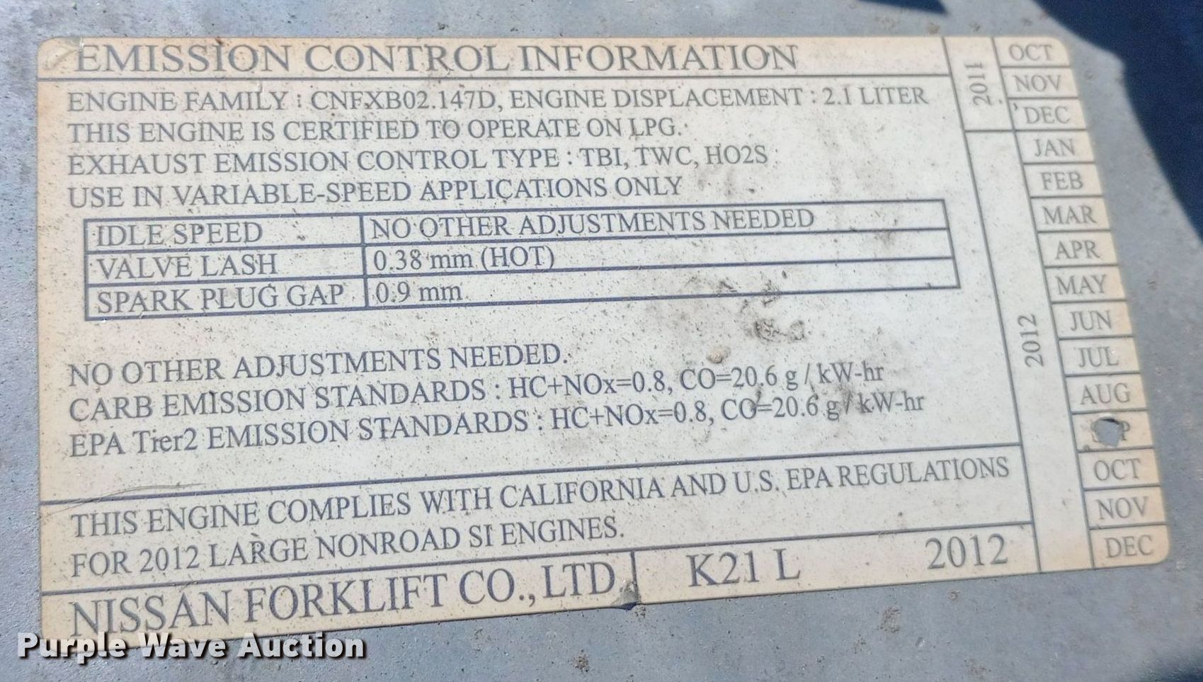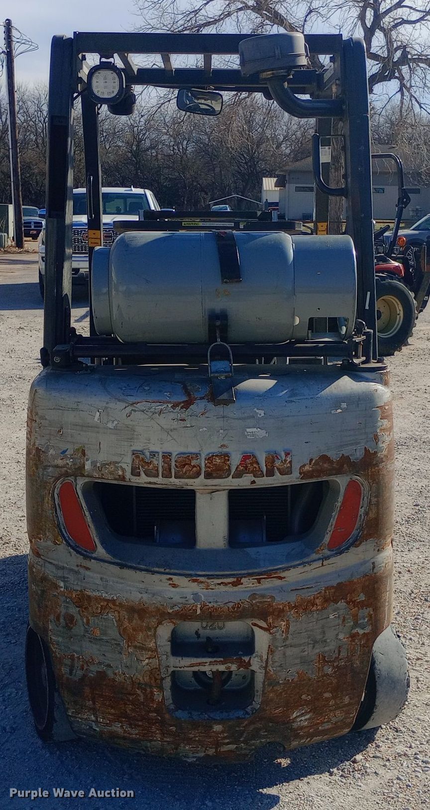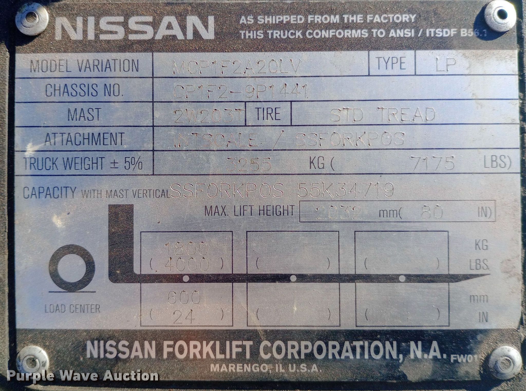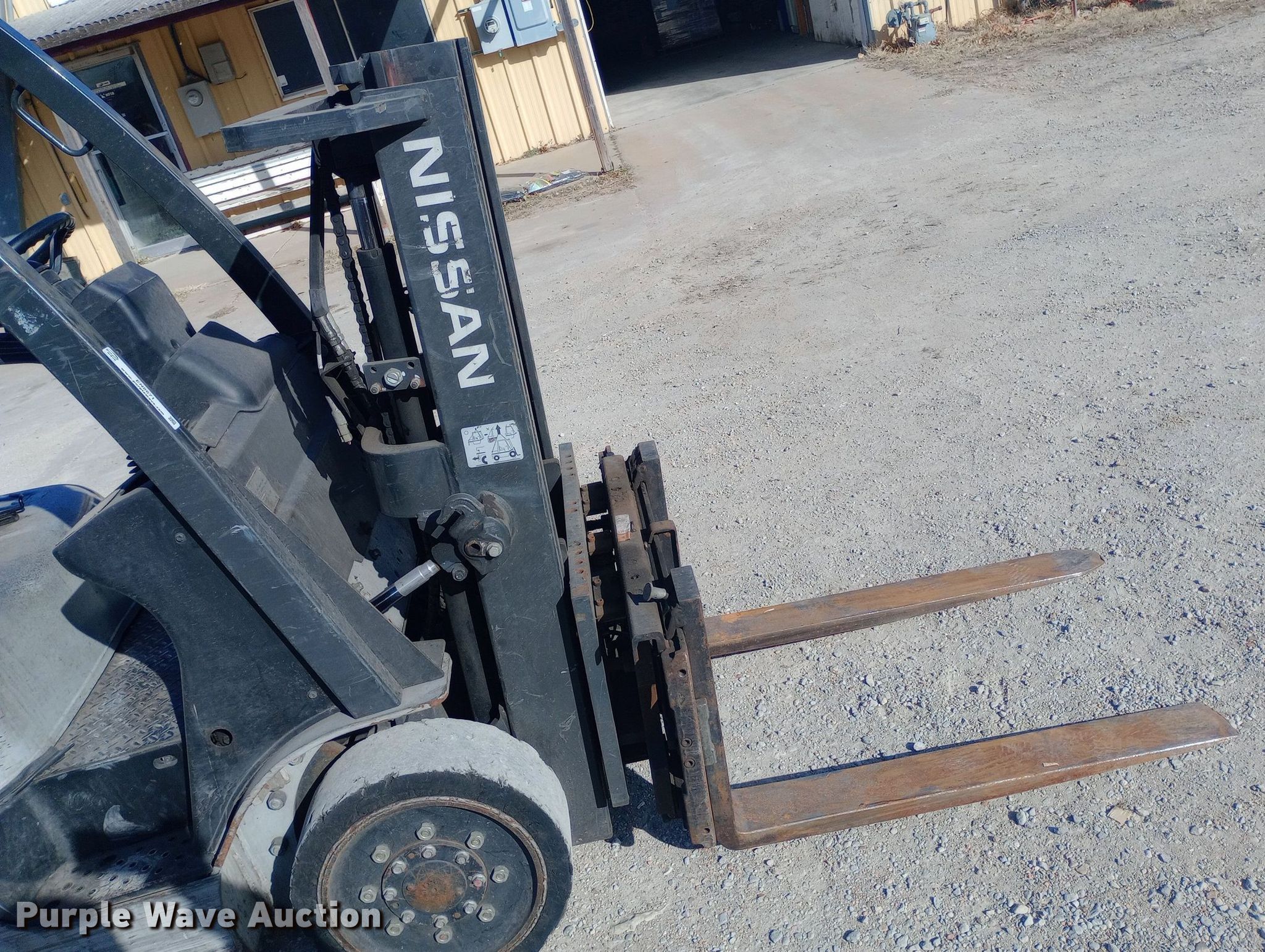 Nissan 40 forklift. Hours: 7,192 on meter. Engine Displacement: 2.1L, Cylinders: 4, Fuel type: LPG LP bottle: Not included. Transmission Powershift. Operators station OROPS. Features Maximum lift capacity: 4,000 lbs, Maximum lift height: 80", Mast stages: 2, Side shift, Mast tilt, Fork length: 40". Tires Front: 21x7-15, Rear: 16.25x6-11.25. QP Distrubution. Mulvane, KS 67110