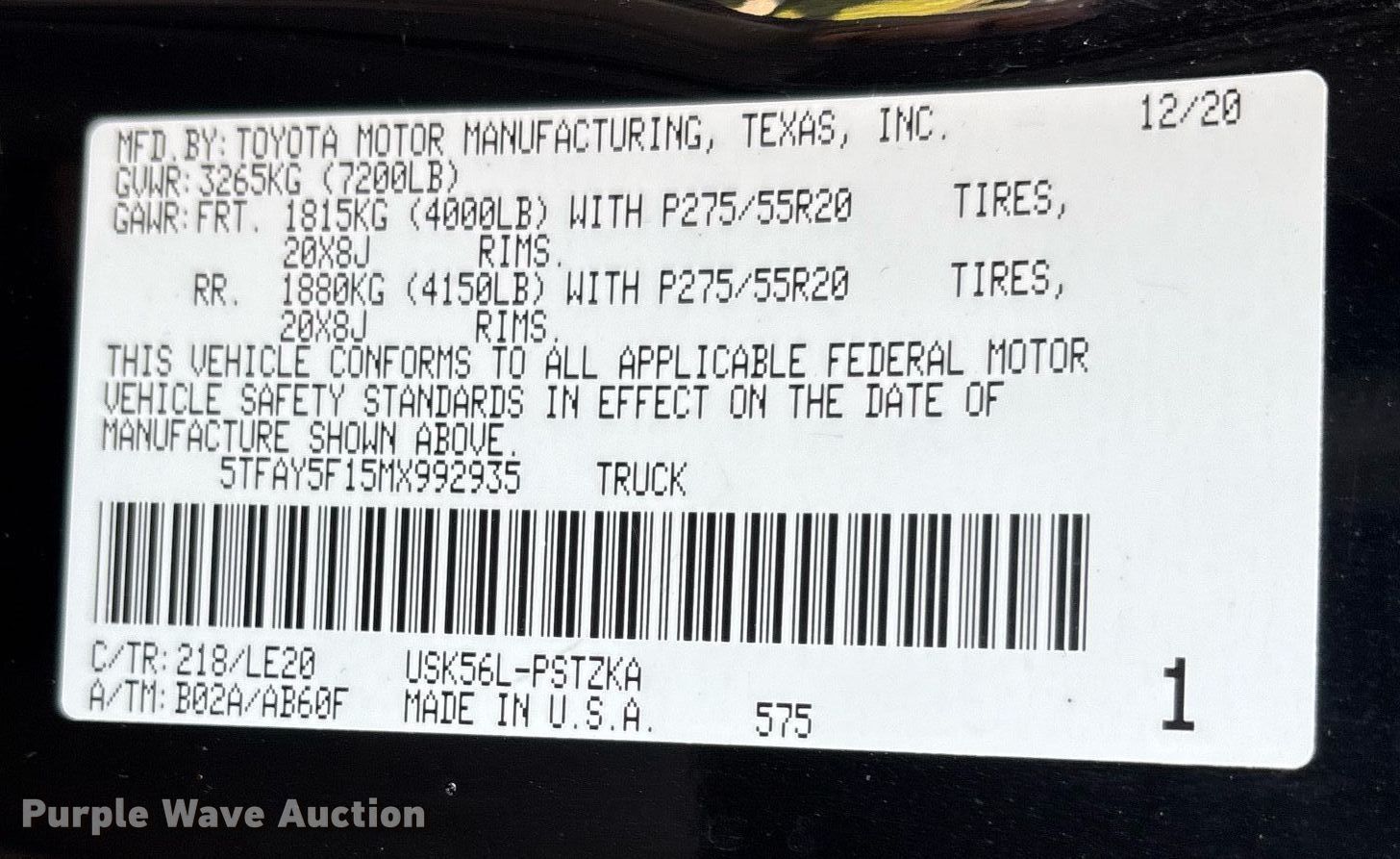 Purple Wave is selling a used 1/2 Ton Pickup or Van in Texas. This item is a 2021 Toyota Tundra Platinum CrewMax pickup truck with the following: Miles: 89,601 on odometer, Miles or hours may vary, unit still in use, VIN: 5TFAY5F15MX992935