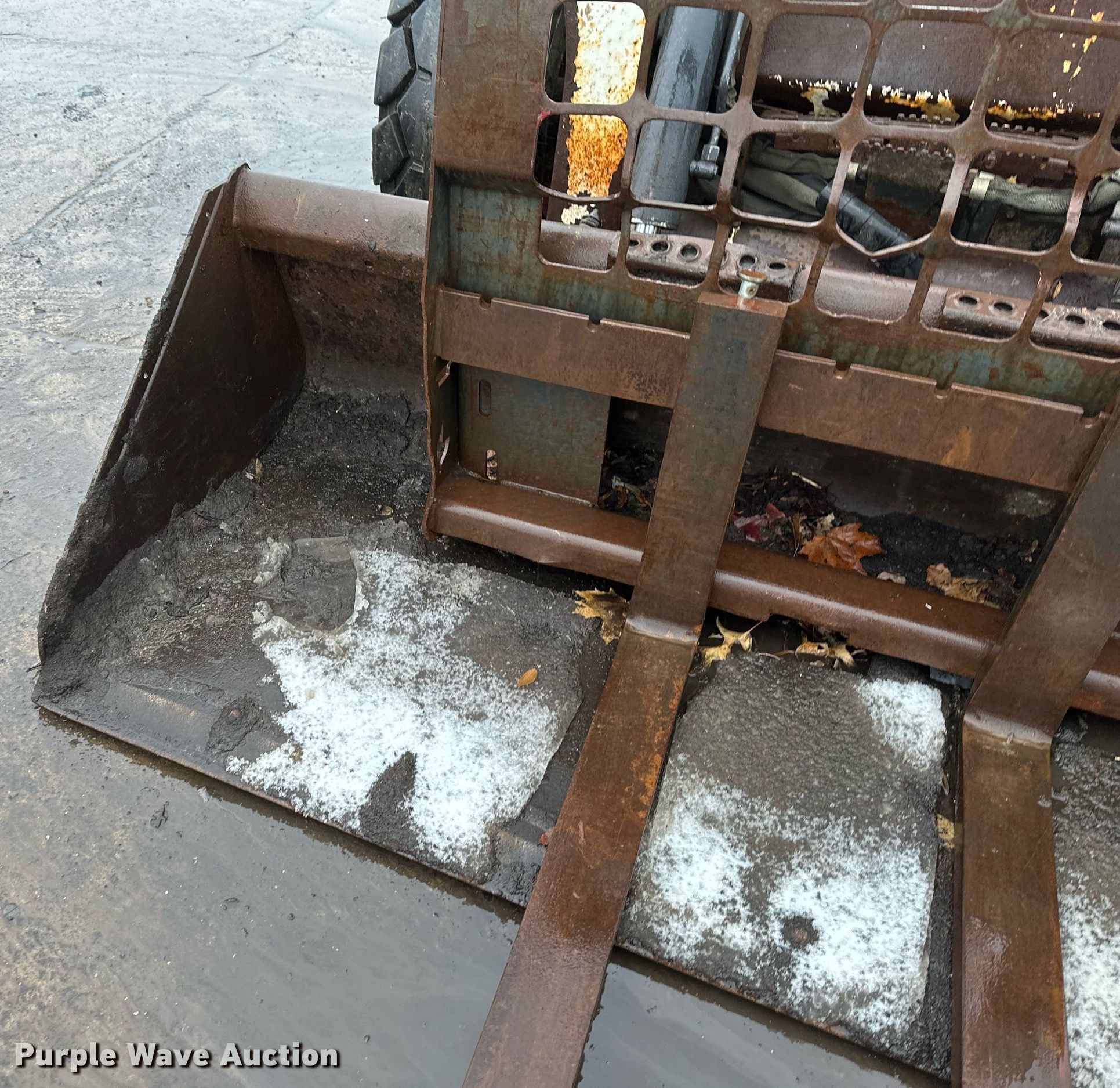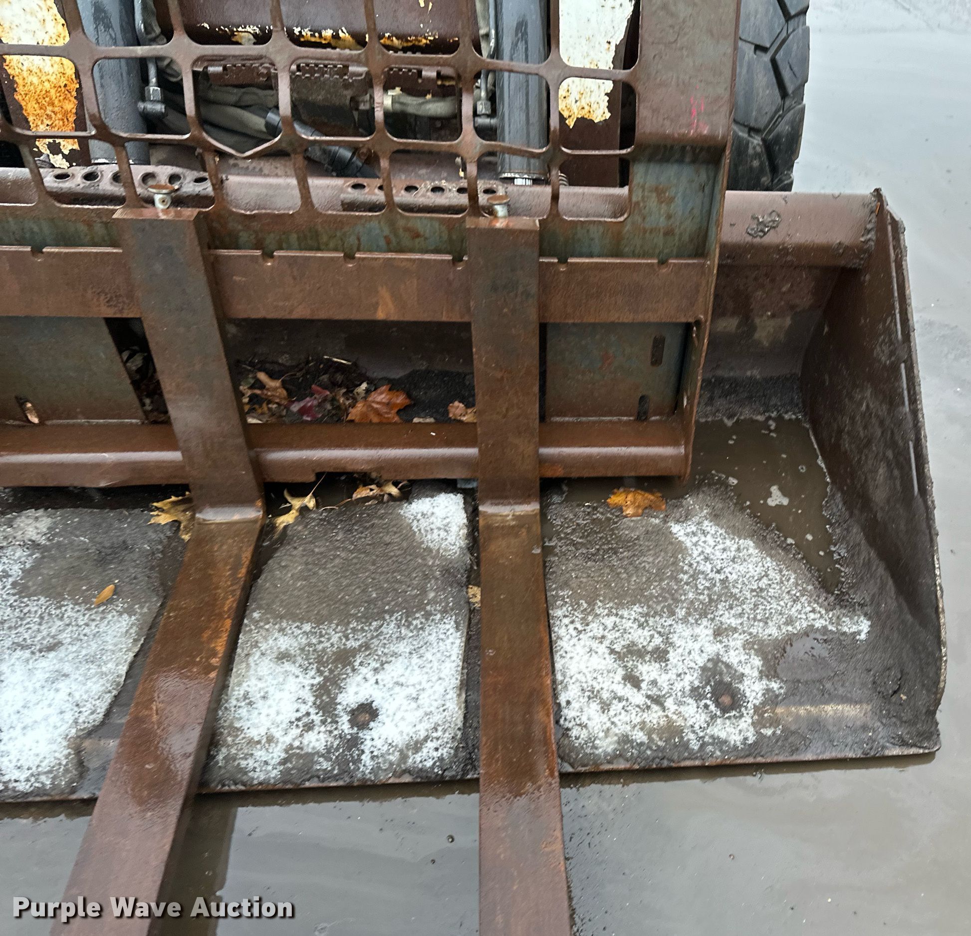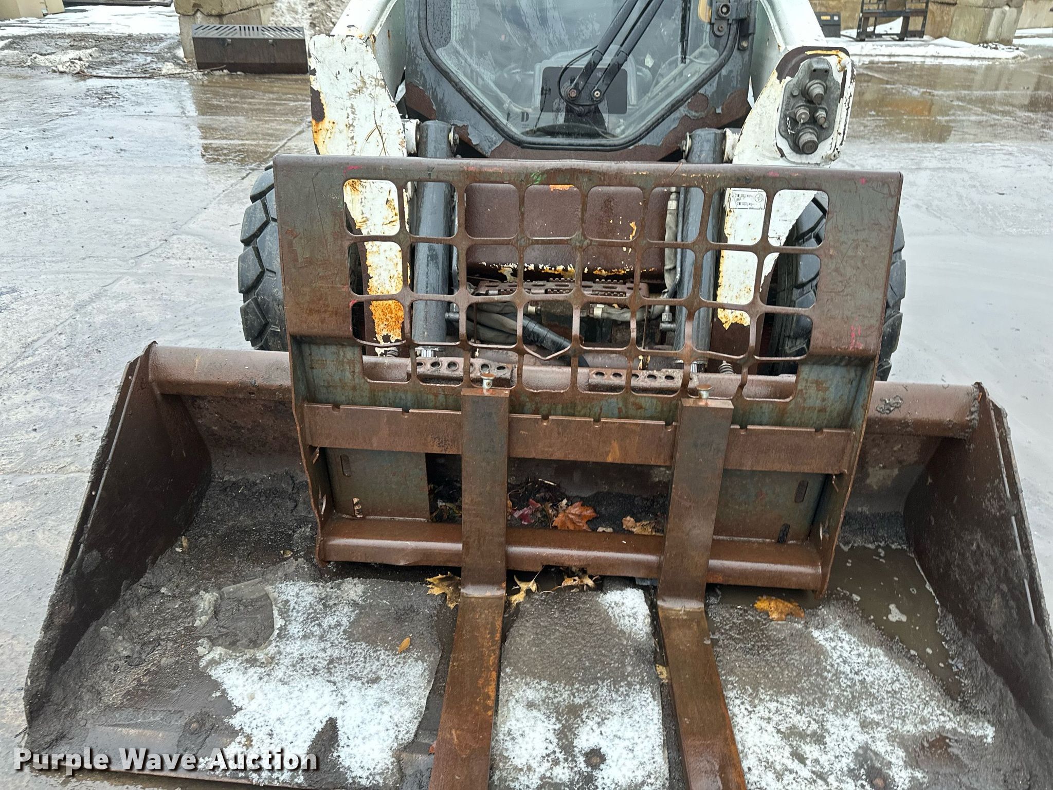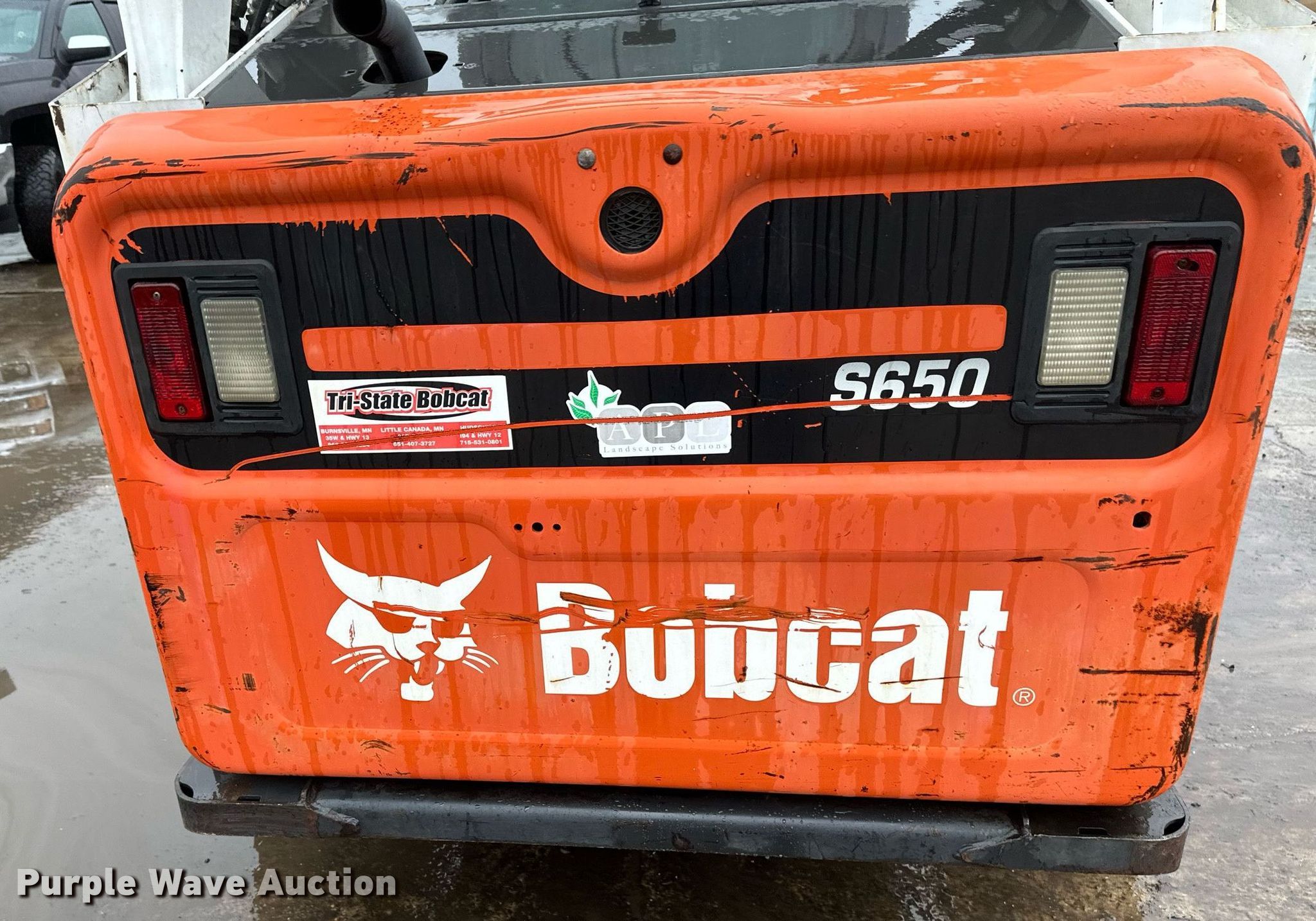 2012 Bobcat S650 skid steer loader. Hours: 2,659 on meter, Serial: A3NV16222. Engine Kubota V3307-DI-T-EU3, Displacement: 3.3L, Cylinders: 4, Fuel type: Diesel. Transmission Hydrostatic, Two speed travel. Operators station Enclosed cab, AC, Heat, Bucket control: Foot, Electronic Monitoring System panel. Features Auxiliary hydraulics, Auxiliary electrical outlet, Quick coupler: Hydraulic, Bucket Width: 73", Cutting edge: Bolt-on, Forks Length: 48". Tires Size: 12-16.6. APL Landscape, Inc. Minneapolis, MN 55420