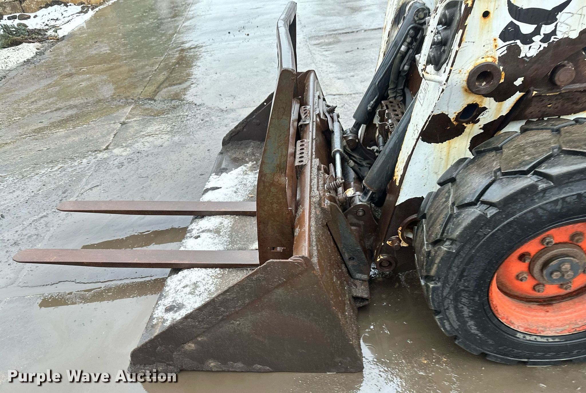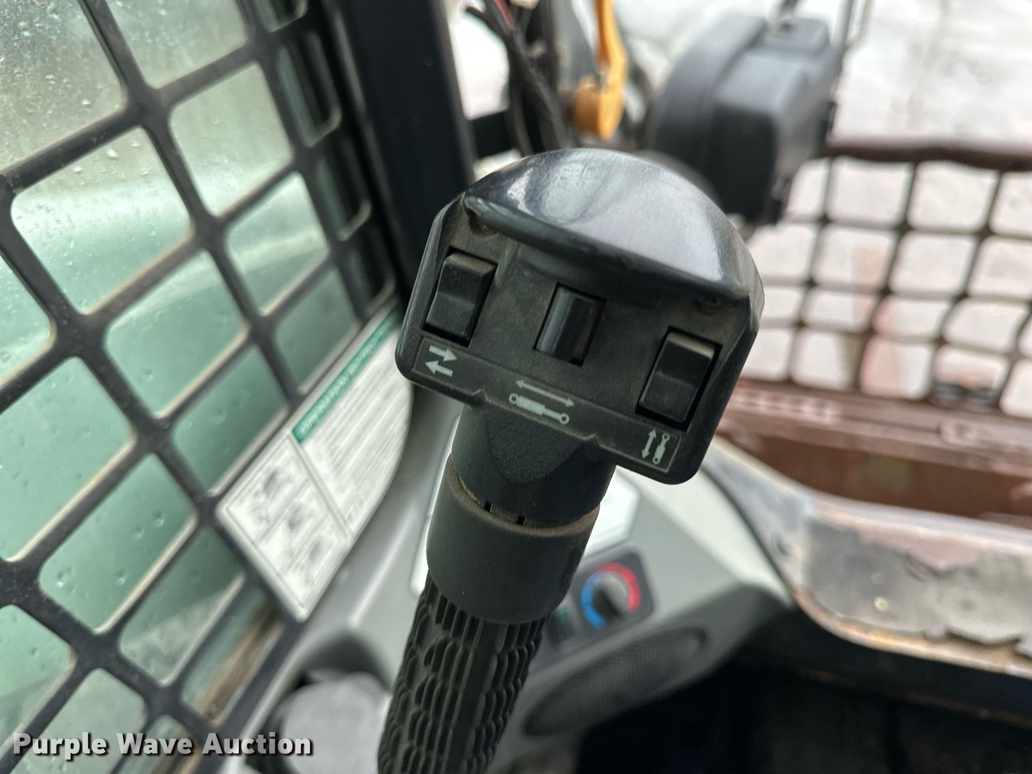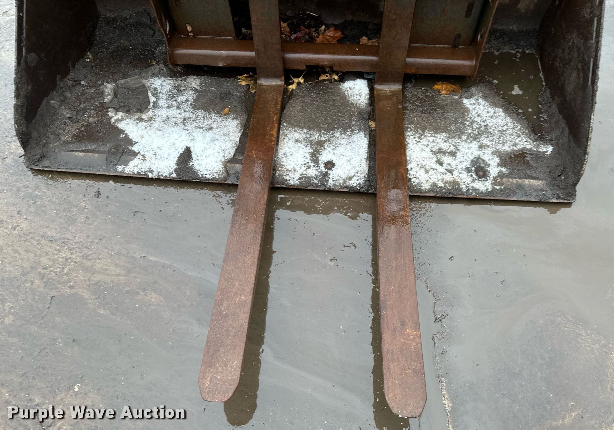 2012 Bobcat S650 skid steer loader. Hours: 2,659 on meter, Serial: A3NV16222. Engine Kubota V3307-DI-T-EU3, Displacement: 3.3L, Cylinders: 4, Fuel type: Diesel. Transmission Hydrostatic, Two speed travel. Operators station Enclosed cab, AC, Heat, Bucket control: Foot, Electronic Monitoring System panel. Features Auxiliary hydraulics, Auxiliary electrical outlet, Quick coupler: Hydraulic, Bucket Width: 73", Cutting edge: Bolt-on, Forks Length: 48". Tires Size: 12-16.6. APL Landscape, Inc. Minneapolis, MN 55420