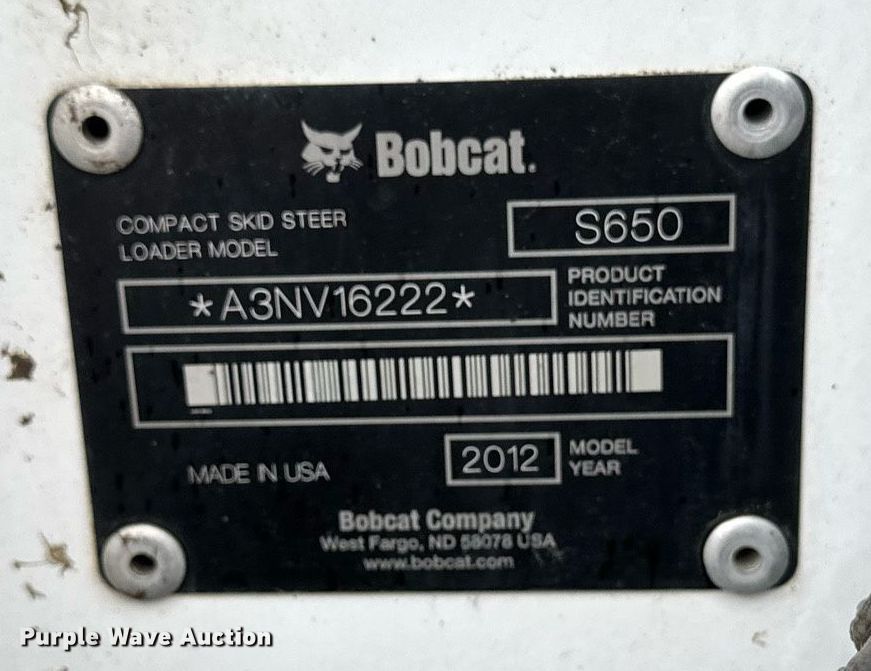 Purple Wave is selling a used Skid Steer Loader in Minnesota. This item is a 2012 Bobcat S650 skid steer loader with the following: Hours: 2,659 on meter, Serial: A3NV16222