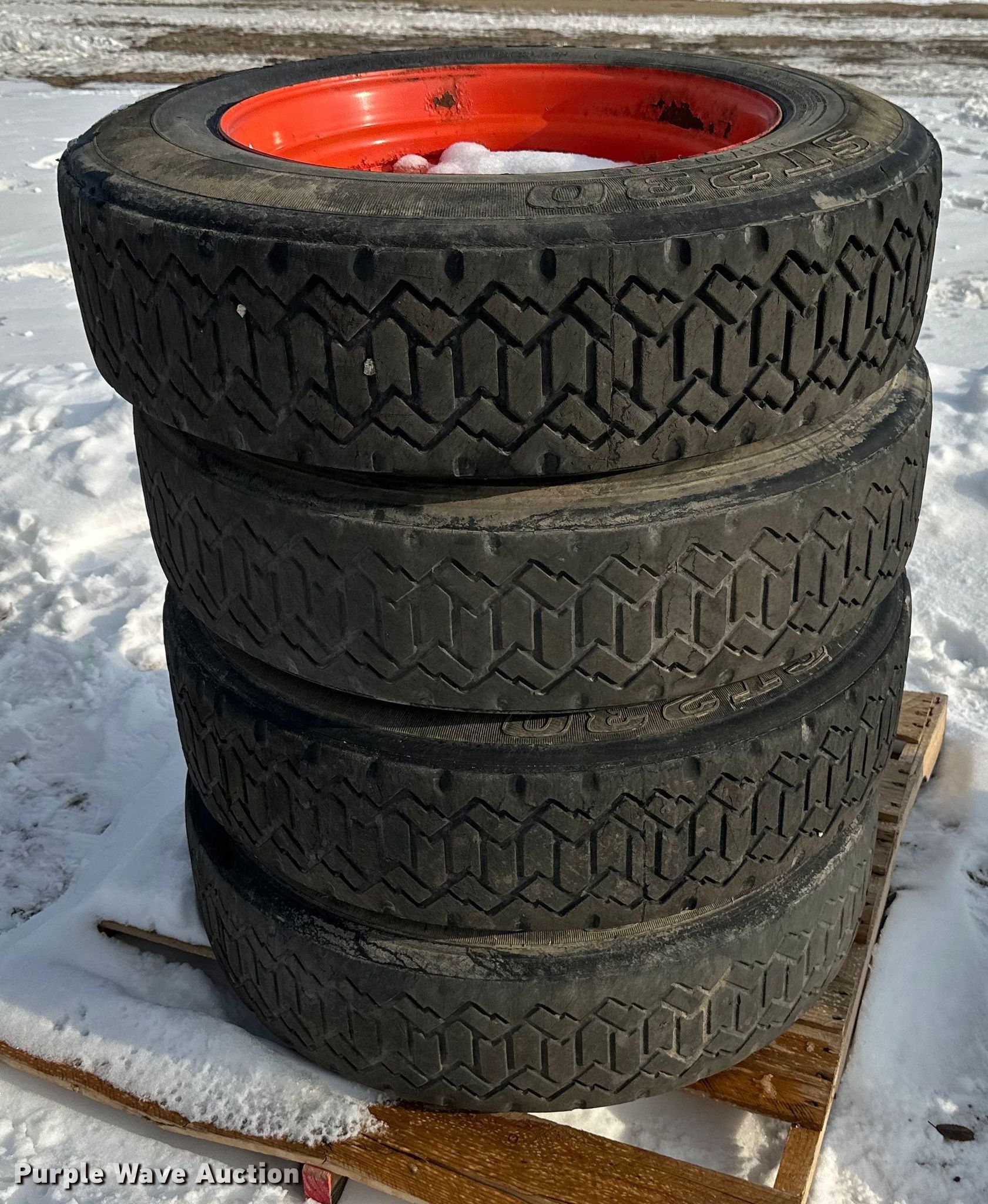 (4) 255/70R22.5 skid steer tires and wheels | SOLD! January 30 Construction Equipment Auction