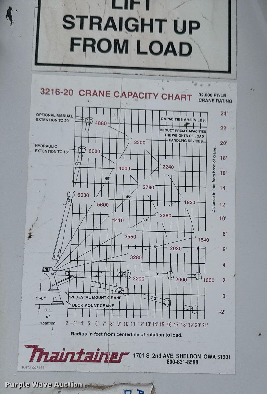 2005 Sterling Acterra utility / service truck. Miles: 388,929 on odometer, Hours: 1,894 on meter, VIN: 2FZACGCS35AU00263. Engine Mercedes Benz MBE906, Serial: 66116K008, Displacement: 6.4L, Cylinders: 6, Fuel type: Diesel, Engine brake. Transmission Eaton Fuller, Manual, Speed: 6. Chassis Axles: Single, Suspension: Spring. Interior AC, Heat, Heated mirrors, Cruise control. Features Bed 12' L x 94" W, Air compressor, Crane Maintainer 3220, Maximum boom length: 23' Maximum lift capacity: 6,000 lbs.. Tires Size: 265/75R22.5. Notes Rust damage. Oklahoma title. Title distribution may be delayed up to 30 days from verification of funds. Collinsville, OK 74021