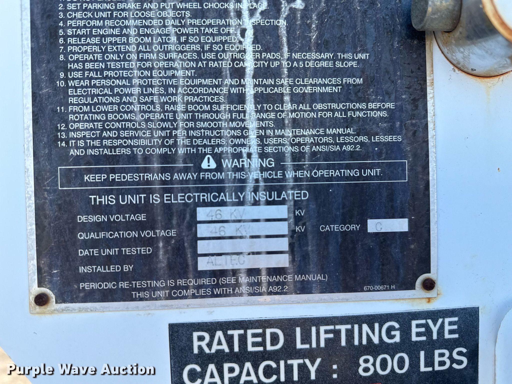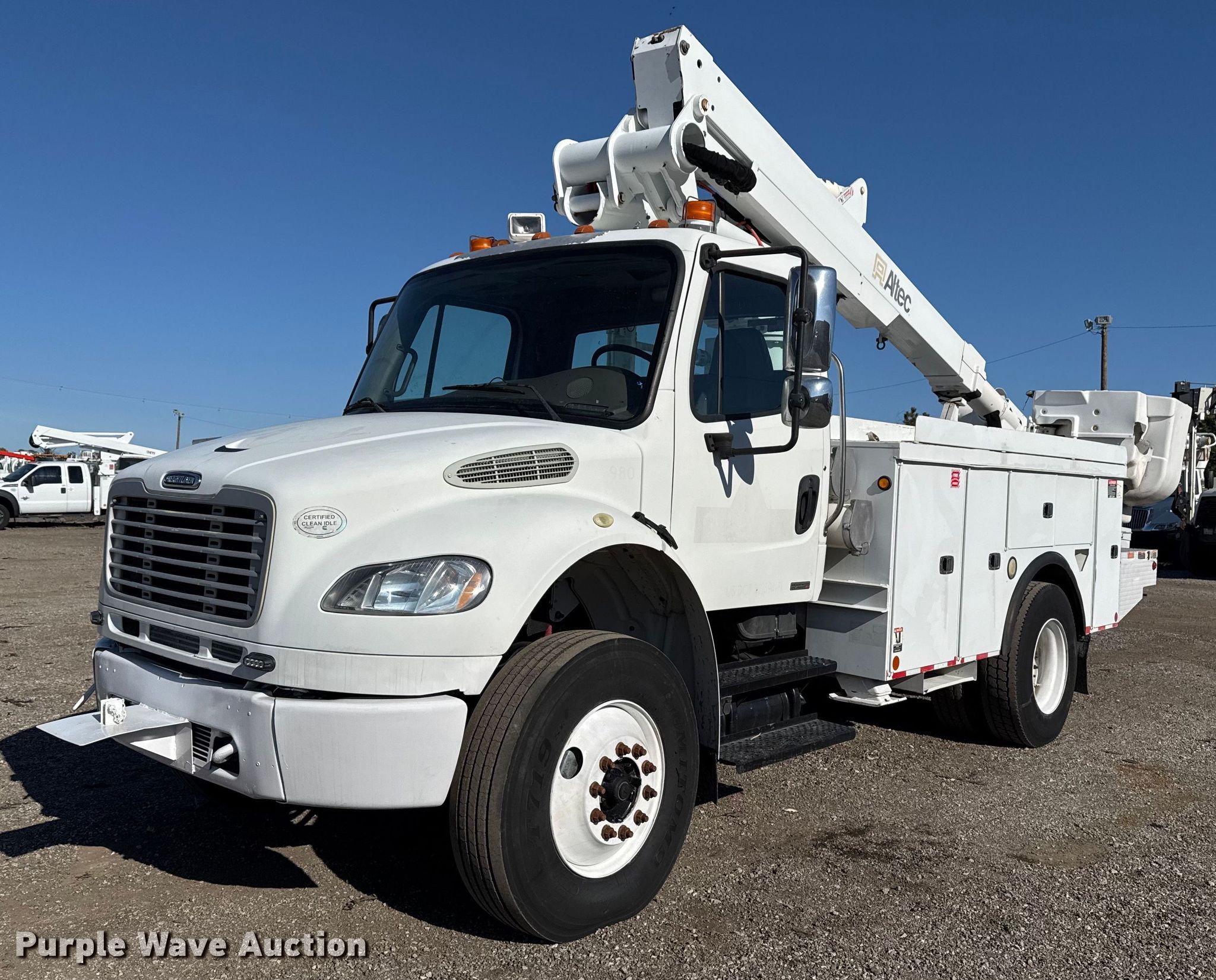 2009 Freightliner Business Class M2 bucket truck. Miles: 258,742 on odometer, Engine hours: 15,367 on meter, VIN: 1FVACYBS89HAE5813. Engine Cummins ISC, Displacement: 8.3L, Cylinders: 6, Fuel type: Diesel. Transmission Automatic. Chassis Axles: Single, Suspension: Spring, Brakes: Air, GVWR: 35,000 lbs. Interior AC, Heat, Cruise control. Features Bed Altec, 14' L x 93" W, Boom Altec TA41M, Serial: 0708CL1342, Maximum lift capacity: 350 lbs, Maximum lift height: 40', Boom type: Articulating, Insulated, Telescopic, Man basket, Boom controls Platform/ basket, Material handler. Tires Size: 11R22.5. Notes Windshield chipped or cracked. Oklahoma title. Title distribution may be delayed up to 14 days from verification of funds. Collinsville, OK 74021