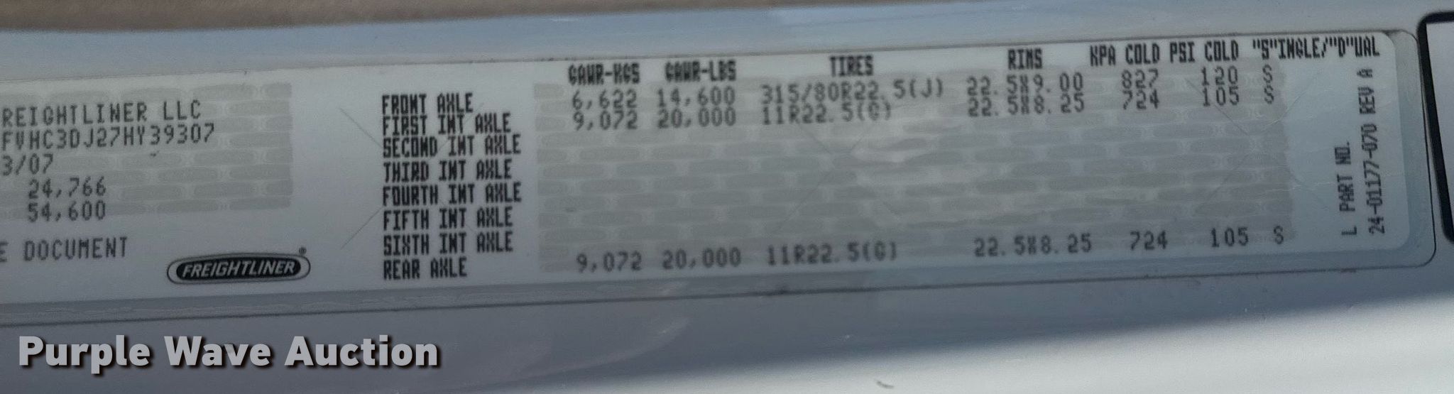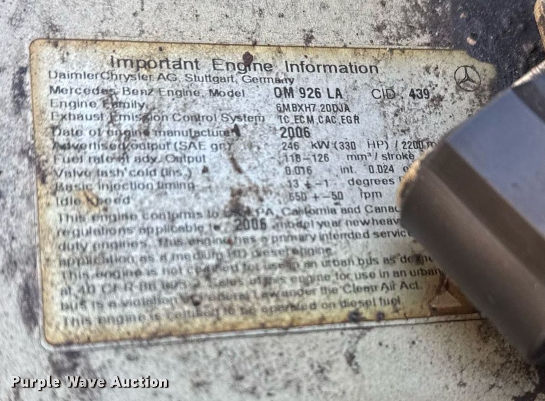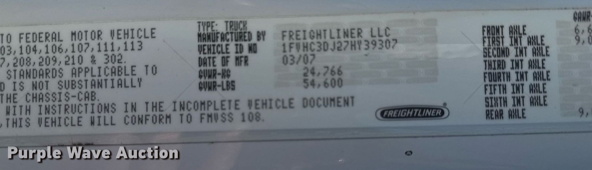 2007 Freightliner Business Class M2 Ext. Cab crane truck. Miles: 198,993 on odometer, Hours: 15,721 on meter, VIN: 1FVHC3DJ27HY39307. Engine Mercedes Benz OM926LA, Displacement: 439 C.I.D., Cylinders: 6, Fuel type: Diesel, HP: 330, kW: 246. Transmission Automatic. Chassis Axles: Tandem, Differential lock: Inter-axle, Suspension: Air, Brakes: Air, PTO, GVWR: 54,600 lbs FAWR: 14,600 lbs, IAWR: 20,000 lbs, RAWR: 20,000 lbs. Interior AC, Heat, Heated mirrors, Cruise control. Features Utility bed 16' 10" L x 96" W, Crane 2007 Palfinger PK12000 Serial: 100060076, Boom Telescopic, Knuckle, Sections: 3, Boom controls Ground.. Notes Rust damage. Oklahoma title. Title distribution may be delayed up to 14 days from verification of funds. Collinsville, OK 74021