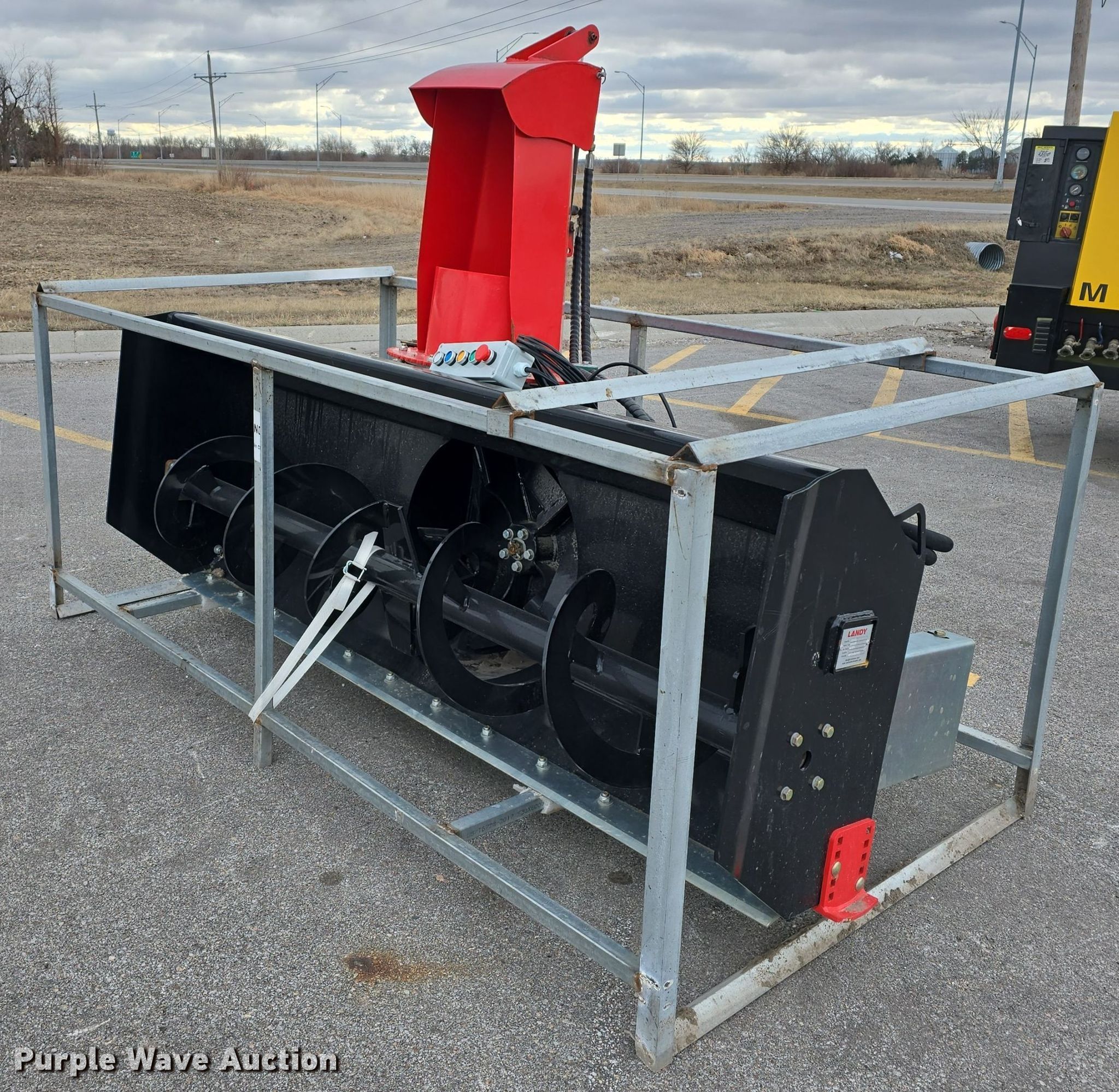 Purple Wave is selling a used Skid Steer Attach. in Nebraska. This item is a 2023 Landy HSB72 skid steer snow blower with the following: Serial: RBUSLA24041819, Width: 72", Tethered remote