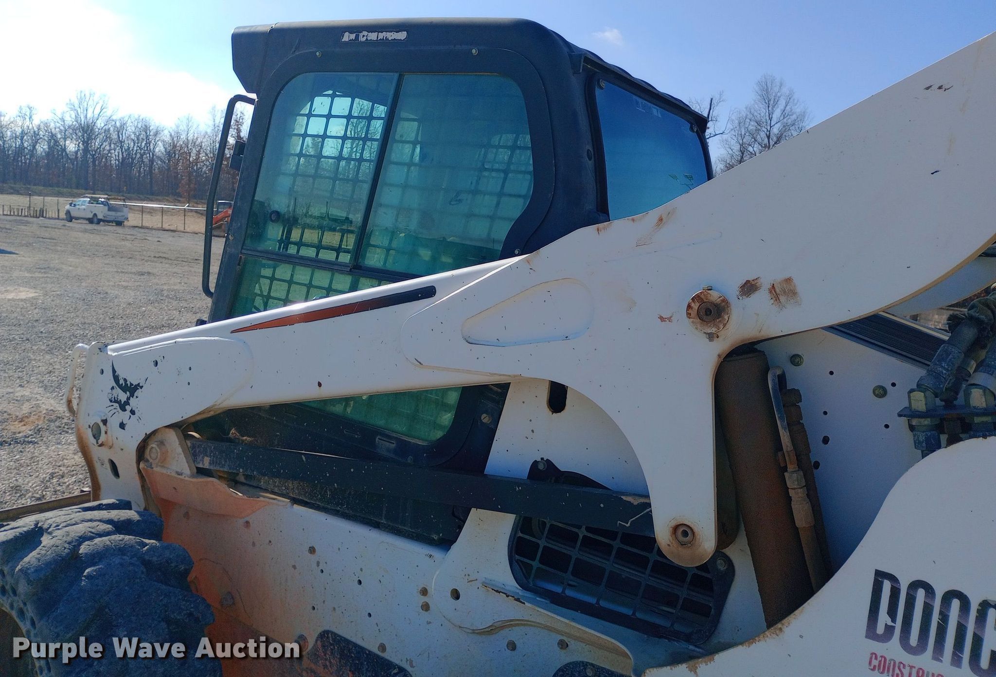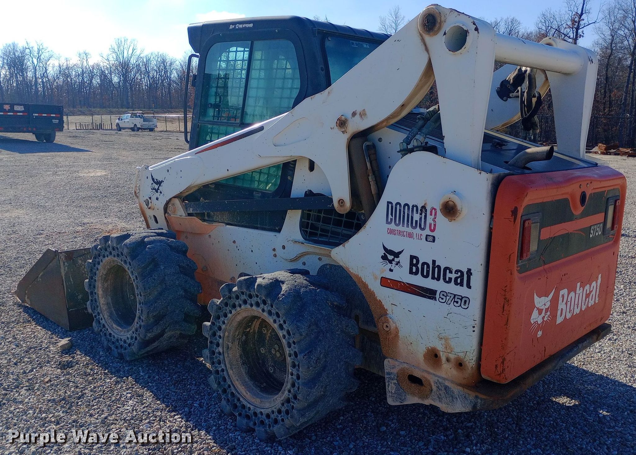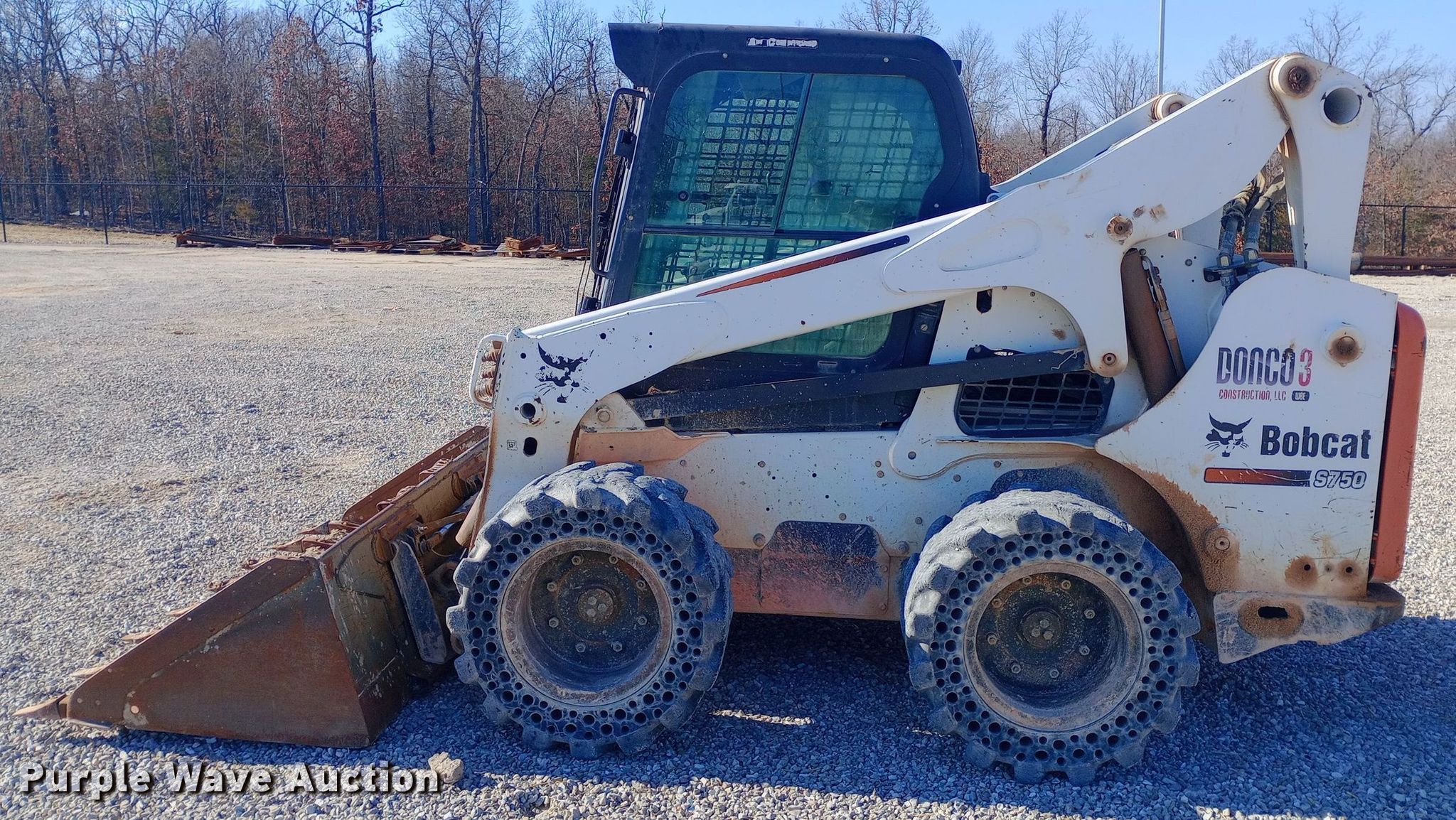 2011 Bobcat S750 skid steer loader. Hours: 4,264 on meter, Serial: A3P211203. Engine Cylinders: 4, Fuel type: Diesel. Transmission Hydrostatic, Two speed travel. Operators station Enclosed cab, AC, Heat, Bucket control: Foot. Features Auxiliary hydraulics, Quick coupler: Manual, Bucket Width: 79", Teeth: Bolt-on. Tires Size: 32.5x15-16, Solid. Donco 3. Marshfield, MO 65706