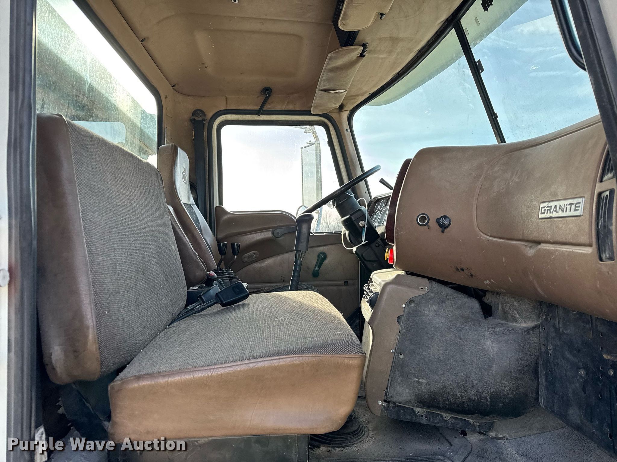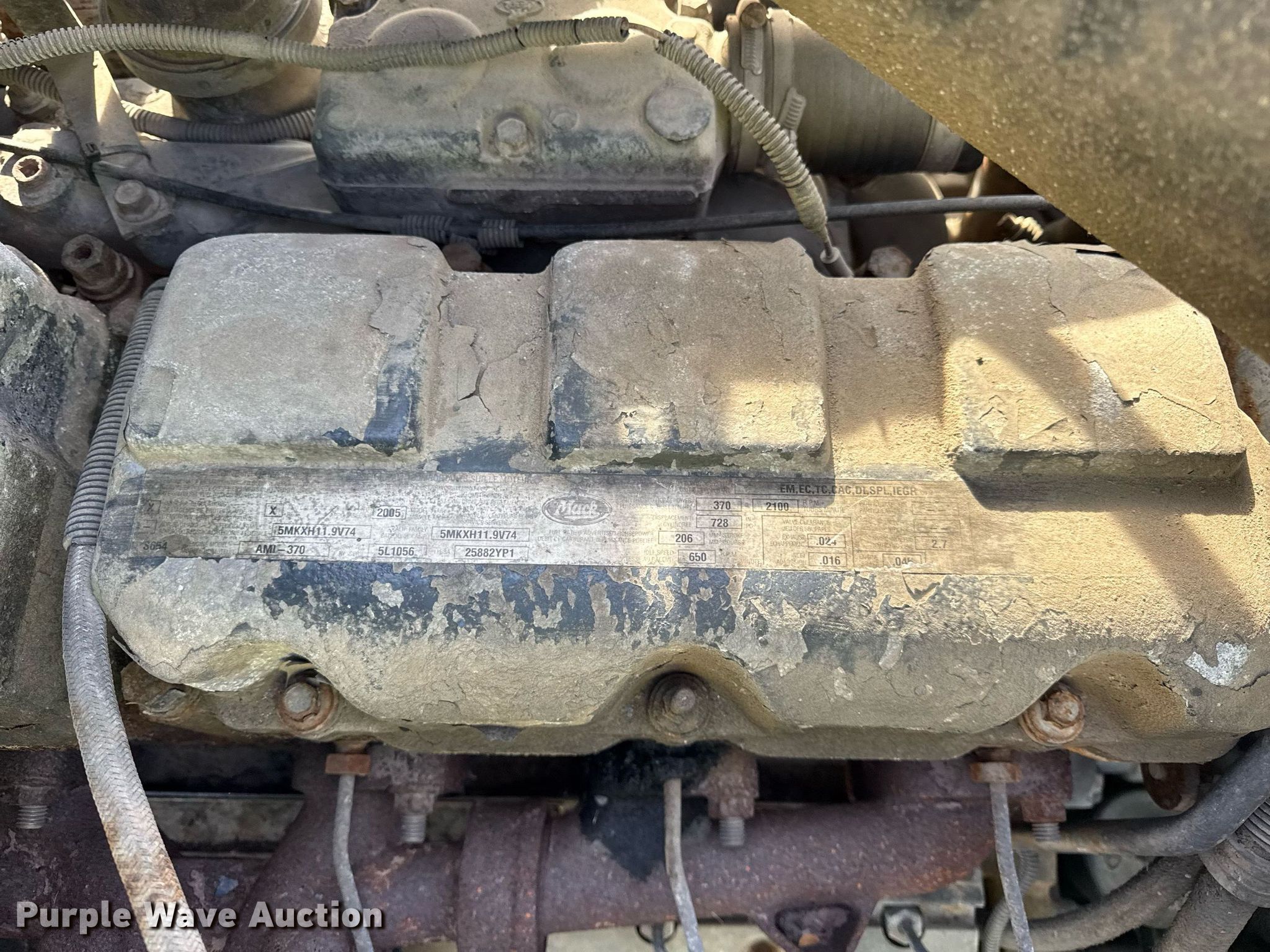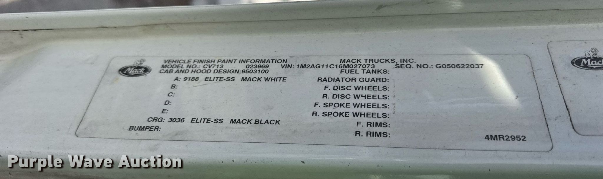 2006 Mack CV713 Granite roll-off container truck. Miles: 556,317 on odometer, Hours: 26,416 on meter, VIN: 1M2AG11C16M027073, Unit #: 83904224. Engine Mack AMI 370, Displacement: 11.9L, Cylinders: 6, Fuel type: Diesel. Transmission Mack Maxitorque ES, Manual, Speed: 10. Chassis Axles: Tandem, Pusher axle, Suspension: Camelback, Brakes: Air, PTO, GVWR: 60,540 lbs. Interior AC, Heat, Cruise control. Features Roll-off bed Galbreath U5-OR-174, 23', Winch. Tires Front: 385/65R22.5, Rear: 11R22.5, Lift axle: 11R22.5. Notes Front passenger tire air leak, Driver rear tire flat, Passenger lift axle wheel missing, lug nuts included, Engine bay air leak, Driver side hydraulic cylinder leak, Unknown operating condition of tarp. Secured storage hosted by a Copart facility. Please review REQUIRED REMOVAL INSTRUCTIONS.. Titles will be distributed after confirmation of payment and removal. Wisconsin title. Title distribution may be delayed up to 30 days from verification of funds. Milwaukee, WI 53224