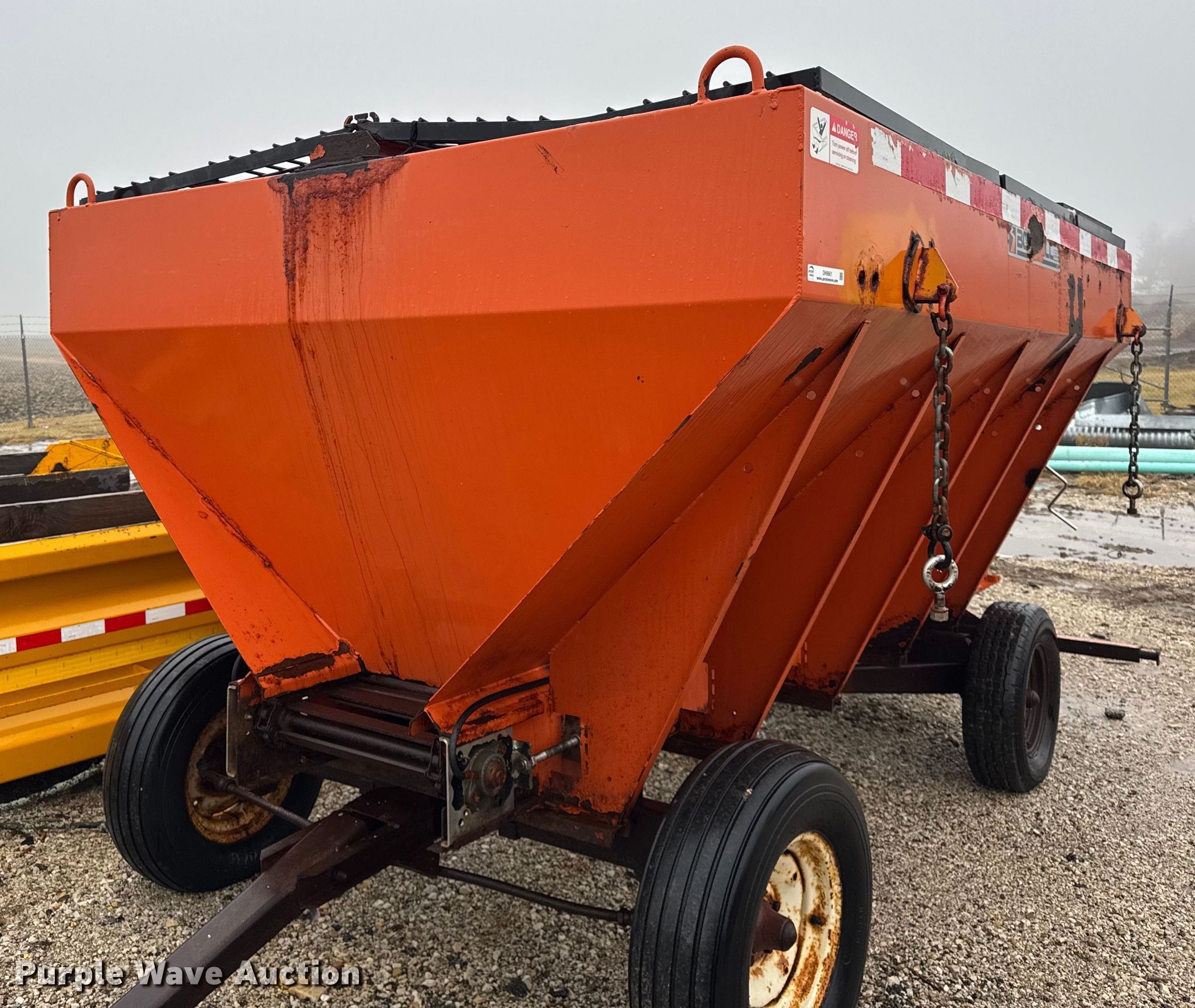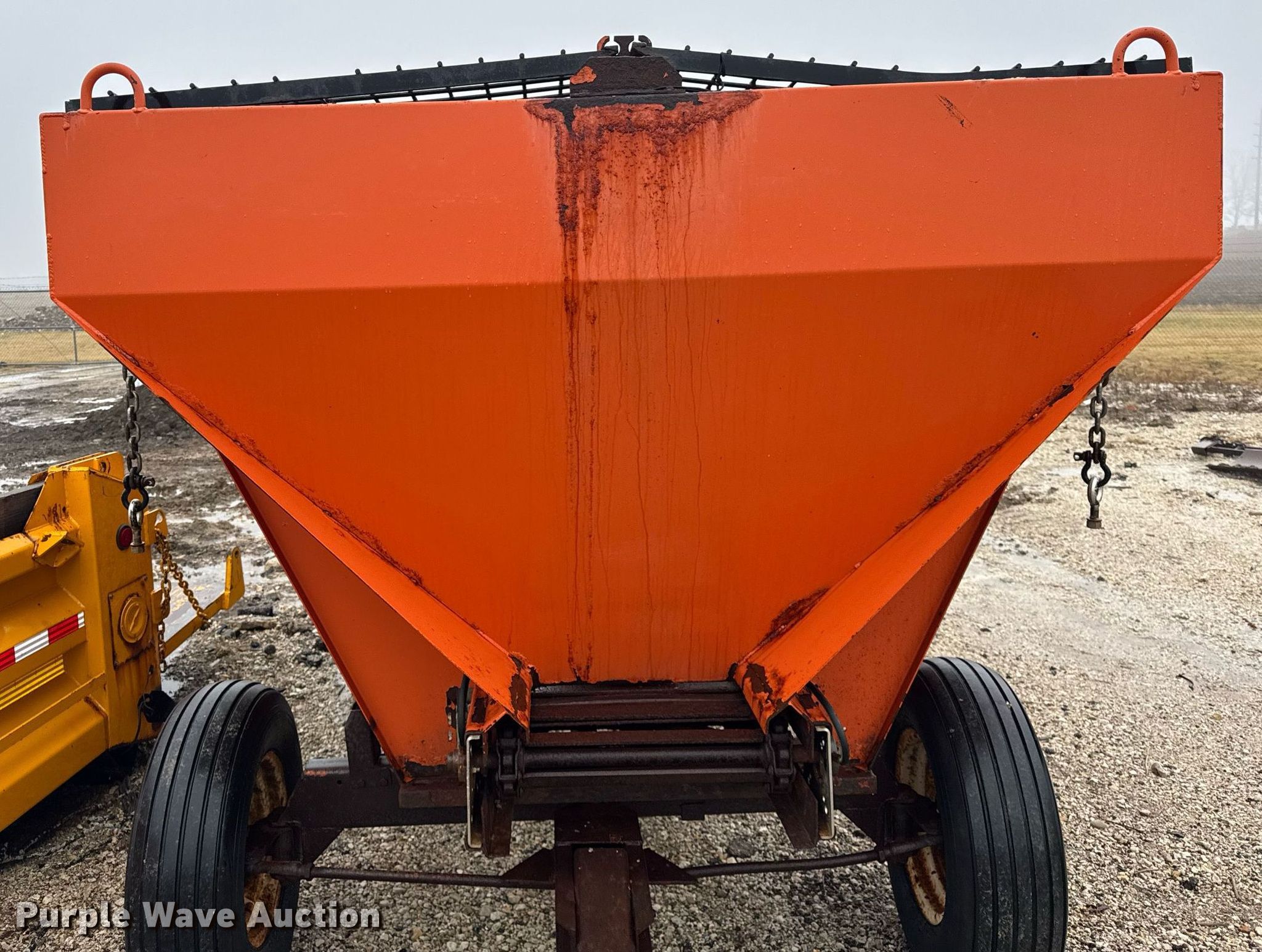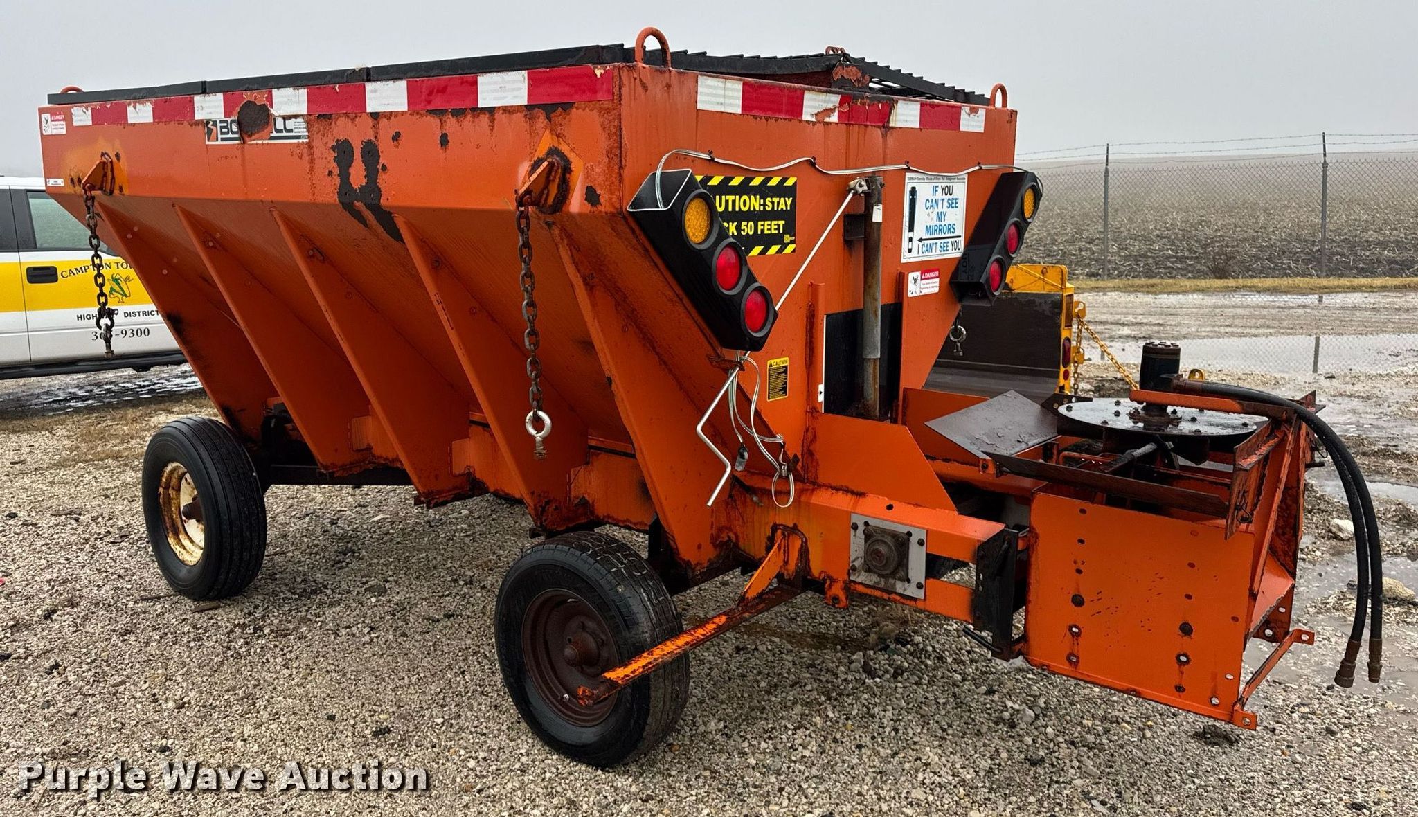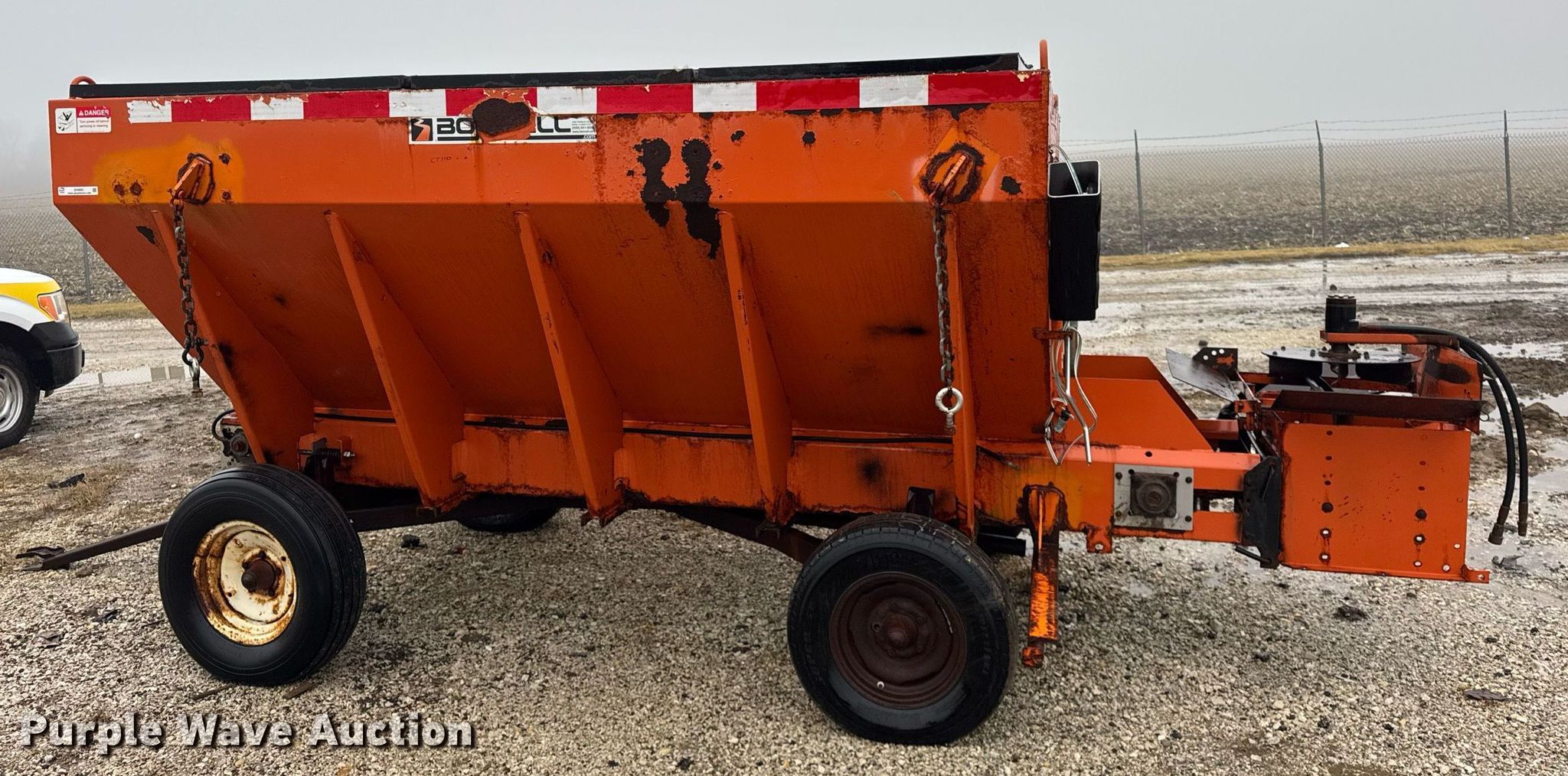 Bonnell BV-1056-CS-625 spreader. Serial: 2254. Features 10' L x 82" W, Bed type: Steel, Conveyor: 18" W. Notes Running gear not included. Campton Township Highway Dept. - Open Inspection is on January 23, 2025. Maple Park, IL 60151