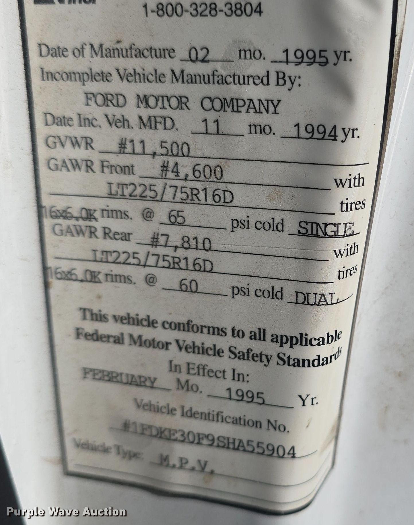 1995 Ford E350 ambulance. Miles: 116,859 on odometer Actual mileage unknown, Hours: 3,844 on meter, VIN: 1FDKE30F9SHA55904. Engine Displacement: 7.3L, Cylinders: 8, Fuel type: Diesel. Transmission Automatic. Chassis Axles: Single, Suspension: Spring, Brakes: Hydraulic, GVWR: 11,500 lbs, Wheelbase: 160". Interior AC, Heat, Power windows, Power locks, Cruise control, Auxiliary controls. Features Ambulance body Oxygen hookups. Tires Size: 225/75R16. Notes Windshield chipped or cracked, Decals will be removed prior to auction, Radio, oxygen gauges, oxygen holders, and safe not included. Kansas title. Mileage has not been verified. Exempt will be written in the odometer disclosure on the title. Bennington, KS 67422