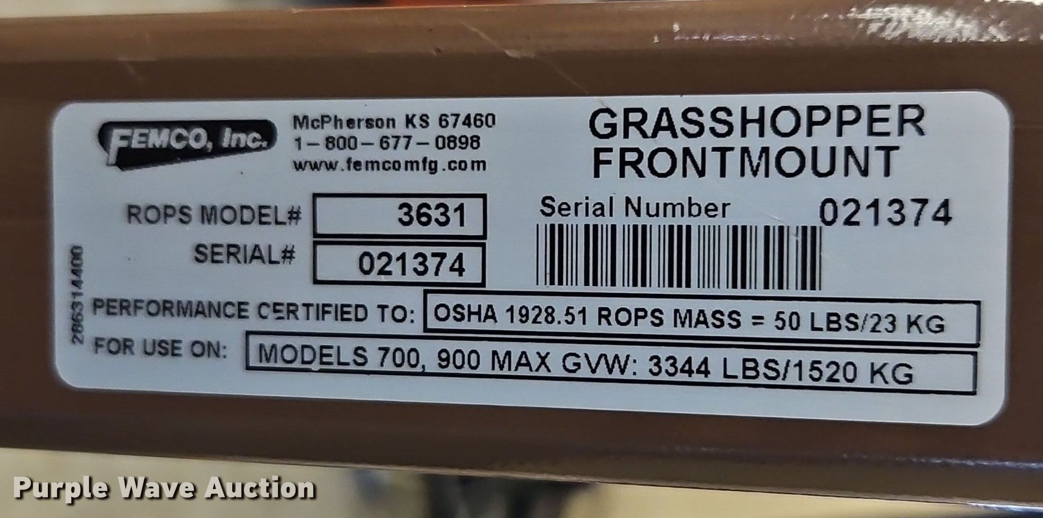 2009 Grasshopper 729T6 ZTR lawn mower. Hours: 1,575 on meter, Serial: 5915231, Cutting width: 62", Serial: 5915231. Engine Kubota, Cylinders: 3, Fuel type: Gas. Transmission Hydrostatic. Operators station OROPS. Features Hydraulic front deck lift. Tires Front: 22x11.00-10, Rear: 13x6.50-6. Louisburg, KS 66053