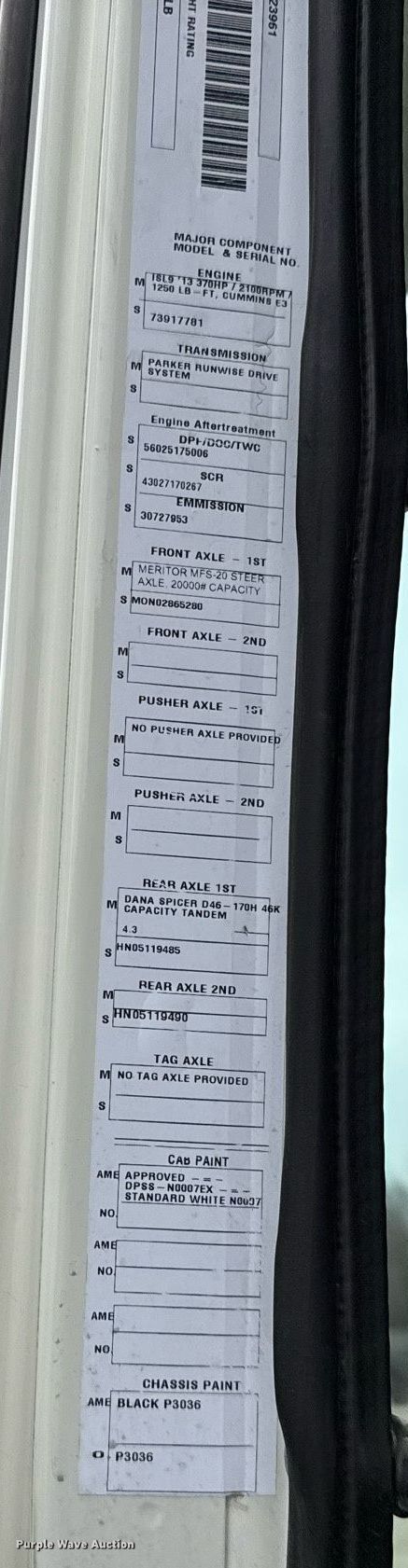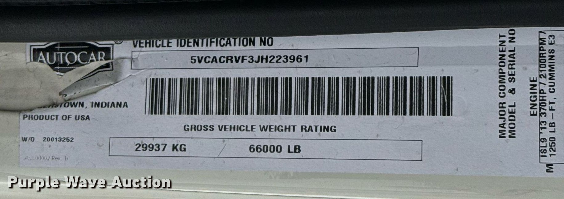 2018 Autocar ACX Xpeditor refuse truck. Miles: 98,701 on odometer, Engine hours: 8,668 on meter, VIN: 5VCACRVF3JH223961, Unit #: 54209. Engine Cummins, Displacement: 9.0L, Cylinders: 6, Fuel type: Diesel. Transmission Automatic. Chassis Axles: Tandem, Suspension: Spring over walking beam, Brakes: Air, PTO, GVWR: 66,000 lbs. Interior AC, Heat, Heated mirrors, Cruise control, Backup camera. Features Refuse bed Heil 612-3611, Serial: 7S7305944, Capacity: 28 cu.yd., Load: Side, Cart tipper. Tires Front: 315/80R22.5, Rear: 12R22.5. Notes Windshield chipped or cracked. Texas title. Title distribution may be delayed up to 30 days from verification of funds. City of New Braunfels. New Braunfels, TX 78130