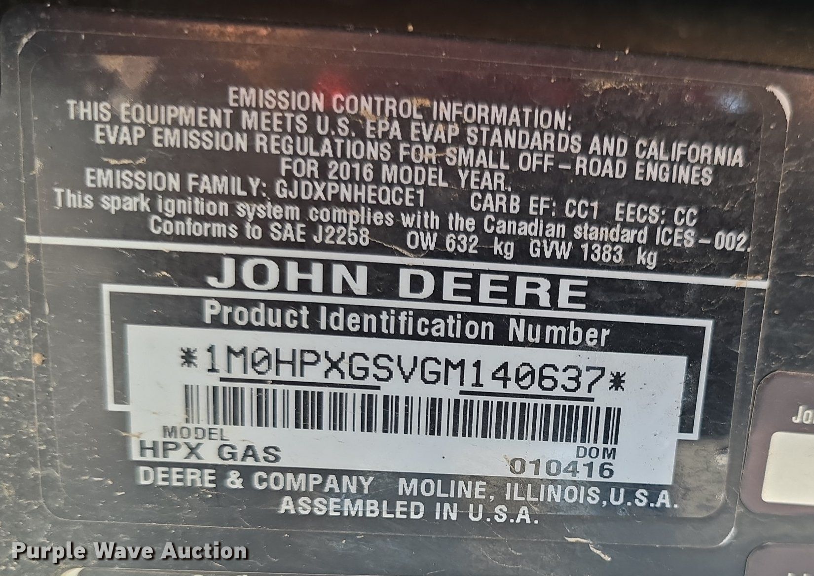 Purple Wave is selling a used Utility Vehicle in Kansas. This item is a 2016 John Deere HPX Gator utility vehicle with the following: Hours: 1,056 on meter, VIN: 1MOHPXGSVGM140637