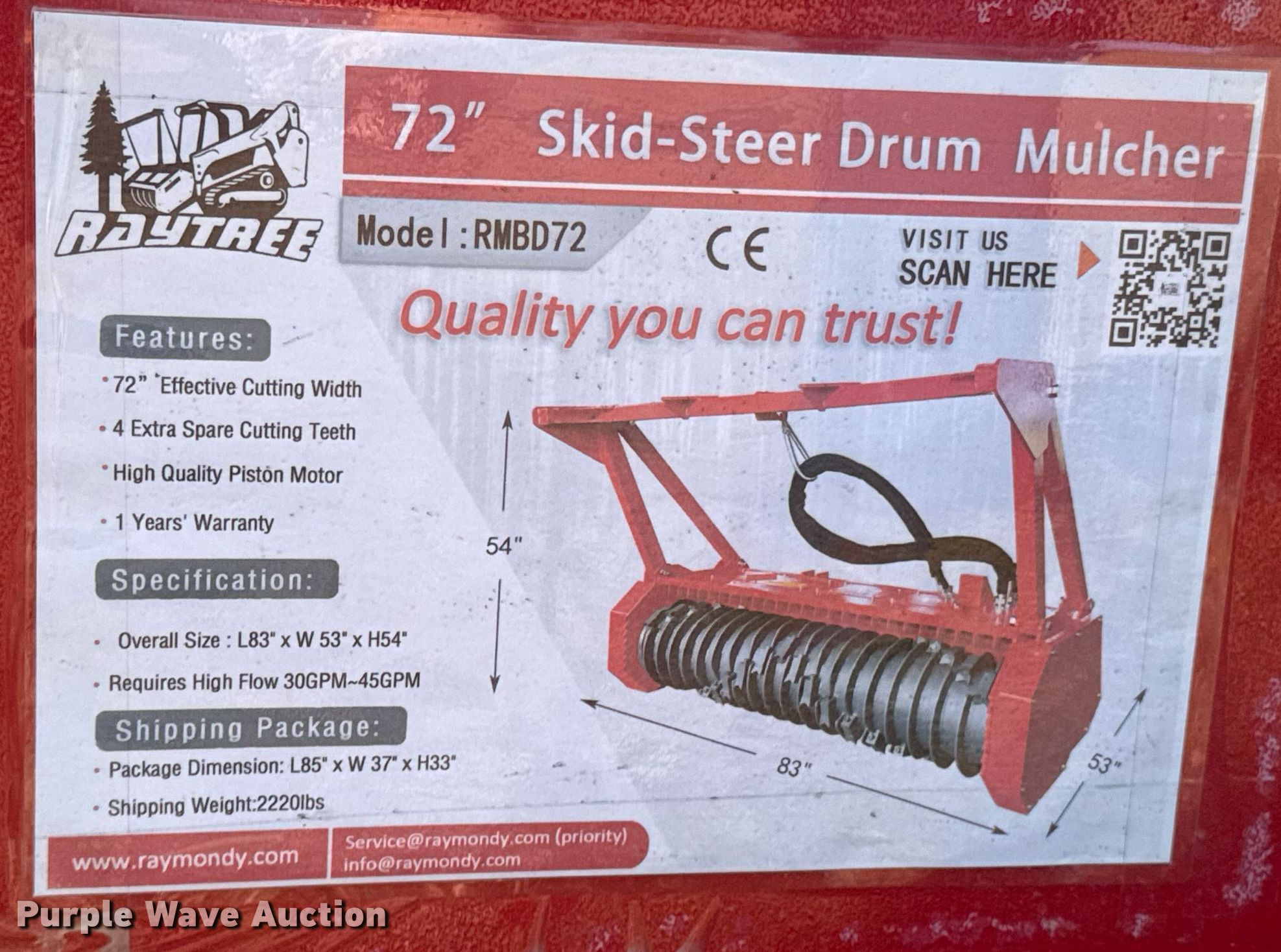 This Raytree RMBD72 skid steer mulcher will sell to the highest bidder regardless of price.