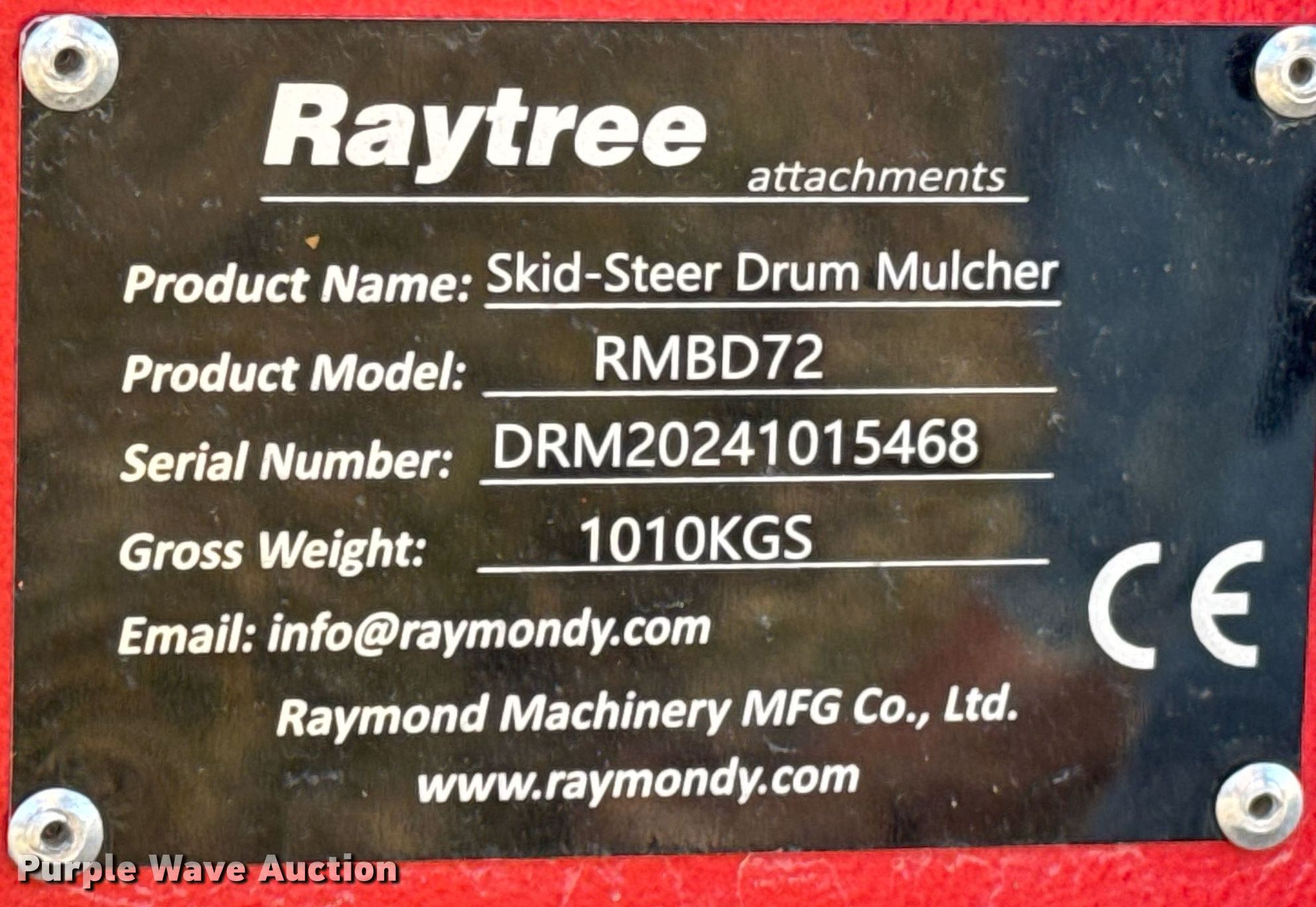 Purple Wave is selling a used Skid Steer Attach. in Kansas. This item is a Raytree RMBD72 skid steer mulcher with the following: Serial: DRM20241015468, Width: 72"