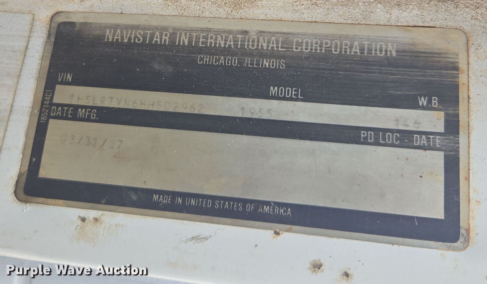 1987 International 1955 fertilizer delivery truck. Miles: 5,329 on odometer Actual miles unknown, VIN: 1HSLRTVN6HH502962. Engine International, Displacement: 7.6L, Cylinders: 6, Fuel type: Diesel. Transmission Automatic. Chassis Axles: Single, Suspension: Spring, Brakes: Air, PTO. Interior Heat. Features Tank bed 10' L, Capacity: 1,600 gallons. Tires Size: 11R22.5. Notes Possible ignition switch issues, Tank issues, slow leak, Dead battery. Indiana title. Mileage has not been verified. Exempt will be written in the odometer disclosure on the title. Title distribution may be delayed up to 30 days from verification of funds. Keystone Cooperative. Bremen, IN 46506
