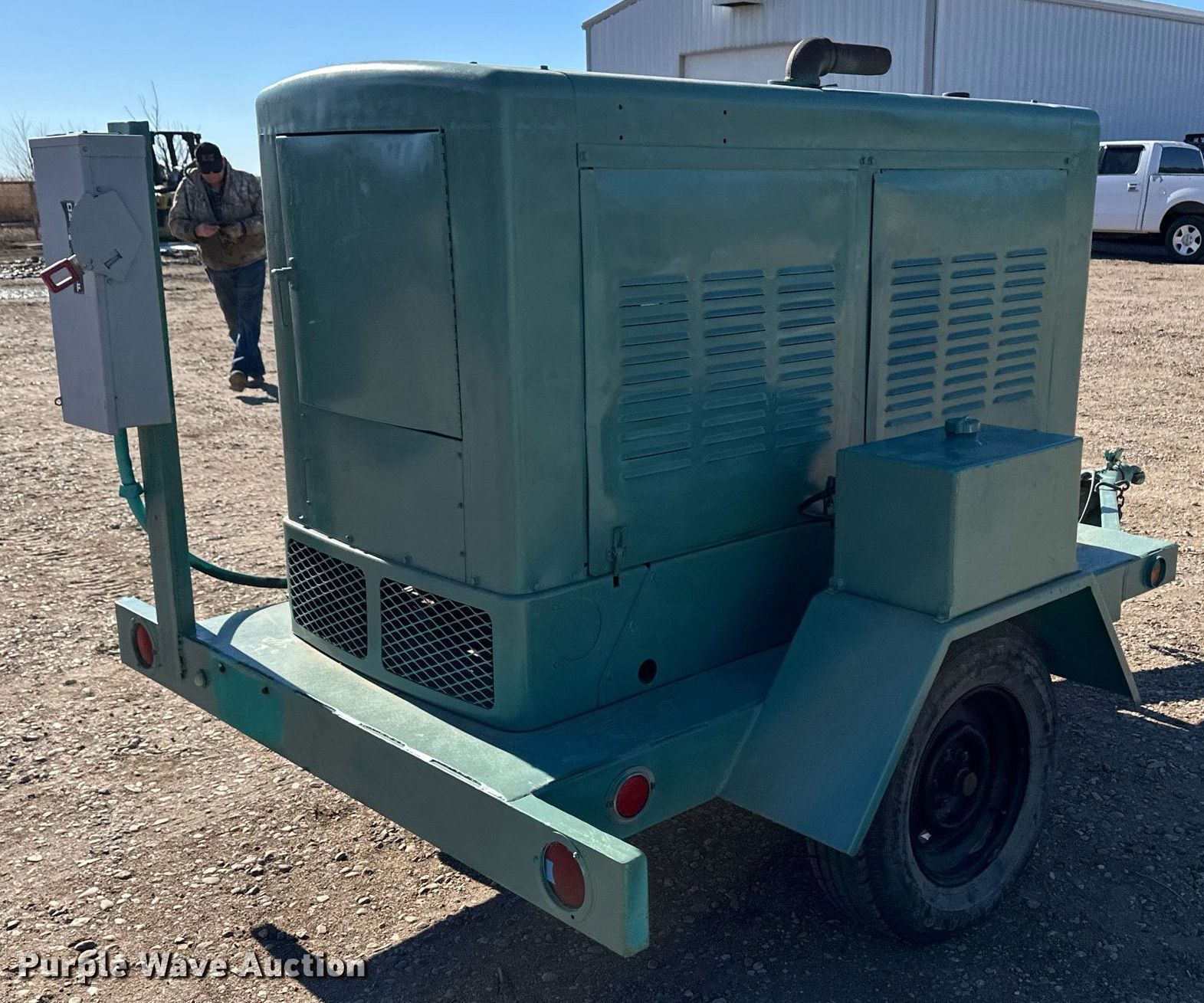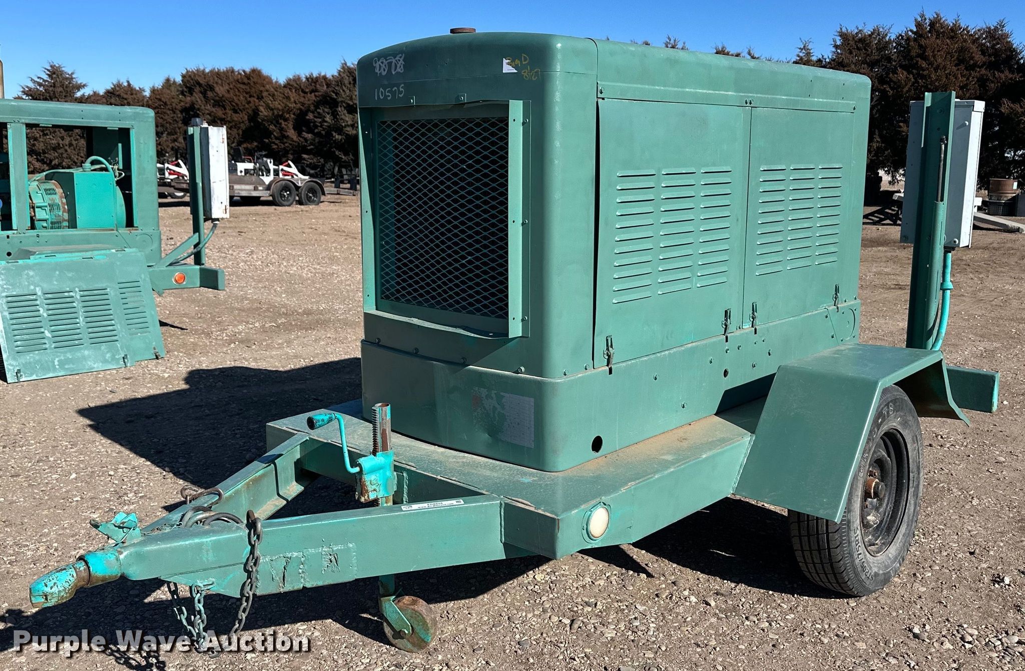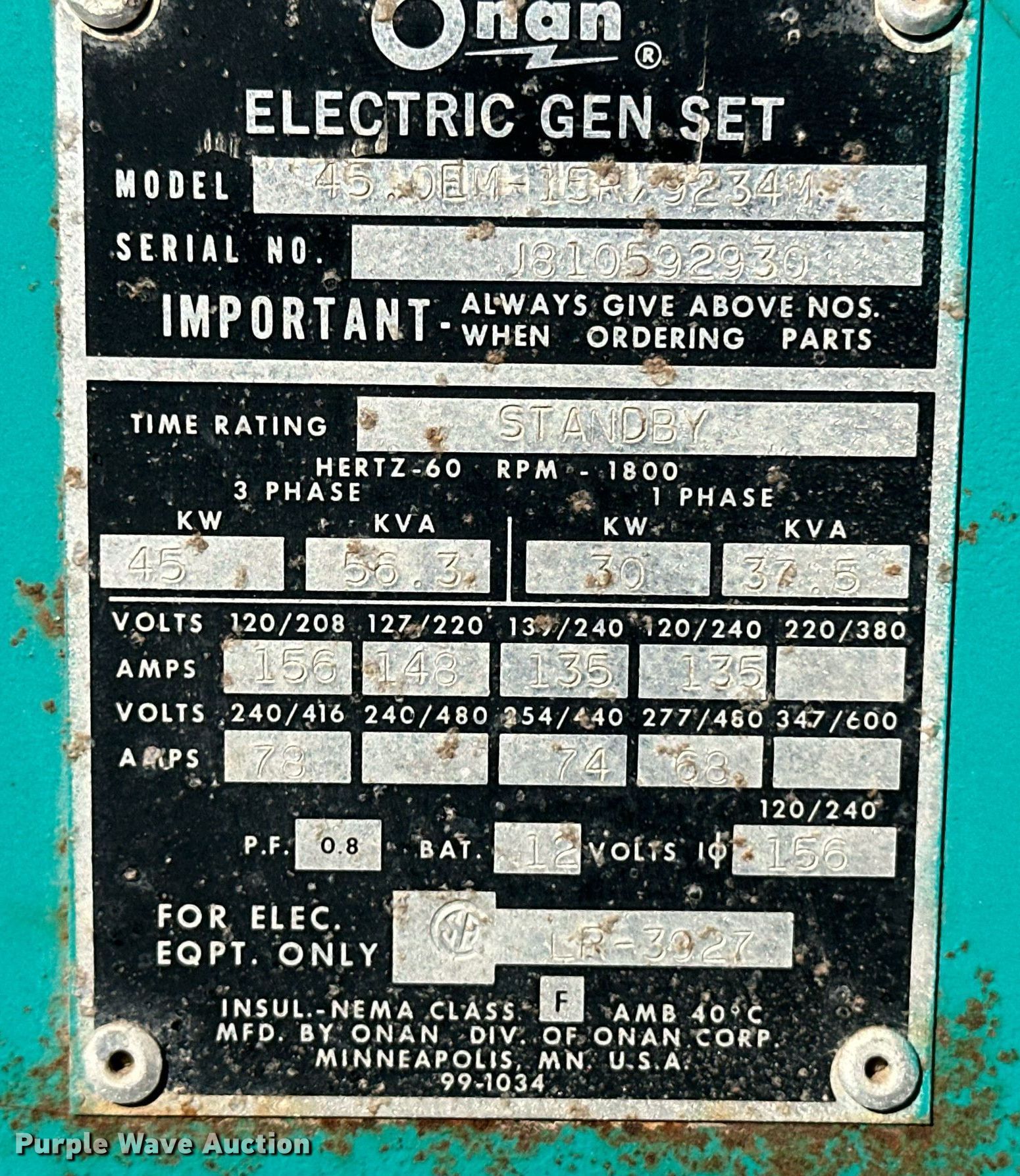 Onan generator. Hours: 8,856 on meter, Serial: J810592930. Engine Cylinders: 6, Fuel type: LPG. Features Generator kVA: 56.3, kW: 45, Phase: Single, Three, Electric start, Fuel tank. Trailer 11' L x 72" W, Ball hitch size: 2", Suspension: Spring, Axles: Single, Tire size: 205/75R15. This is worksite support equipment and will not come with a title. Transfer of ownership documentation will be a bill of sale. Sublette, KS 67877