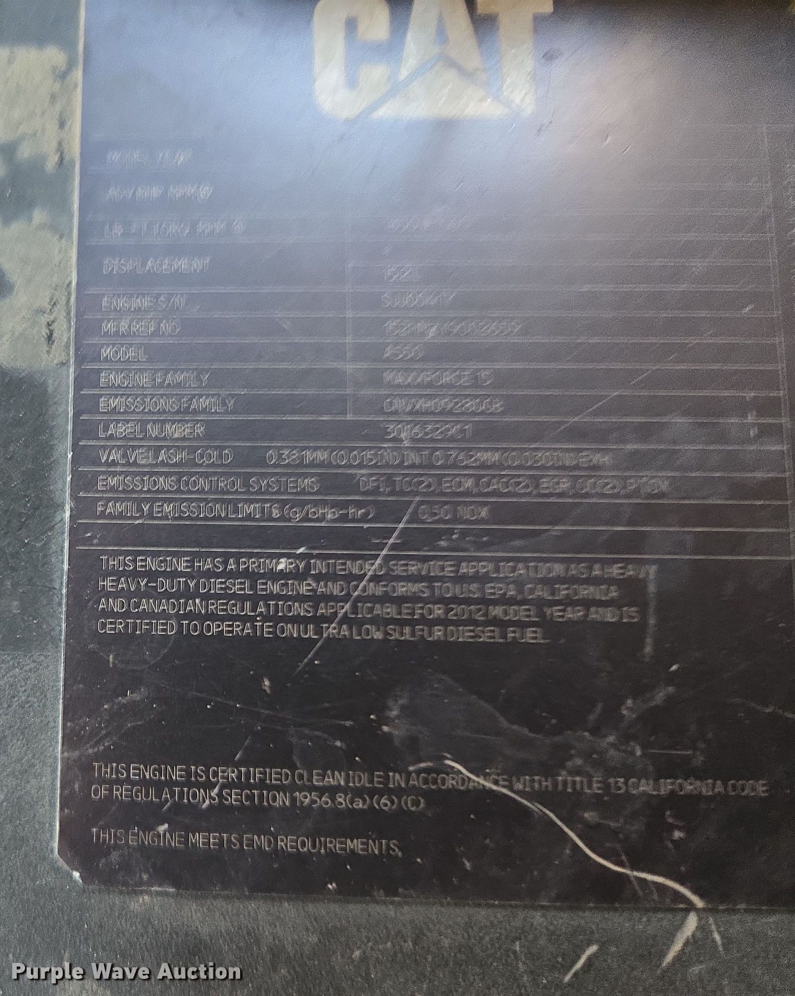 2014 Caterpillar CT660L semi truck. Miles: 288,416 on odometer, VIN: 1HSJKTLT0EJ483066, Unit #: 555. Engine Caterpillar CT15, Displacement: 15.2L, Cylinders: 6, Fuel type: Diesel, CNG, Engine brake. Transmission Eaton Fuller, Manual, Speed: 13. Chassis Axles: Tandem, Differential lock: Full, Suspension: Air Dump valves, Brakes: Air, GVWR: 58,600 lbs FAWR: 13,200 lbs, IAWR: 22,700 lbs, RAWR: 22,700 lbs. Interior AC, Heat, Heated mirrors, Power windows, Power locks, Cruise control, Air ride cab. Features Deck plate: Aluminum, Fifth wheel type: Air operated, Sliding, Fuel tank: Single. Tires Front: 11R22.5, Rear: 295/75R22.5. Notes Dash warning indicator: Check engine, Windshield chipped or cracked, Possible engine issues, coolant leaks from exhaust. Arizona title. Title distribution may be delayed up to 14 days from verification of funds. M&P Venture Partners Demolition, LLC. Phoenix, AZ 85043