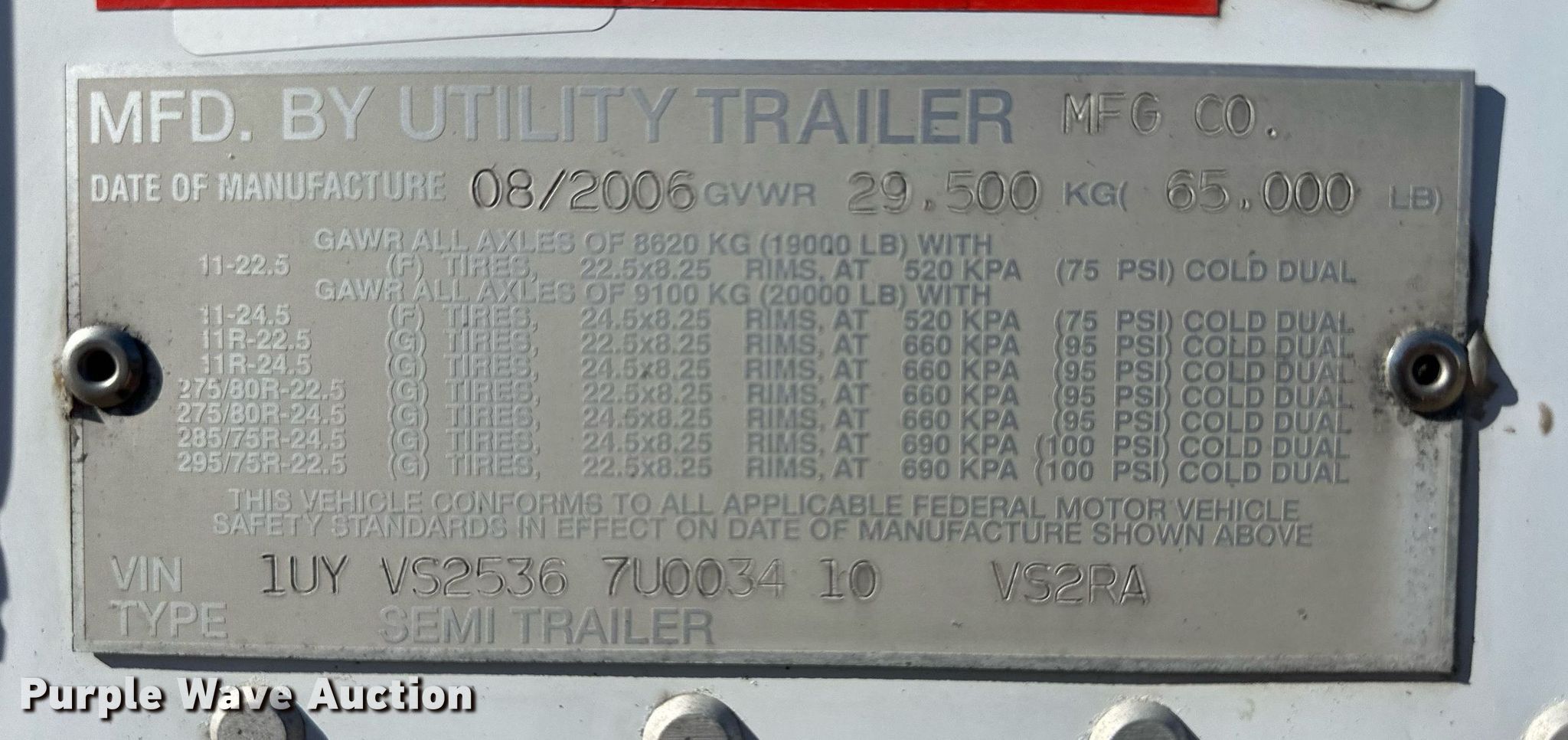2007 Utility VS2RA refrigerated van trailer. VIN: 1UYVS25367U003410. Dimensions Overall: 53' L x 102" W. Features Deck type: Aluminum, Refrigeration unit Thermo King, Hours: 25,550. Chassis Landing gear: Dual, Suspension: Air, Brakes: Air, Axles: Tandem Sliding, GVWR: 65,000 lbs, GAWR: 19,000 lbs. Tires Aluminum wheels, Size: 11R22.5. Kansas title. Title distribution may be delayed up to 14 days from verification of funds. Zeke & Lizzie LLC. Garden City, KS 67846