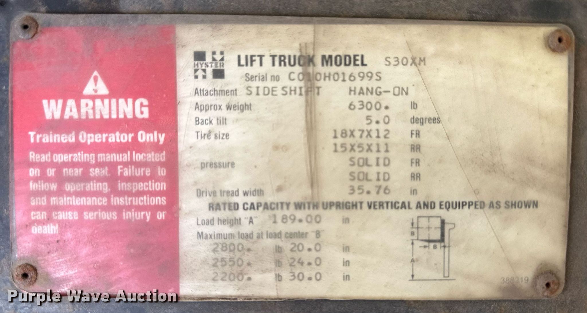 Hyster S30XM forklift. Hours: Unknown, Serial: C010H01699S. Engine Fuel type: LPG LP bottle: Not included. Transmission Hydrostatic. Operators station Canopy. Features Maximum lift capacity: 2,800 lbs, Maximum lift height: 189", Mast stages: 3, Side shift, Mast tilt, Fork length: 42". Tires Front: 18x7x12 1/8, Rear: 15x5x11 1/4, Solid. Notes Possible engine compartment door issue, Engine issues , Non-operational unit. Scheopner's Water. Garden City, KS 67846