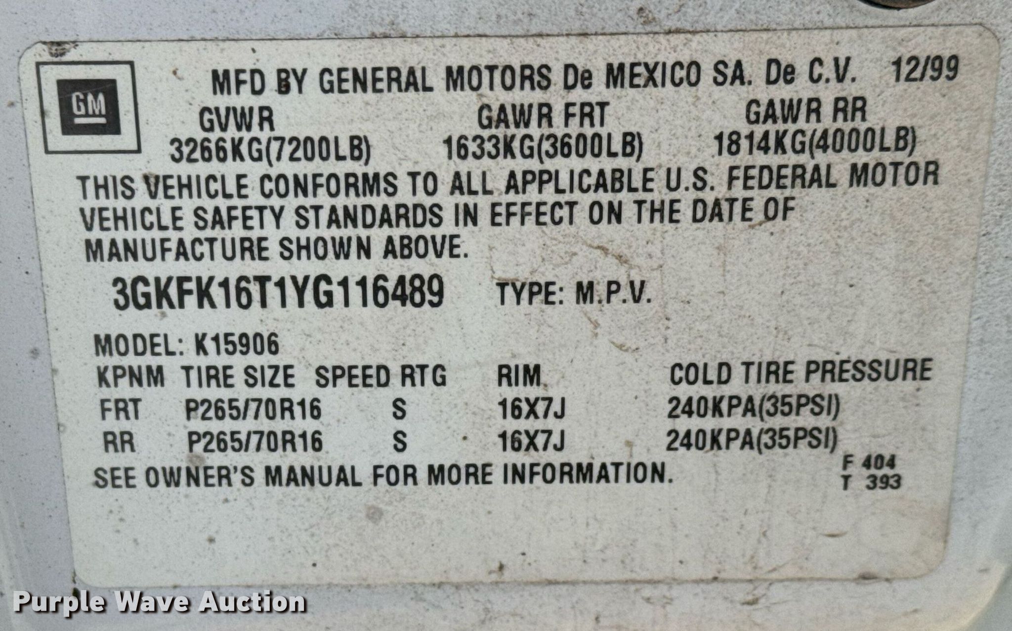 Purple Wave is selling a used Passenger Vehicle in Kansas. This item is a 2000 GMC Yukon XL SUV with the following: Miles: 195,273 on odometer, VIN: 3GKFK16T1YG116489