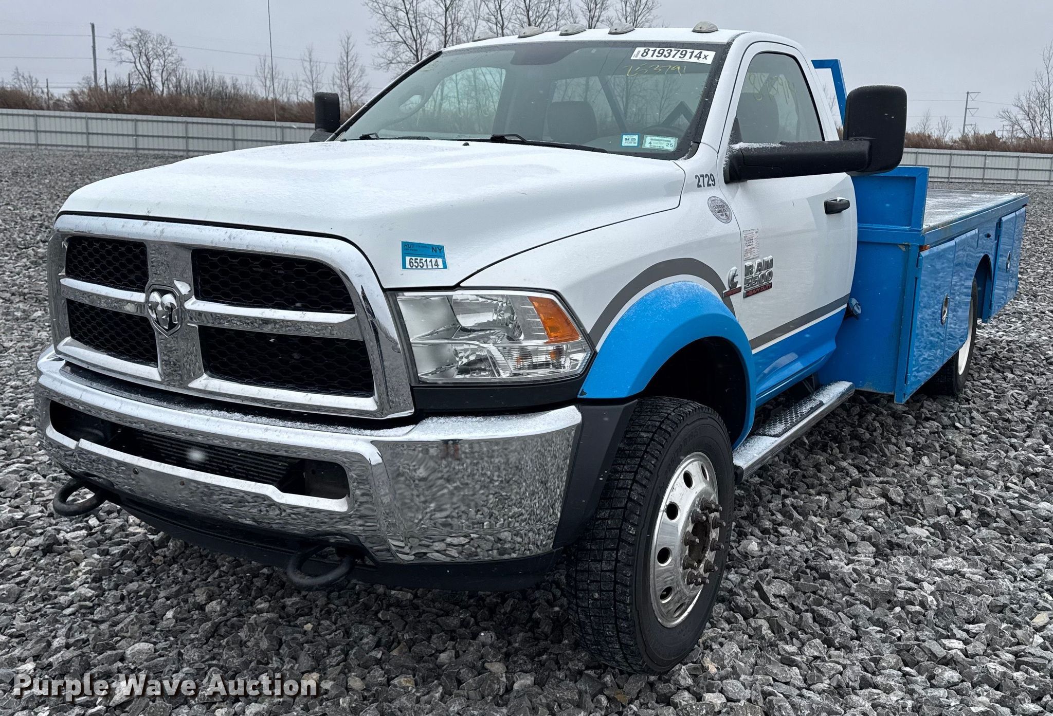 2016 Dodge Ram 5500 flatbed truck. Miles: 270,591 on odometer, VIN: 3C7WRMBL5GG253791, Lot #: 81937914. Engine Displacement: 6.7L, Cylinders: 6, Fuel type: Diesel. Transmission Automatic. Chassis Axles: Single, Suspension: Spring, Brakes: Hydraulic. Interior AC, Heat, Cruise control, Auxiliary controls, Brake controller. Features Flatbed 13' L x 98" W. Tires Size: 225/70R19.5. Notes Dash warning indicator: Check engine. Secured storage hosted by a Copart facility. Please review REQUIRED REMOVAL INSTRUCTIONS. Titles will be distributed after confirmation of payment and removal. New York title. Title distribution may be delayed up to 30 days from verification of funds. Alden, NY 14004