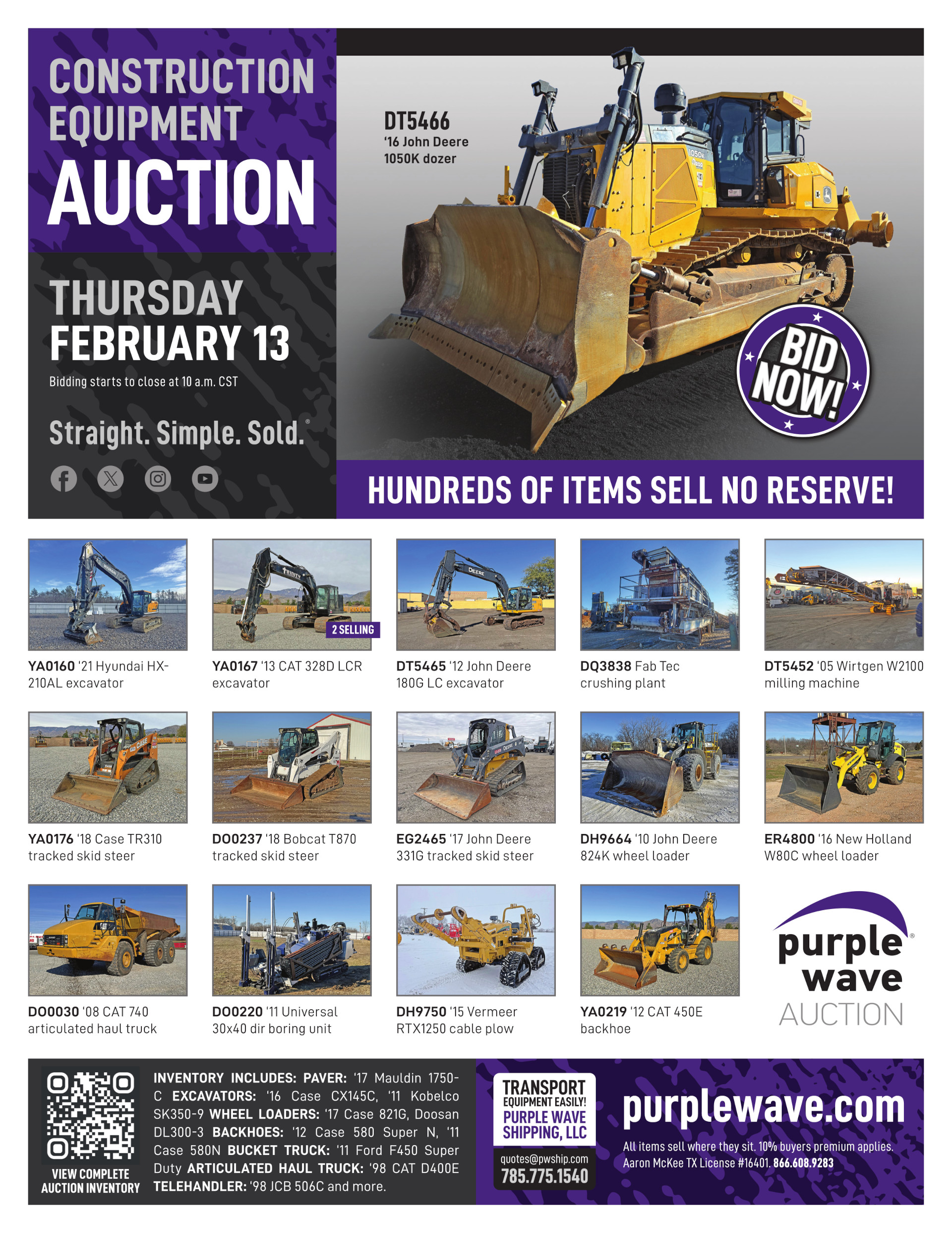 Purple Wave Shipping, LLC provides shipping and transportation services to winning bidders on ag, construction and fleet type assets. Purple Wave Shipping, LLC does not provide shipping on items weighing less than 1,000 pounds.