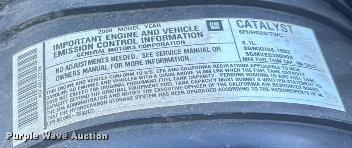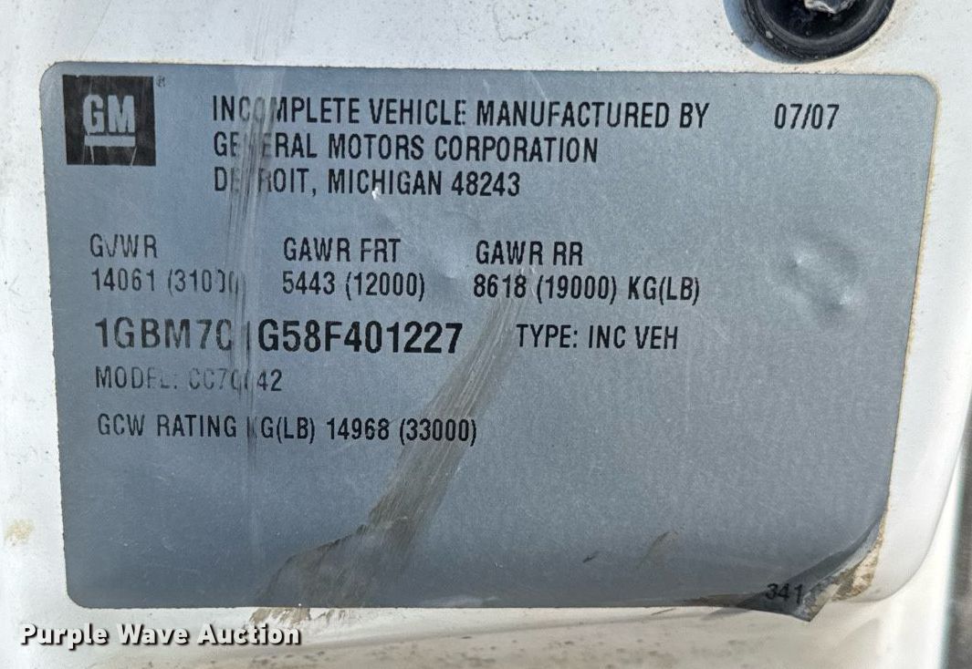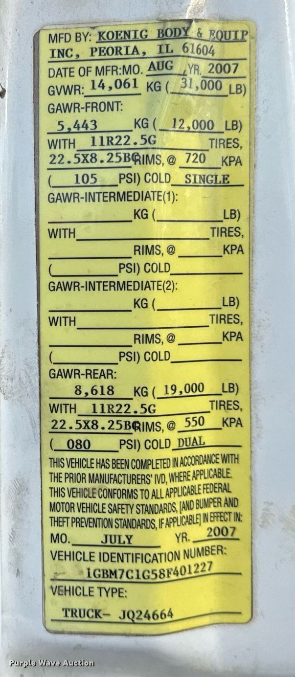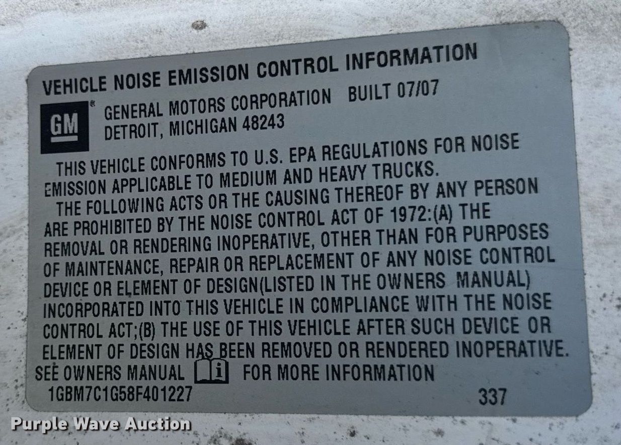 2008 Chevrolet C7500 dump truck. Miles: 202,425 on odometer, VIN: 1GBM7C1G58F401227. Engine Displacement: 8.1L, Fuel type: Gas. Transmission Automatic. Chassis Axles: Single, Suspension: Spring, Brakes: Air, PTO, GVWR: 31,000 lbs FAWR: 12,000 lbs, RAWR: 19,000 lbs. Interior AC, Heat. Features Dump bed Rugby, 16' L x 96" W, Side height: 20", Bed type: Steel, Ram: Single. Tires Size: 11R22.5. Notes Coolant leak, Non-operational unit Unit must be towed or hauled. Illinois title. Hein Construction. Brimfield, IL 61517