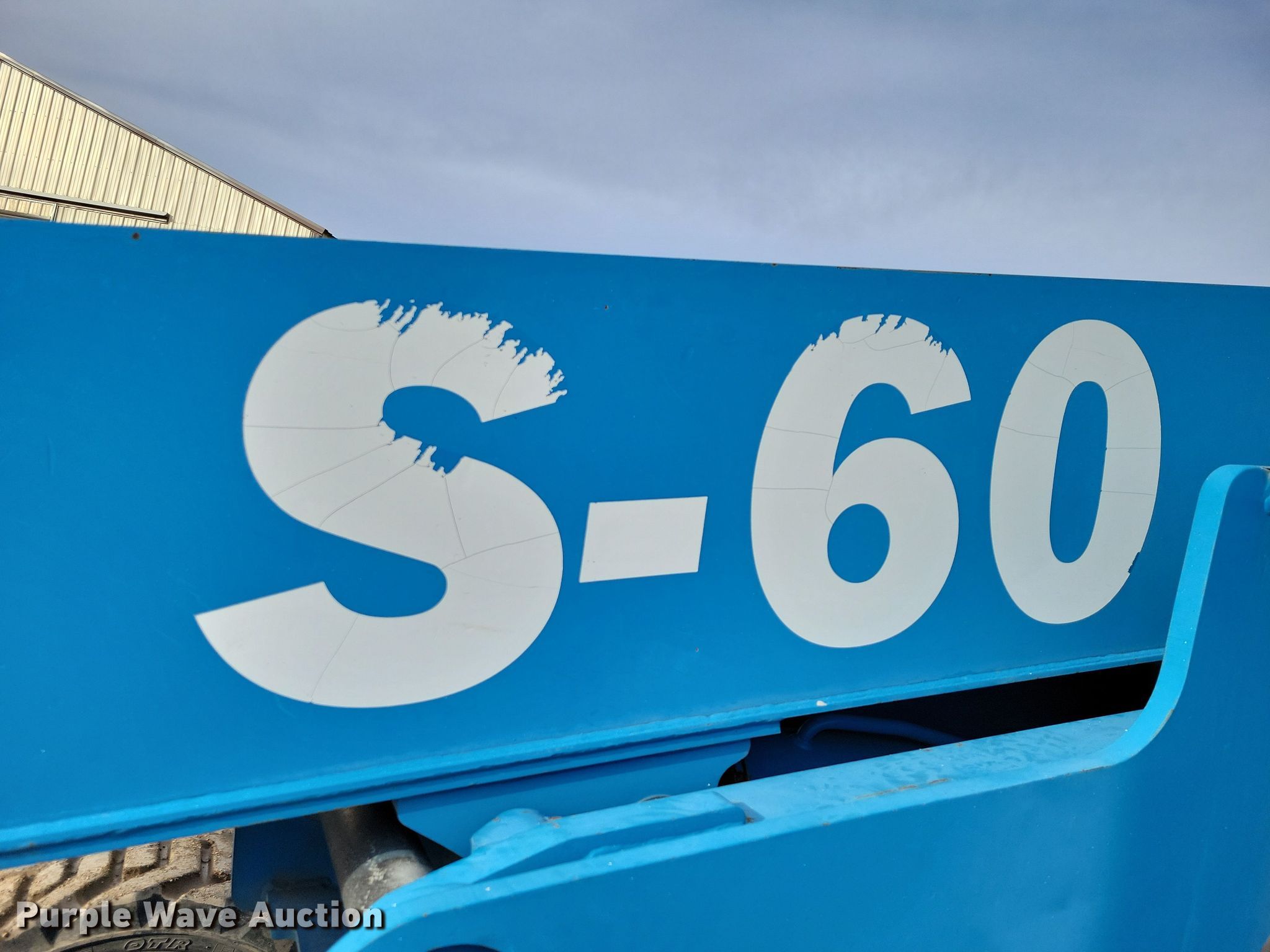 2006 Genie S-60 boom lift. Hours: 2,278 on meter, Serial: S6006-13263. Engine Deutz F3L 2011, Serial: 47412L016, Displacement: 2.332L, Cylinders: 3, Fuel type: Diesel, kW: 35.8. Chassis Four wheel drive. Features Rough terrain, Boom type: Telescopic, Maximum lift capacity: 500 lbs, Maximum reach length: 50' 4", Maximum lift height: 60' 2", Hydraulic leveling, Platform: 93" L x 34" W, AC power outlet, Controls: Platform, Ground, Platform rotation: Hydraulic. Tires Tire size: 355/55D625, Foam filled. View repairs. Mitchell, SD 57301