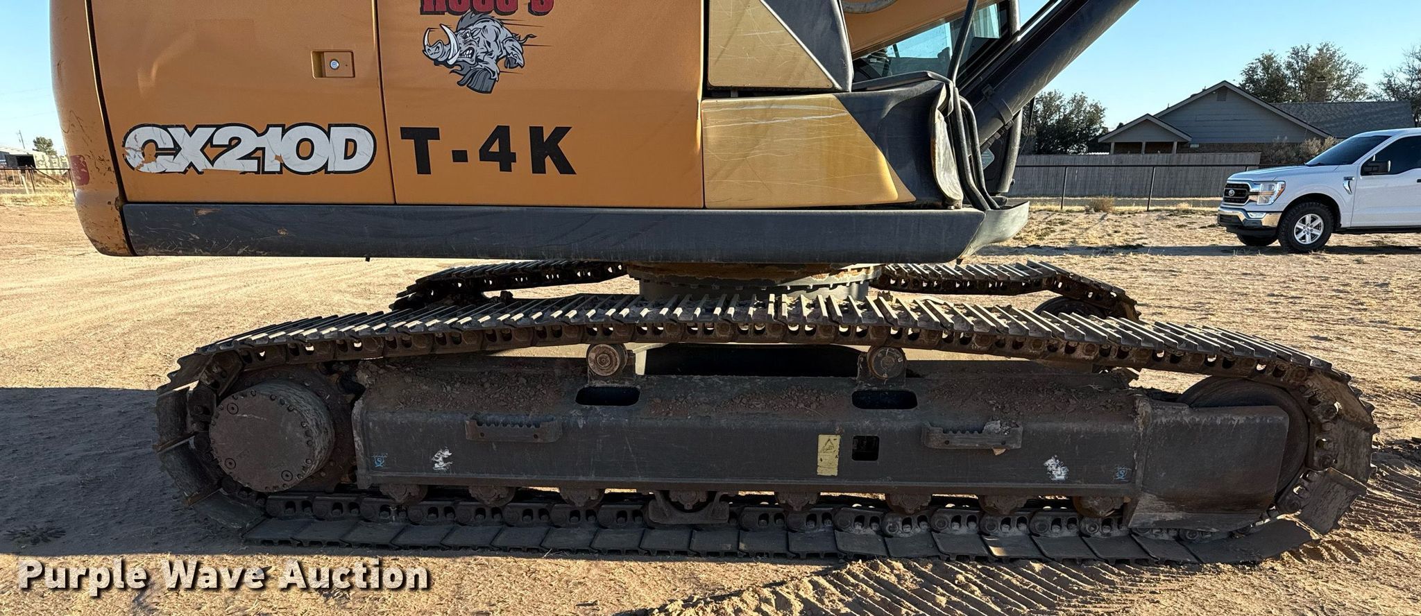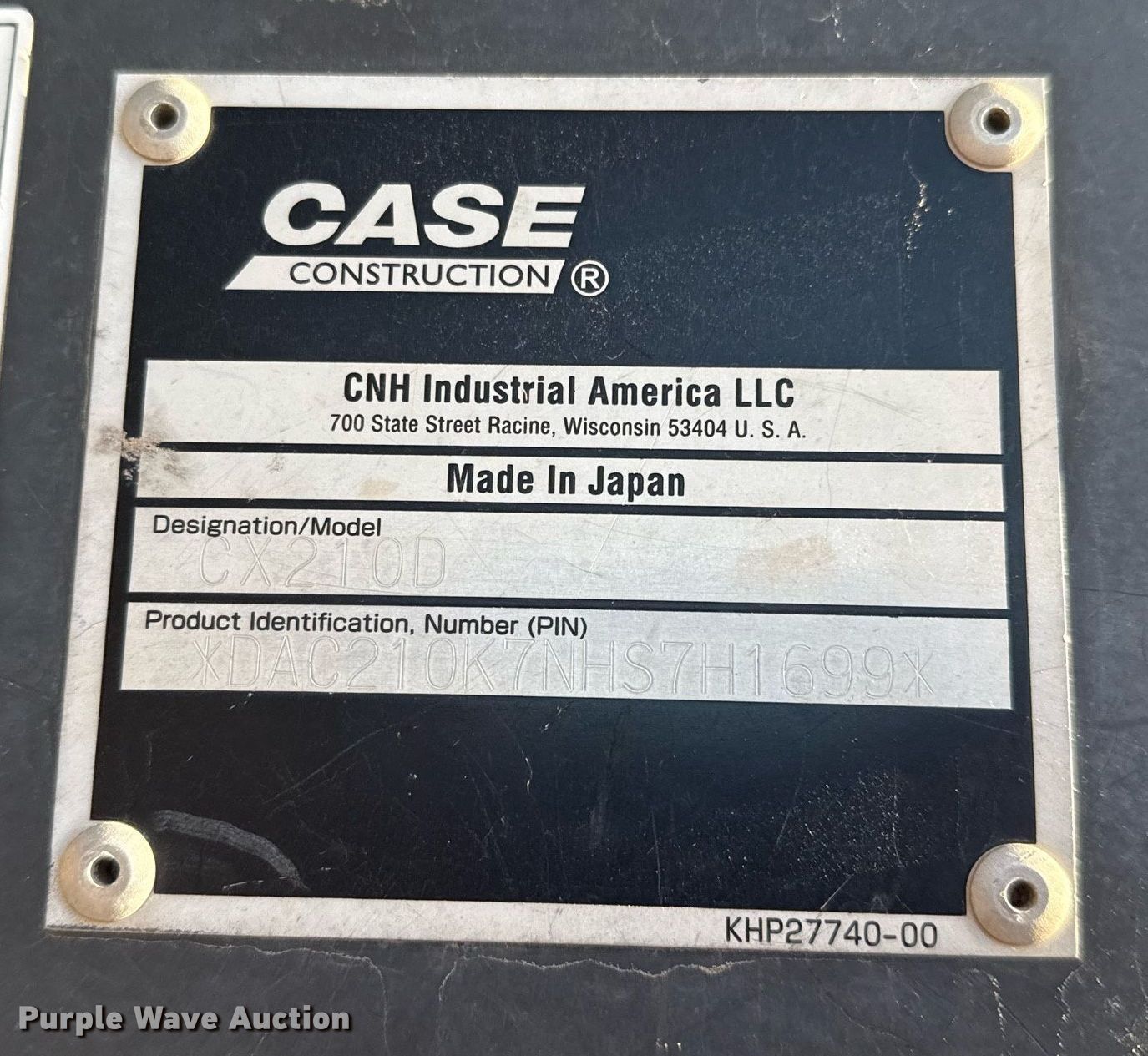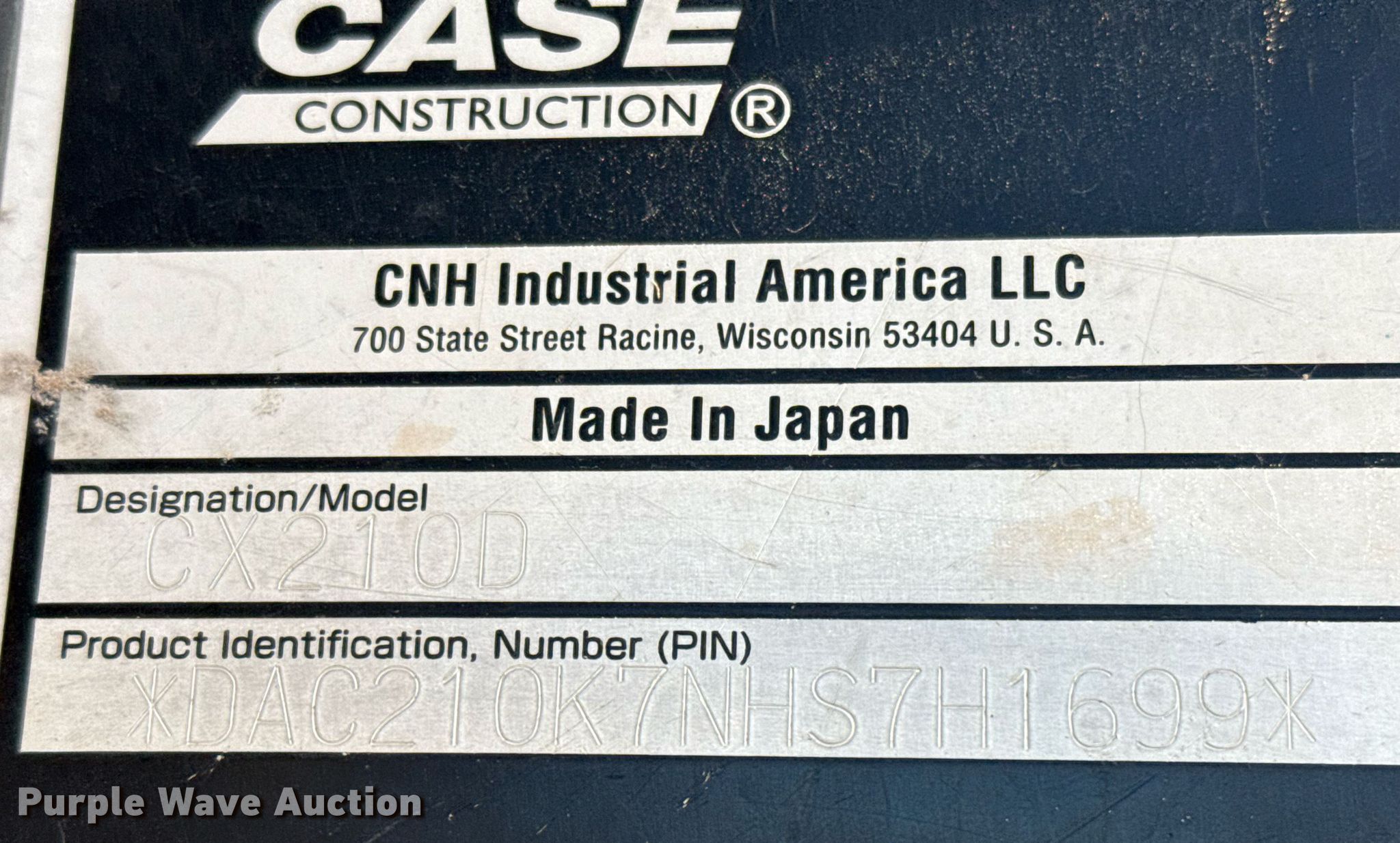2017 Case CX210D excavator. Hours: 6,761 on meter, Serial: DAC210K7NHS7H1699. Engine Isuzu AR-4HK1X, Displacement: 5.193L, Cylinders: 4, Fuel type: Diesel, kW: 124. Transmission Hydrostatic, Two speed travel. Operators station Enclosed cab, AC, Heat, Backup camera, Pattern changer. Features Auxiliary hydraulics, Boom Standard, Stick Stick length: 9' 8", Bucket Width: 36", Teeth: 5. Tracks Width: 25", Steel, Grouser pads: Triple. Notes Warning indicator: Check engine. Midland, TX 79707
