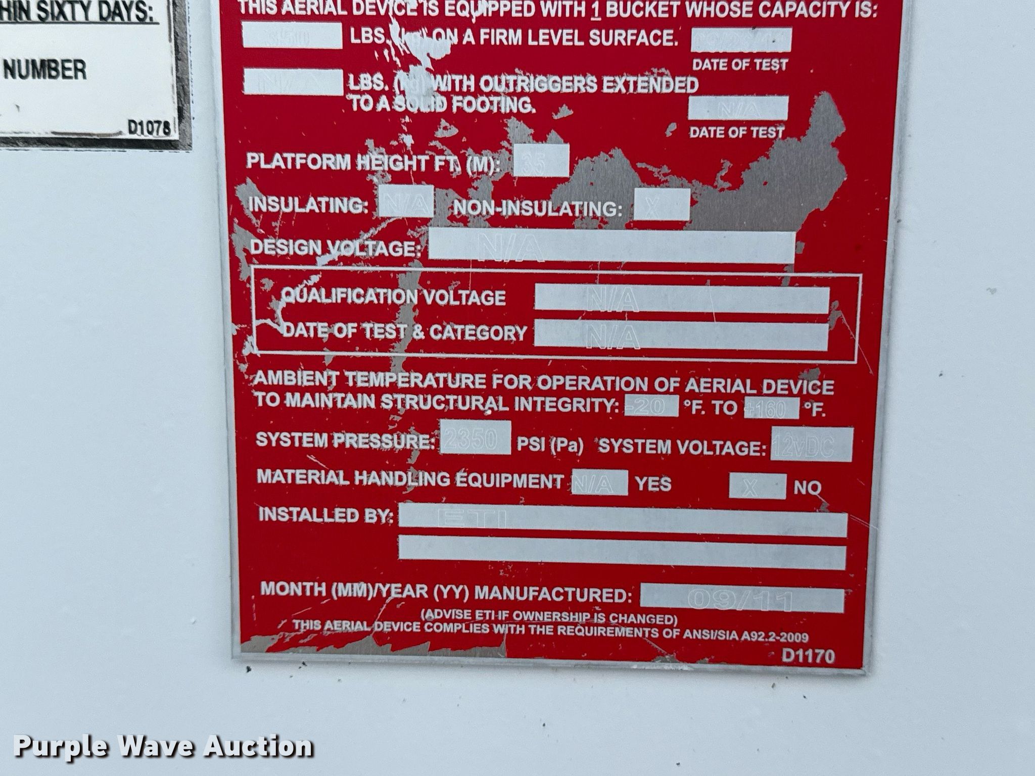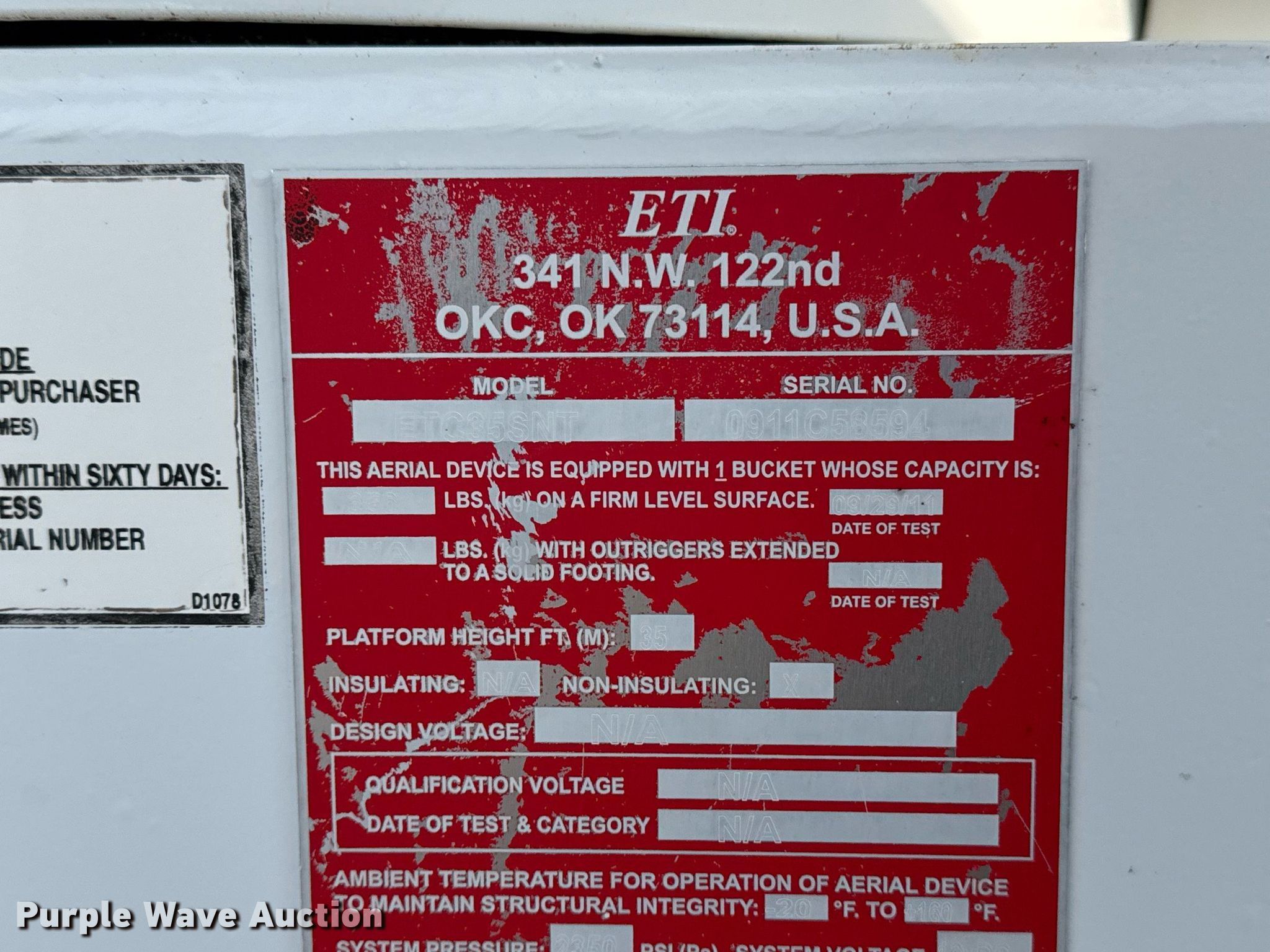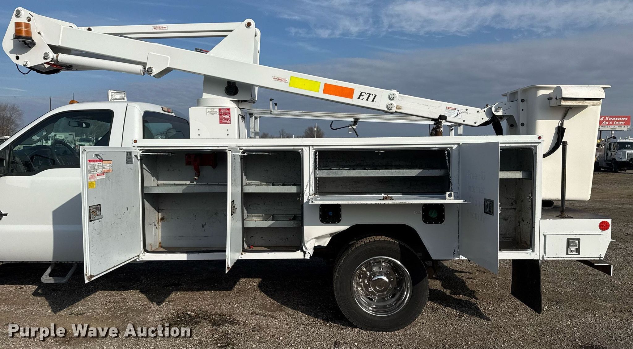 2011 Ford F450 Super Duty bucket truck. Miles: 166,979 on odometer, VIN: 1FDUF4HT8BED09853. Engine Displacement: 6.7L, Cylinders: 8, Fuel type: Diesel. Transmission Automatic. Chassis Four wheel drive, Axles: Single, Suspension: Spring, Brakes: Hydraulic, PTO, GVWR: 16,500 lbs, Wheelbase: 165". Interior AC, Heat, Heated mirrors, Power windows, Power locks, Cruise control, Auxiliary controls. Features Bed ETI SB132DD96B24N, Serial: 13758, 11' L x 96" W, Boom 2011 ETI ETC35SNT, Serial: 0911C58594, Maximum lift capacity: 350 lbs, Maximum lift height: 35', Boom type: Articulating, Telescopic, Man basket, Boom controls Platform/ basket.. Tires Size: 225/70R19.5. Notes Windshield chipped or cracked, Rust damage. Oklahoma title. Seller is an Oklahoma licensed motor vehicle dealer. Title will be assigned and distributed by the dealer. Please contact the seller for distribution questions. Title distribution may be delayed up to 30 days from verification of funds. Collinsville, OK 74021