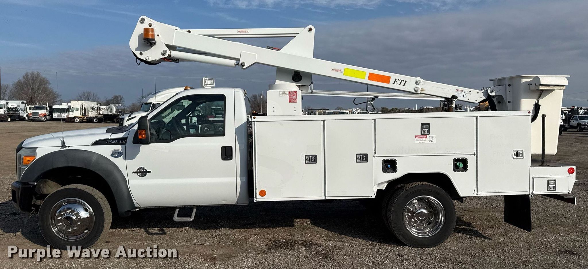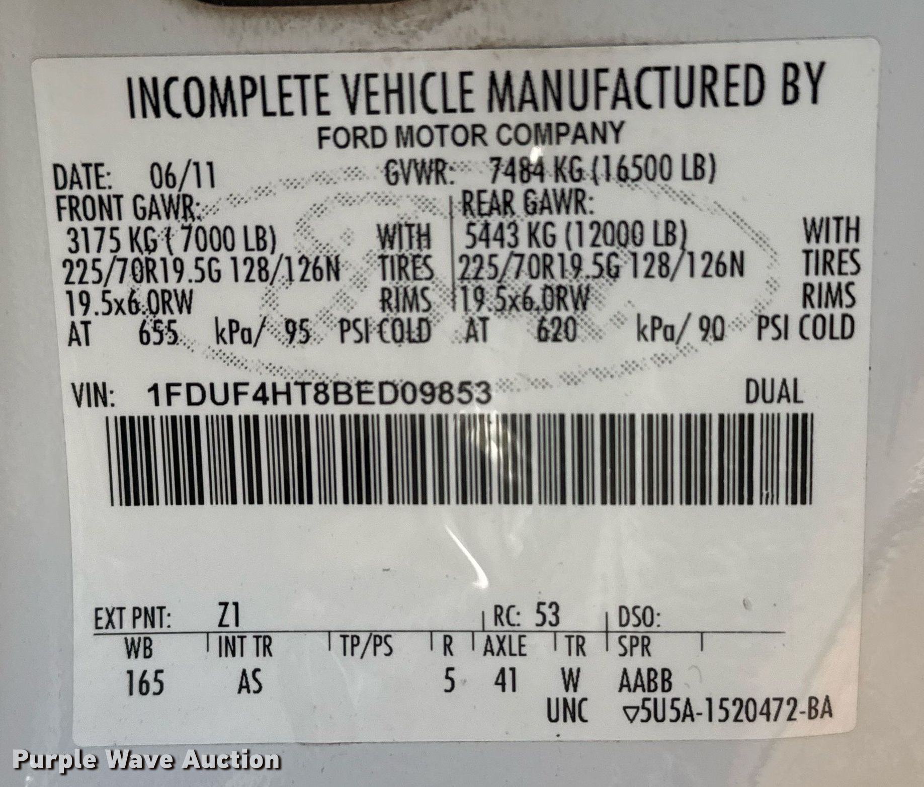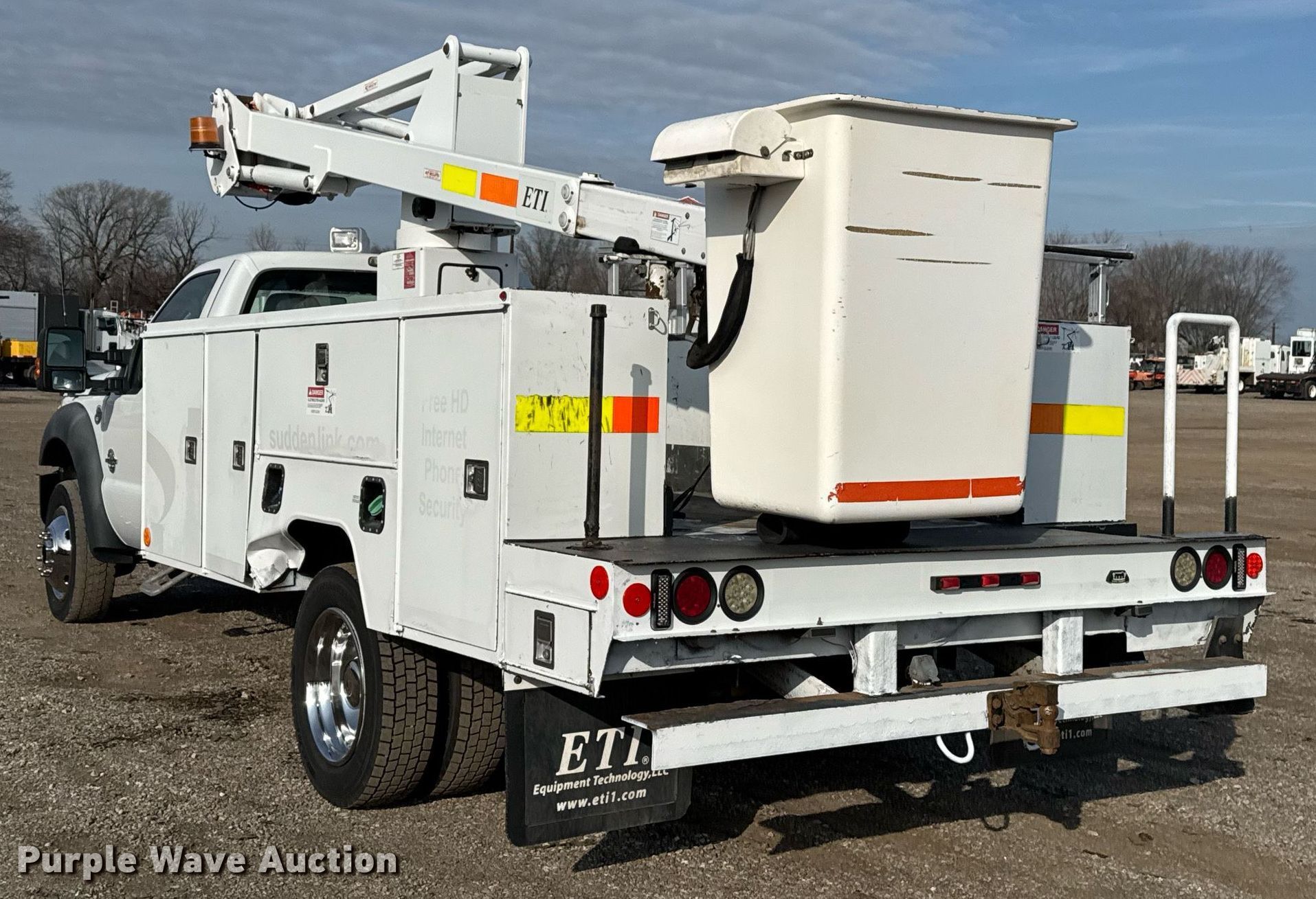 2011 Ford F450 Super Duty bucket truck. Miles: 166,979 on odometer, VIN: 1FDUF4HT8BED09853. Engine Displacement: 6.7L, Cylinders: 8, Fuel type: Diesel. Transmission Automatic. Chassis Four wheel drive, Axles: Single, Suspension: Spring, Brakes: Hydraulic, PTO, GVWR: 16,500 lbs, Wheelbase: 165". Interior AC, Heat, Heated mirrors, Power windows, Power locks, Cruise control, Auxiliary controls. Features Bed ETI SB132DD96B24N, Serial: 13758, 11' L x 96" W, Boom 2011 ETI ETC35SNT, Serial: 0911C58594, Maximum lift capacity: 350 lbs, Maximum lift height: 35', Boom type: Articulating, Telescopic, Man basket, Boom controls Platform/ basket.. Tires Size: 225/70R19.5. Notes Windshield chipped or cracked, Rust damage. Oklahoma title. Seller is an Oklahoma licensed motor vehicle dealer. Title will be assigned and distributed by the dealer. Please contact the seller for distribution questions. Title distribution may be delayed up to 30 days from verification of funds. Collinsville, OK 74021