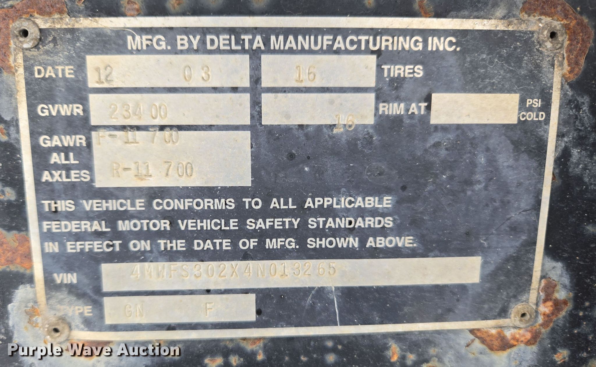Purple Wave is selling a used Equip. Trailer in Montana. This item is a 2004 Delta Manufacturing Inc. equipment trailer with the following: VIN: 4MWFS302X4N013265