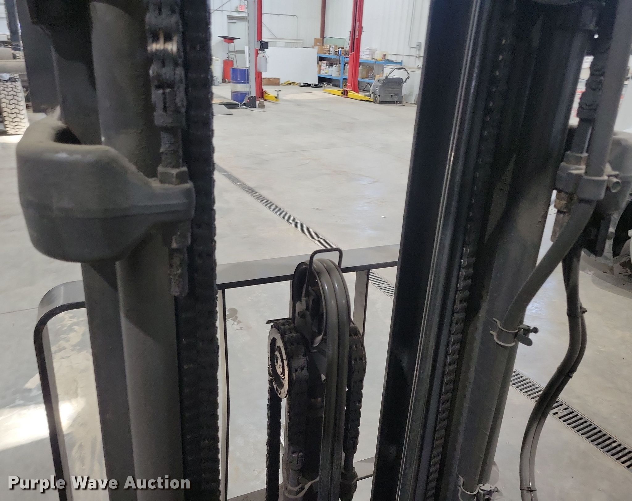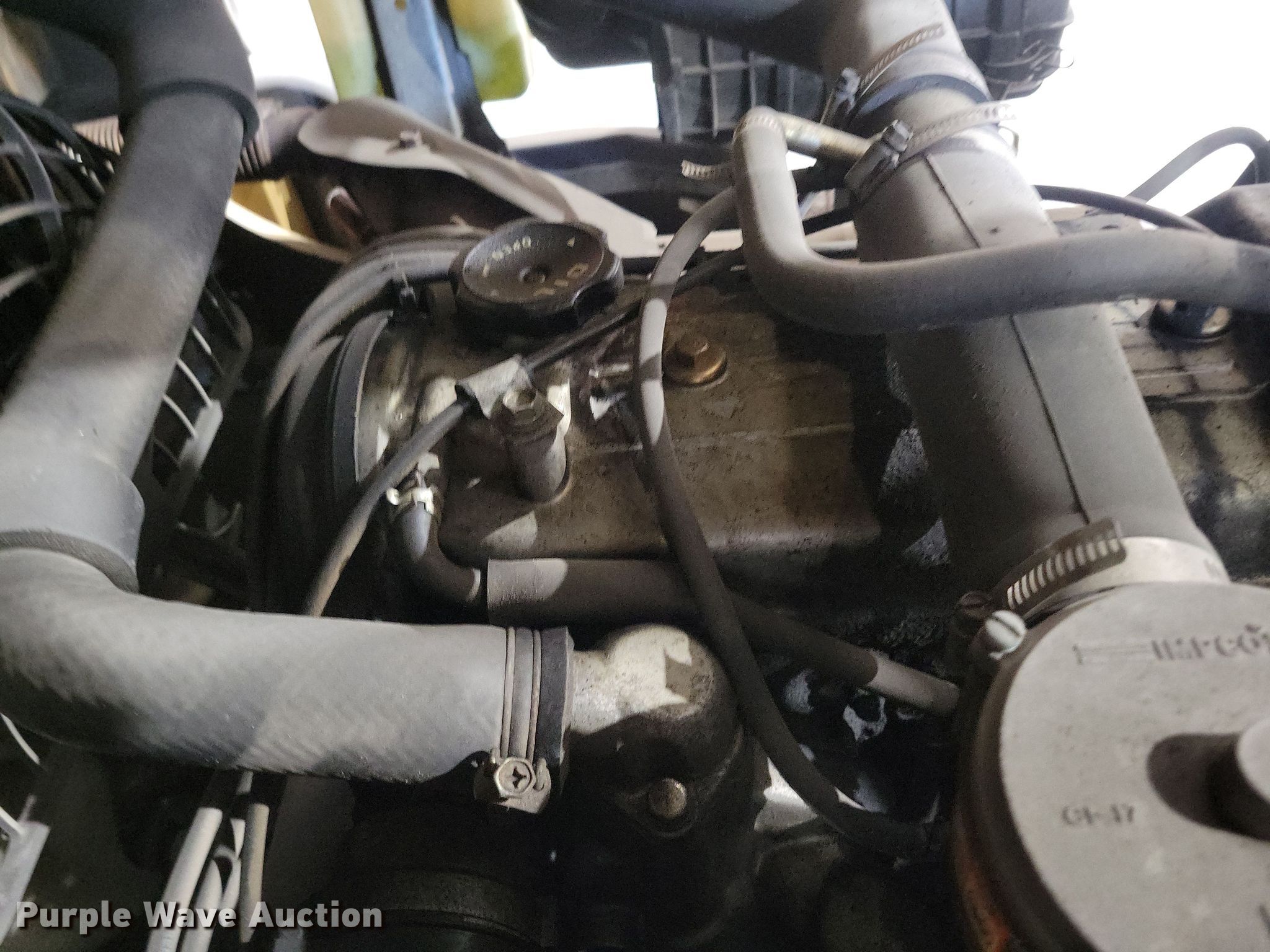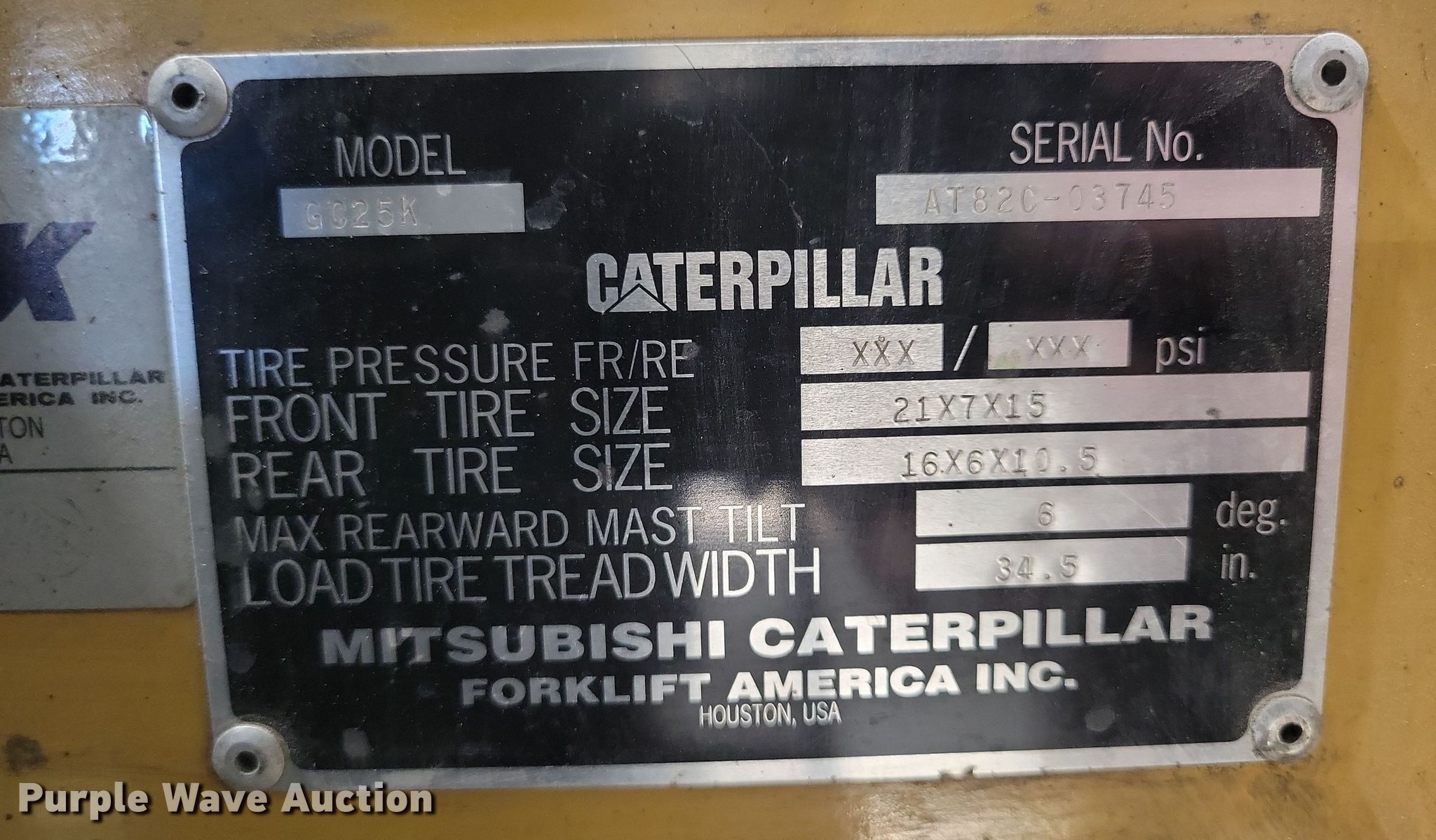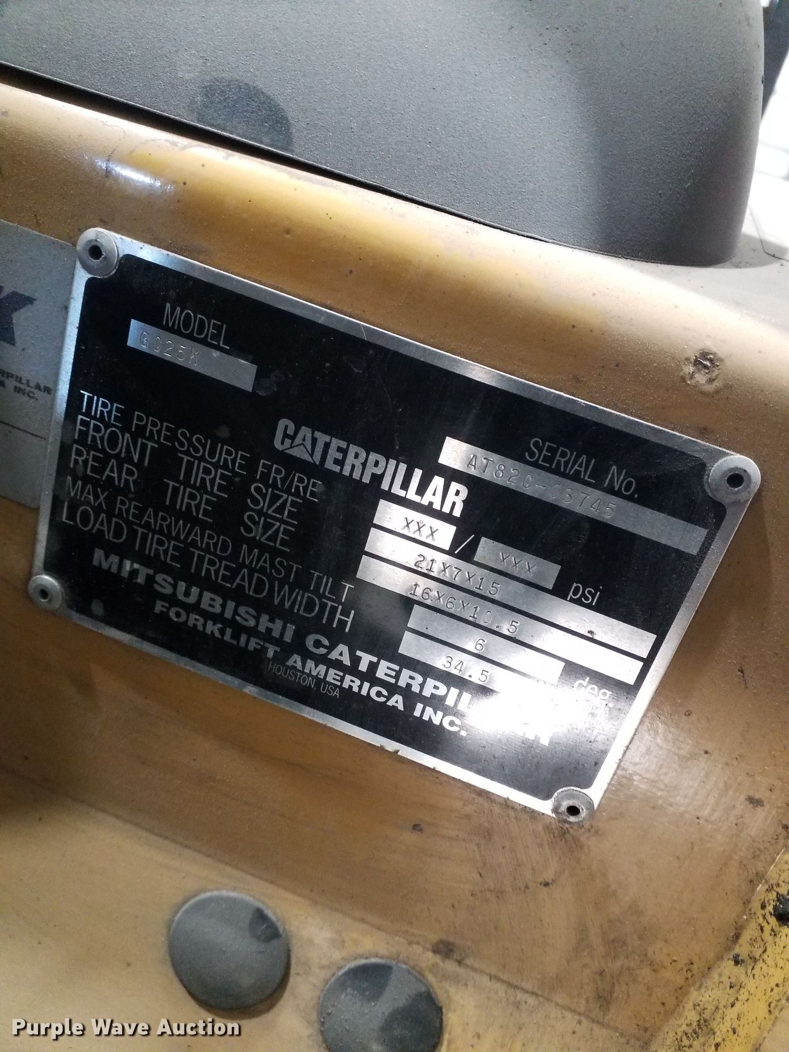 2000 Caterpillar GC25K forklift. Hours: 6,992 on meter, Serial: AT82C-03745. Engine Cylinders: 4, Fuel type: LPG LP bottle: Included. Transmission Powershift. Operators station OROPS. Features Maximum lift capacity: 4,700 lbs, Maximum lift height: 188", Mast stages: 3, Side shift, Mast tilt, Fork length: 42". Tires Front: 21X7X15, Rear: 16X6X10½, Solid. Notes Fork damaged, will be replaced prior to auction. Rosen's Inc. Fairmont, MN 56031
