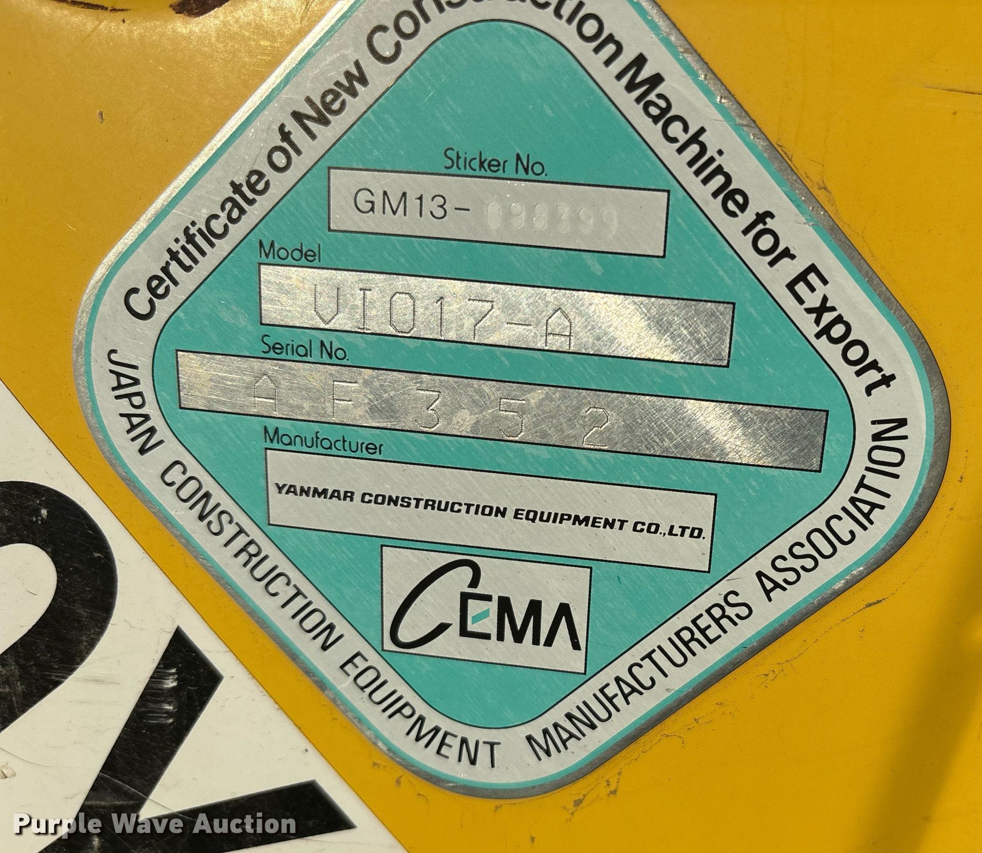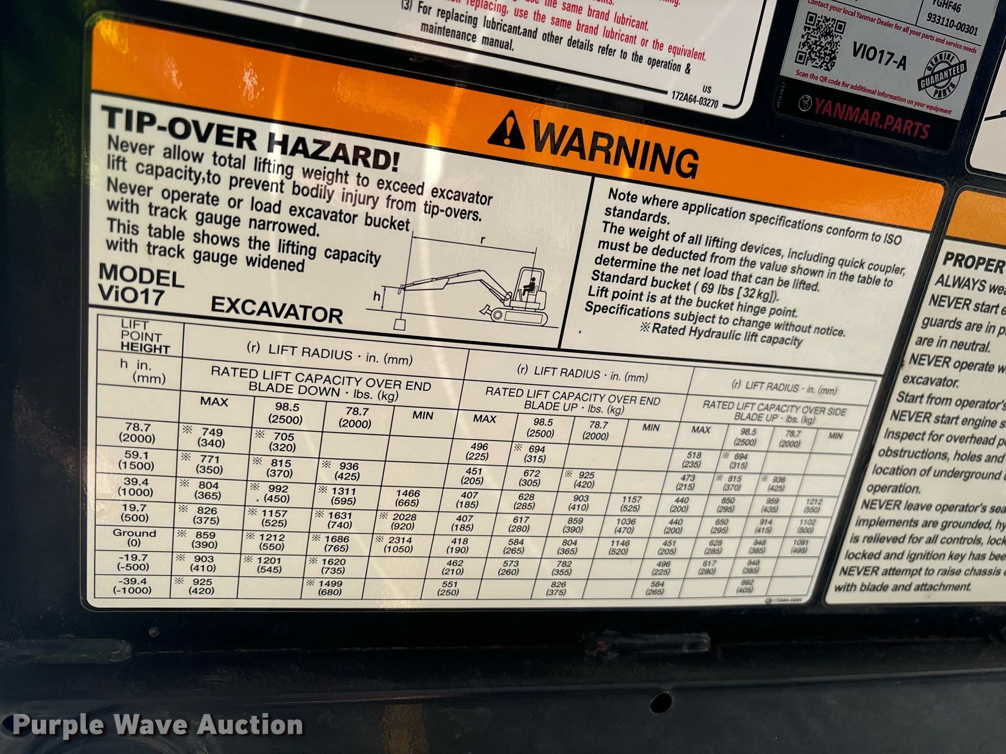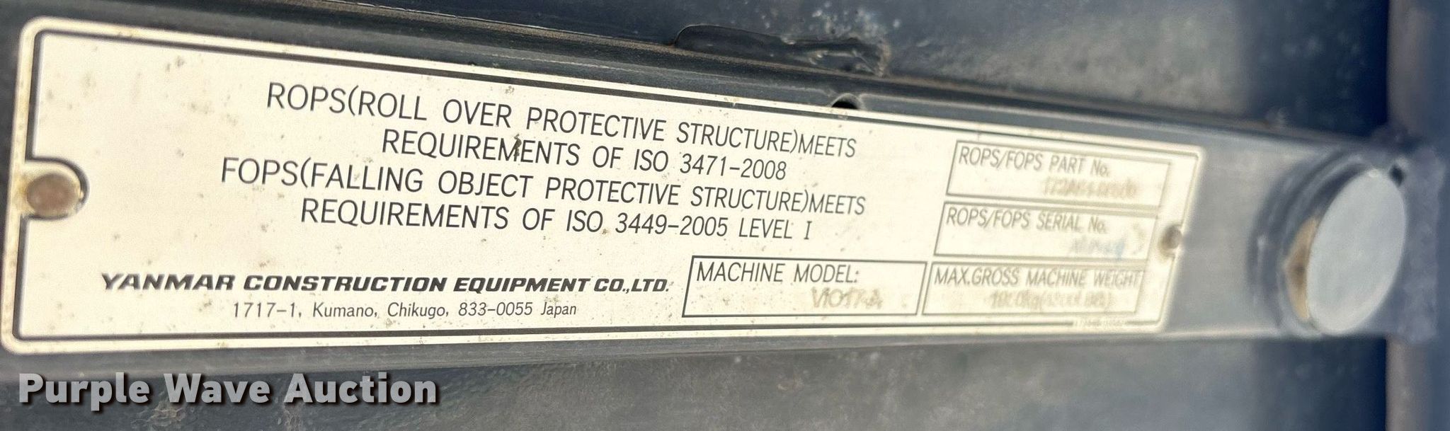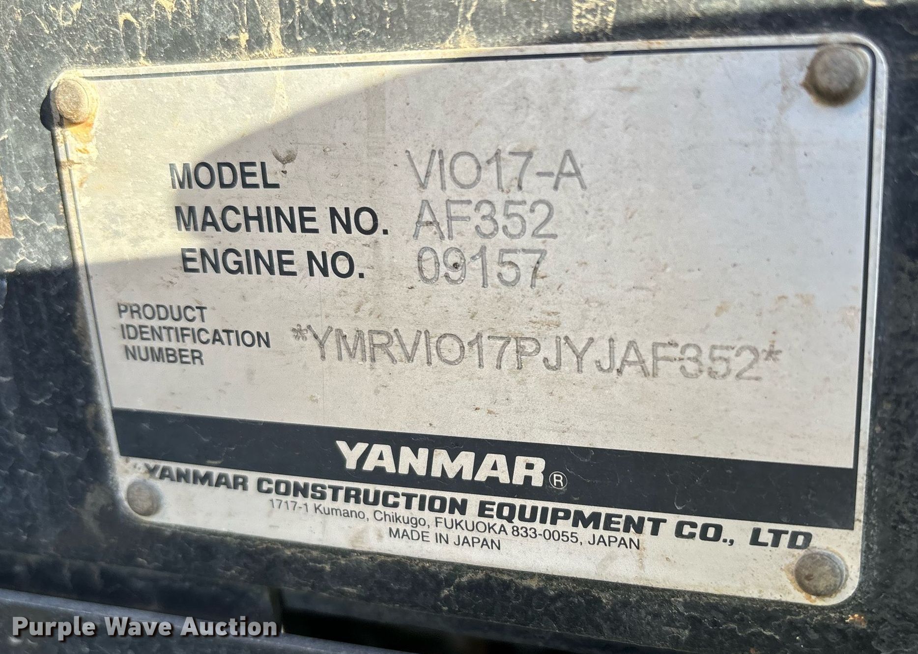 2018 Yanmar VIO17-A mini excavator. Hours: 1,201 on meter, Serial: YMRVIO17PJYJAF352, Lot #: 84279094. Engine Yanmar, Displacement:.993L, Fuel type: Diesel. Transmission Hydrostatic. Operators station OROPS. Features Auxiliary hydraulics Standard, Backfill blade Width: 50", Boom Swing, Stick Stick length: 36", Bucket Width: 12", Teeth: 3. Tracks Width: 9", Tracks: Rubber. Secured storage hosted by a Copart facility. Please review REQUIRED REMOVAL INSTRUCTIONS. Trinity Equipment Rentals Inc.. Mentone, CA 92359