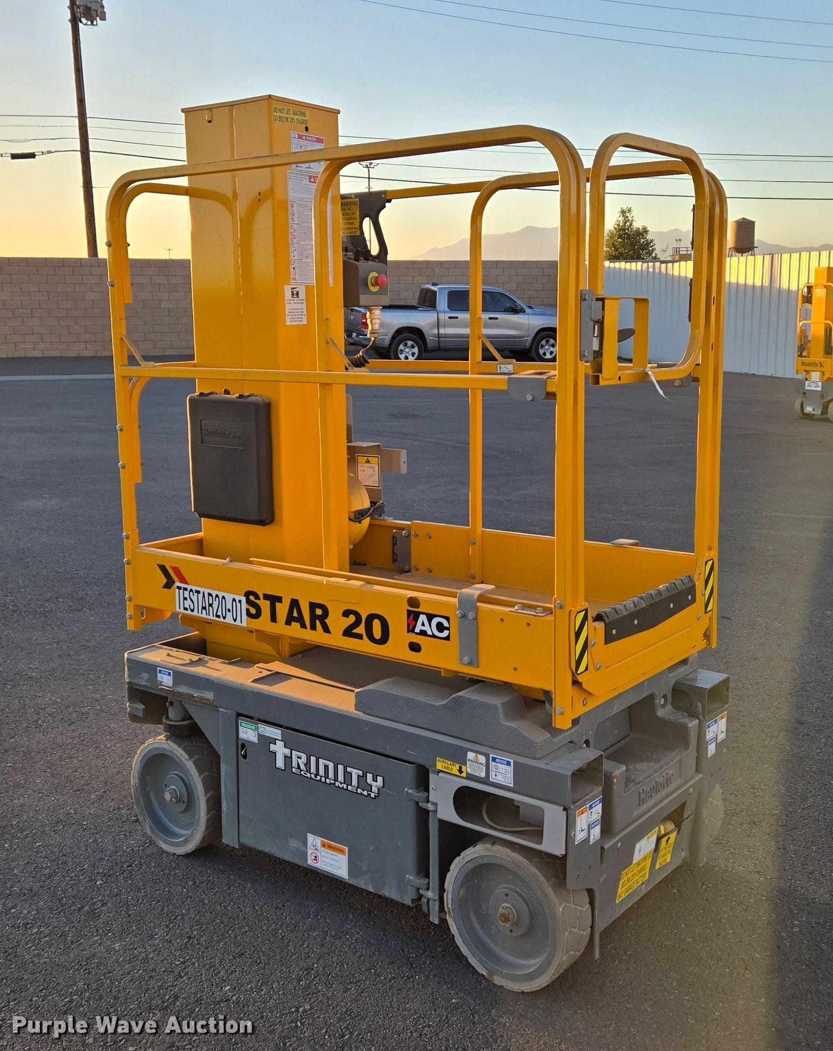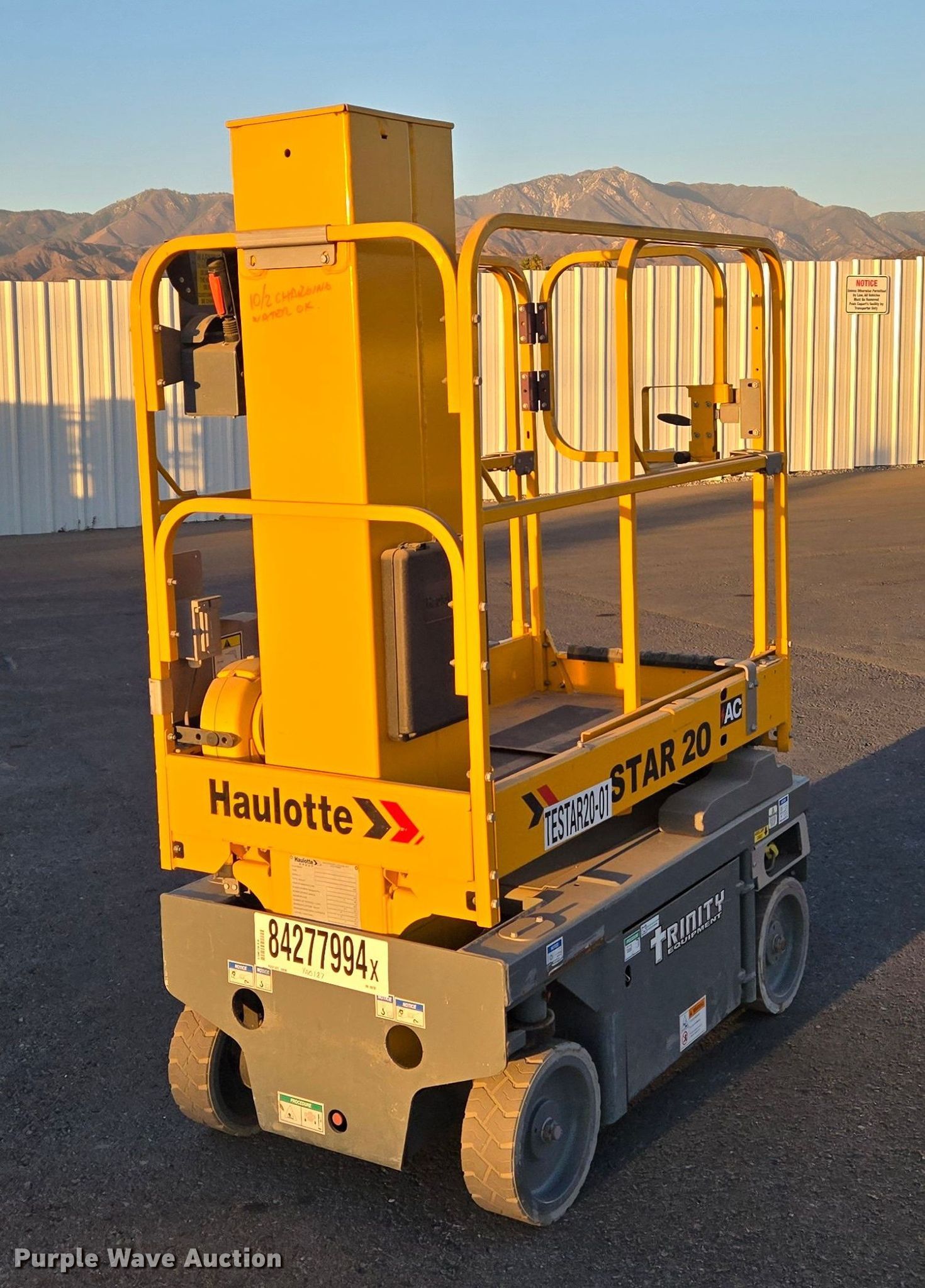 2019 Haulotte Star 20 AC E vertical lift. Hours: Unknown, Serial: 2050700, Unit #: TESTAR20-01, Lot #: 84277994. Electric Motor kW: 2.5, Volts: 24. Features Maximum lift capacity: 440 lbs, Maximum lift height: 19' 6", Platform: 54" L x 29" W, AC power outlet, Controls: Remote Control, Ground, Platform extensions: Manual. Tires Tire size: 12.5x4.25, Solid. Secured storage hosted by a Copart facility. Please review REQUIRED REMOVAL INSTRUCTIONS. Trinity Equipment Rentals Inc.. Mentone, CA 92359